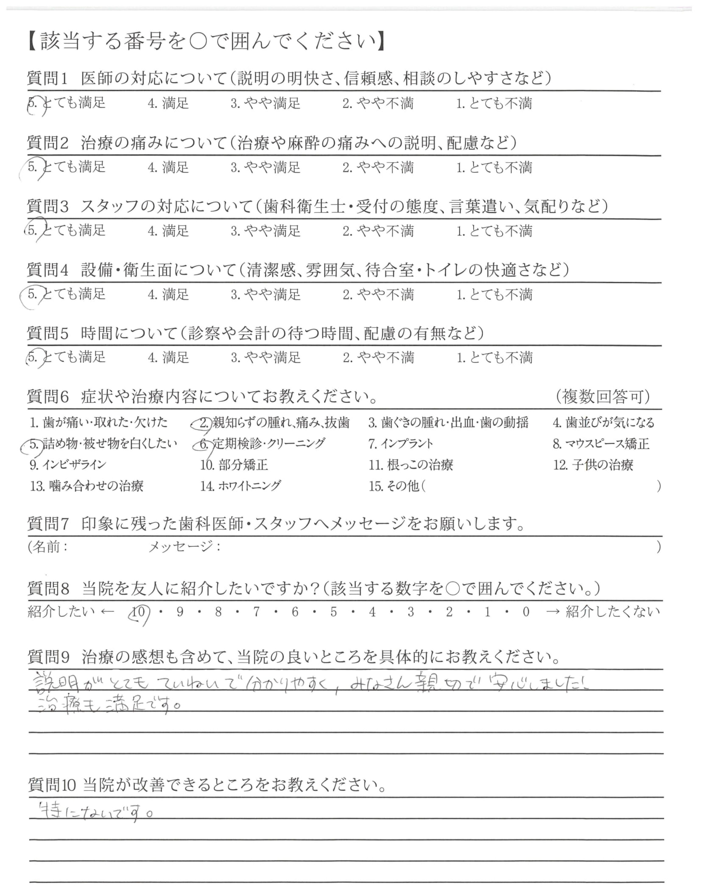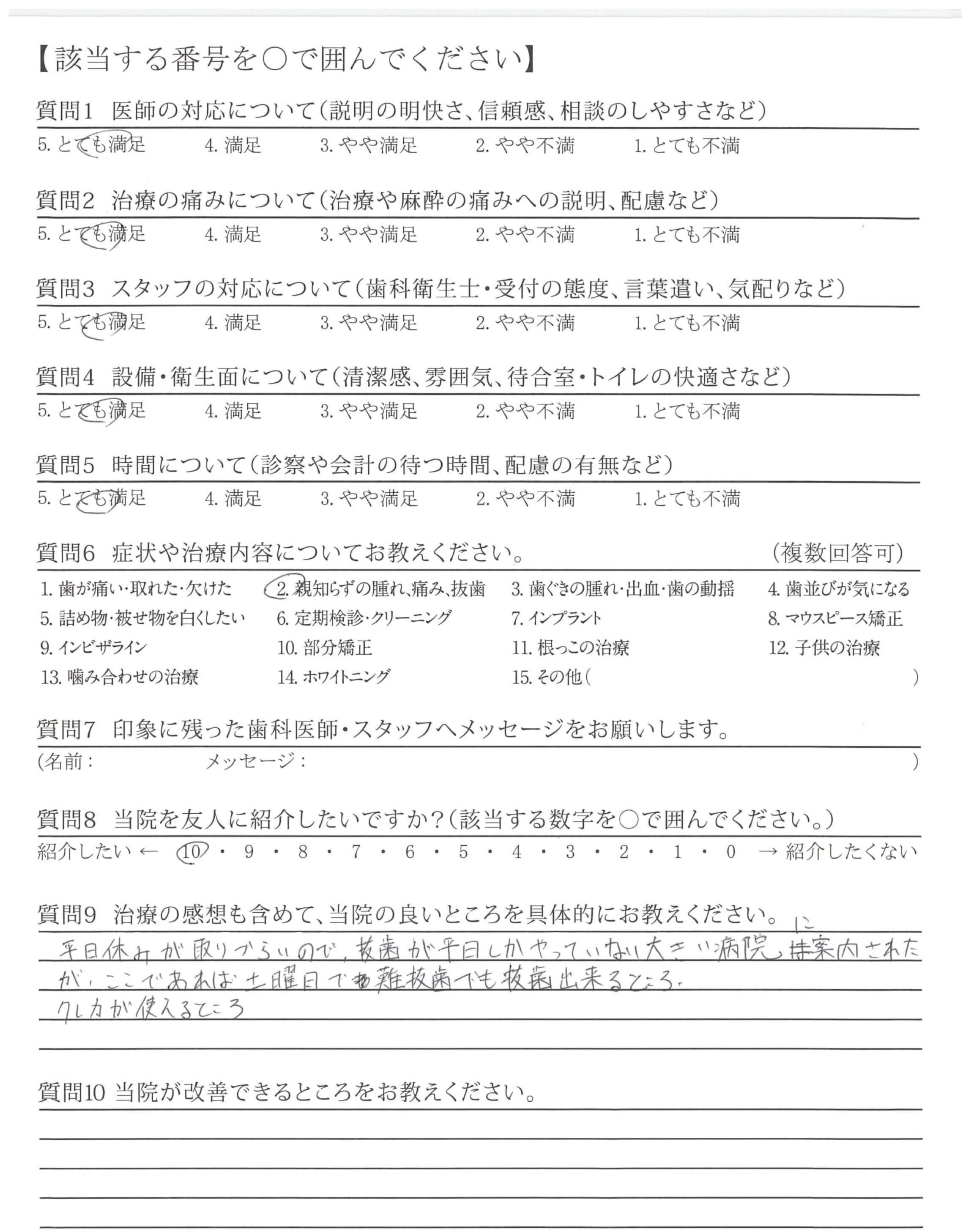 親知らずを抜くのが初めてだったのですが、丁寧に説明をしていただき、安心して治療を受けることができました。