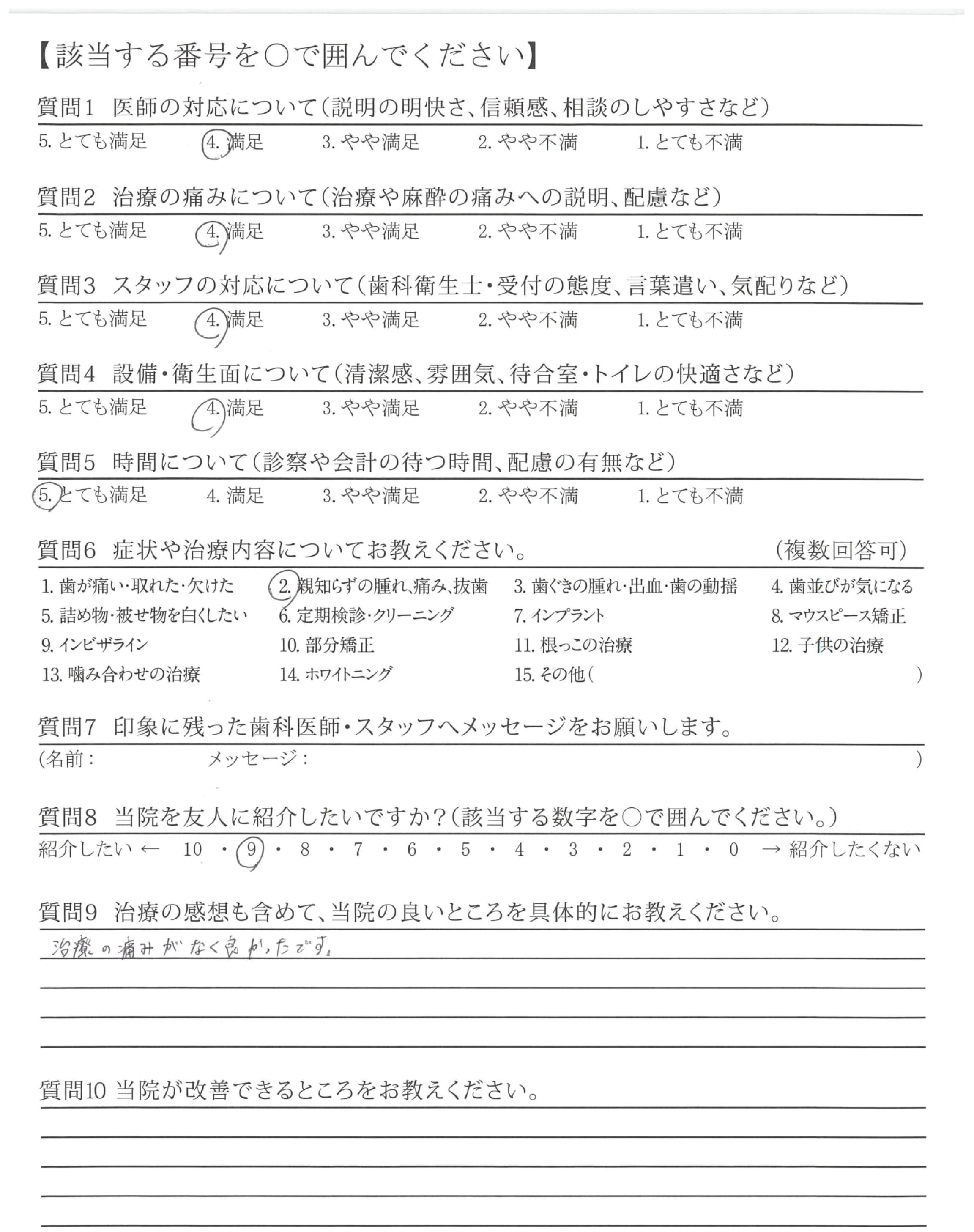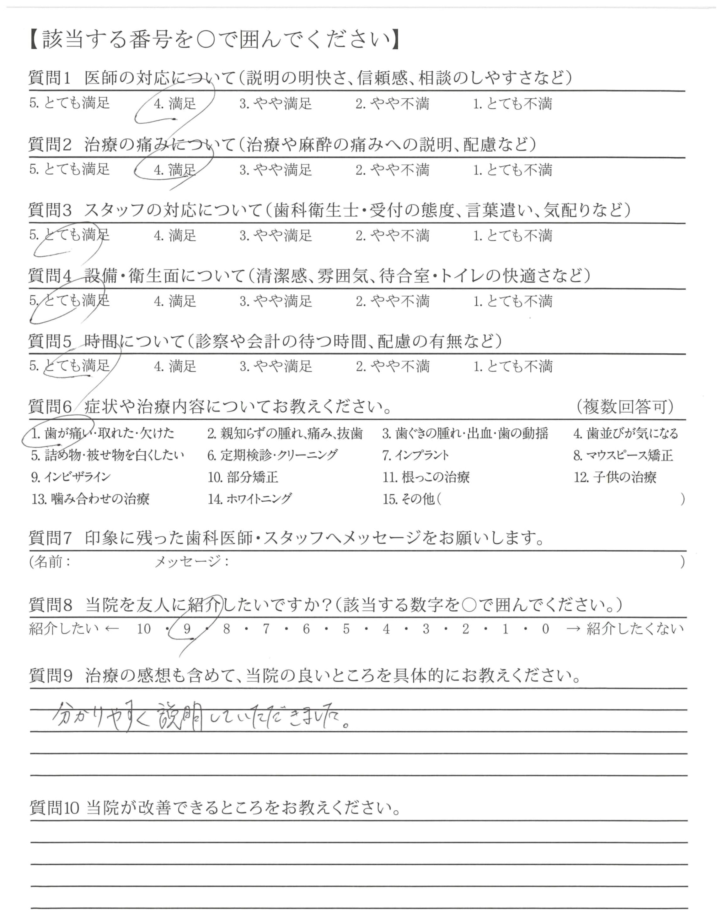 不安になる程治療が早く(親知らずの抜歯・被せ物を新しくする)他院で面倒がられていたので良い意味で戸惑いが大きかったです。