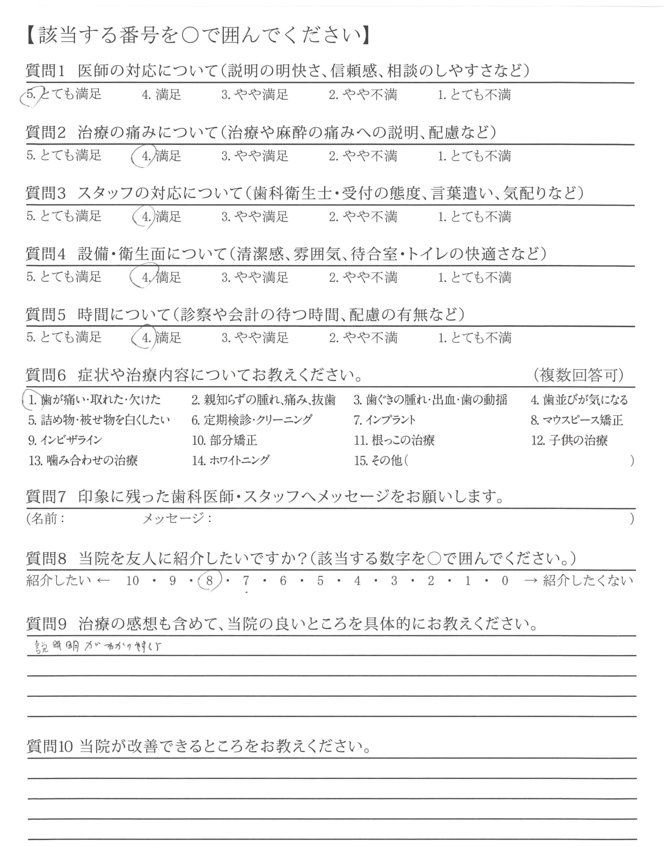 治療の痛みも少なく、歯科医師さんも信頼できた。