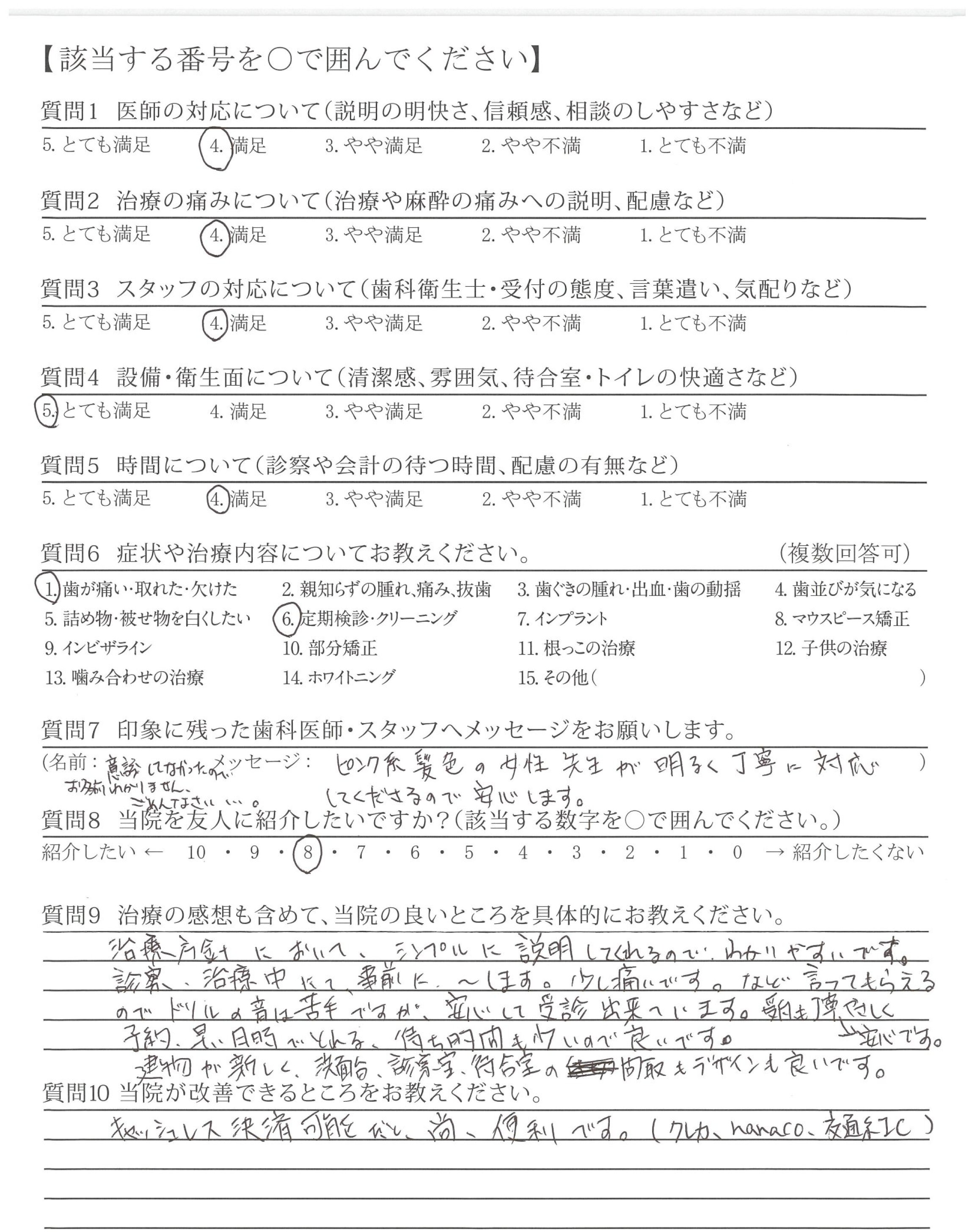 20年以上前に治療した奥歯の詰め物が取れた為、受診しました。早くに診ていただけたこと、先生の説明もわかりやすく、こちらの希望にも応じていただき、短期間で治療していただけて、とても満足しています。