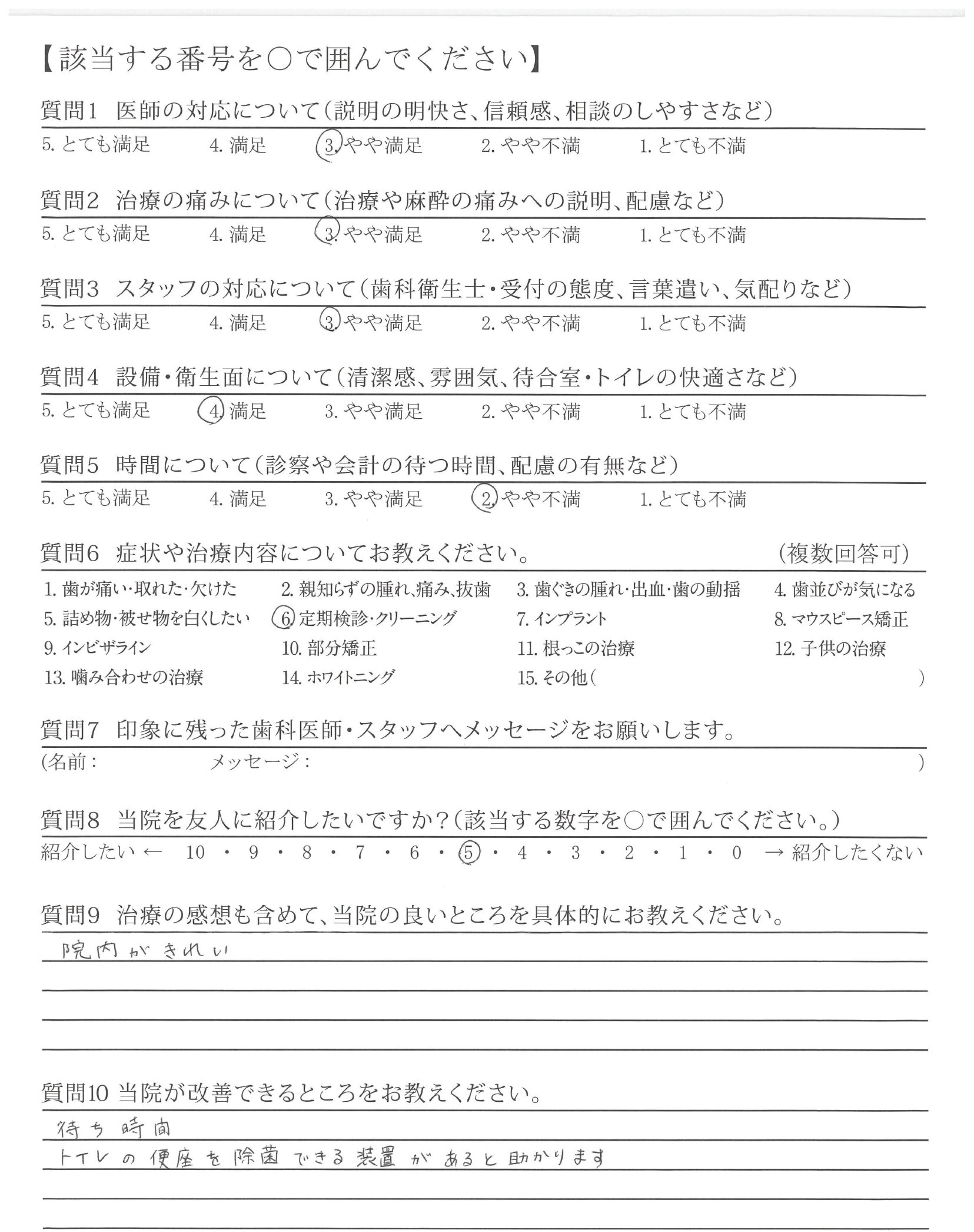 特に改善点等はないので少なくとも現状を維持しさらに上をめざして患者さんに安心、ていねいな治療を提供してほしい。