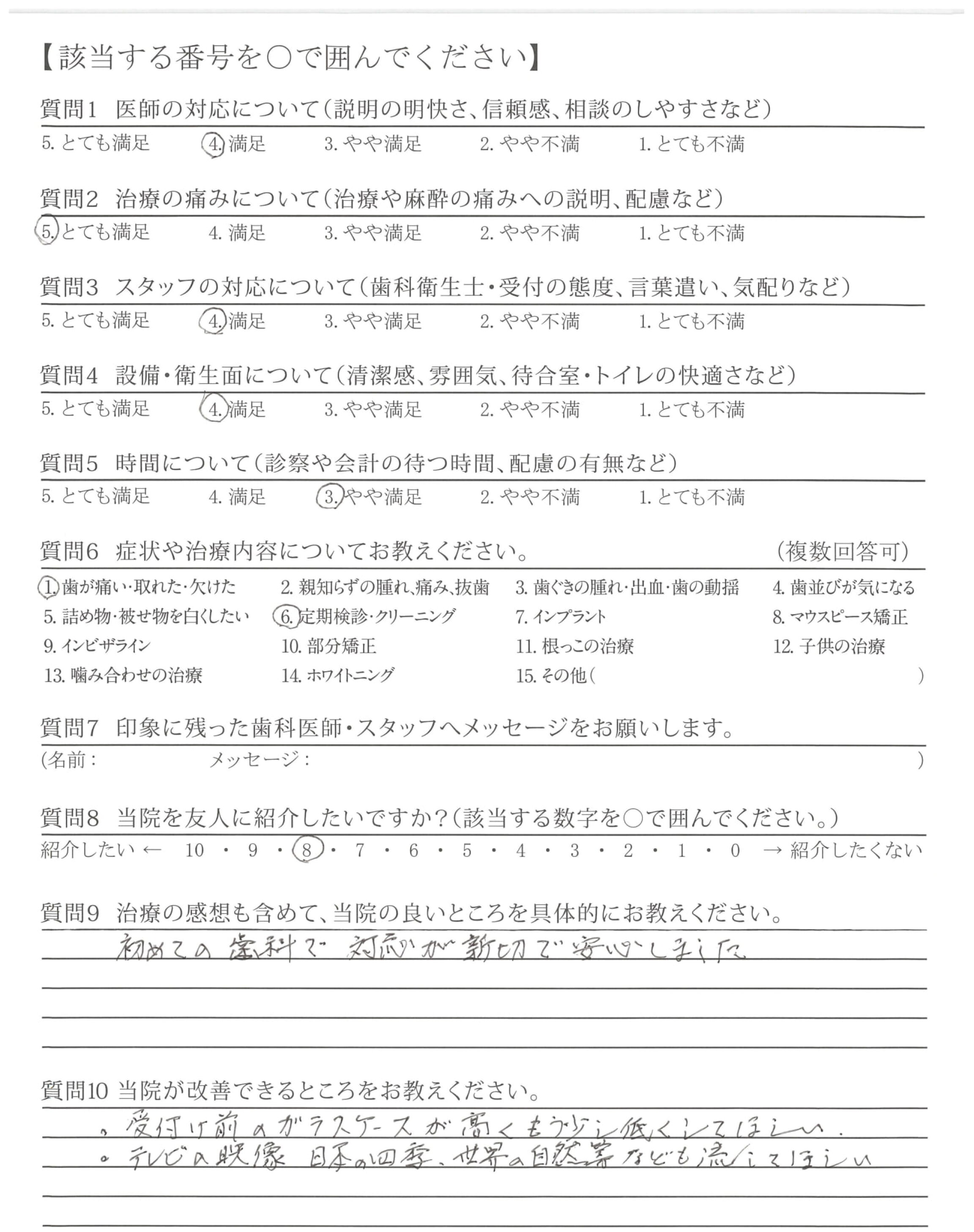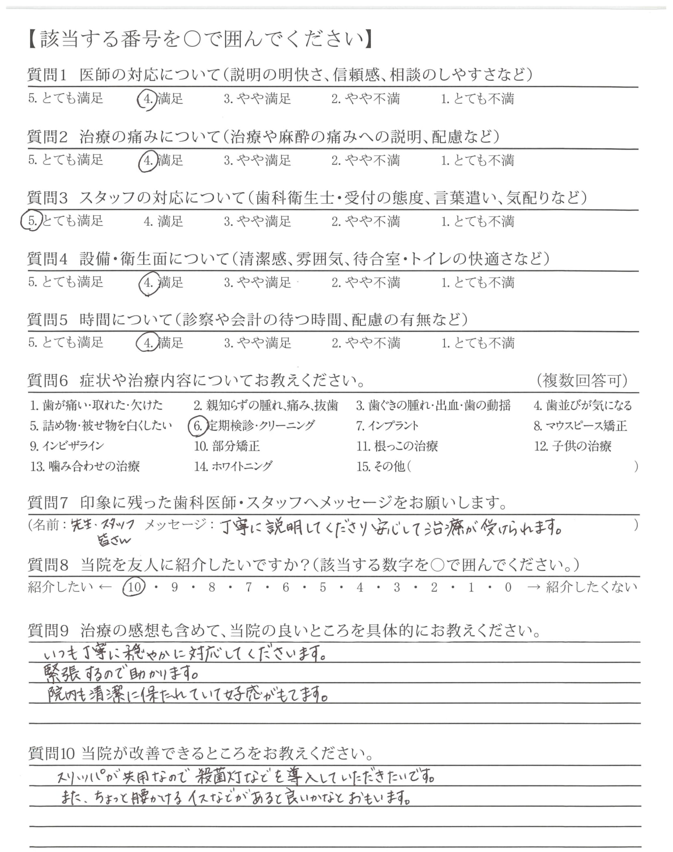 以前は歯医者は痛くて怖いイメージでしたが、治療前の説明も分かりやすくスタッフもやさしくて、イメージが変わりました