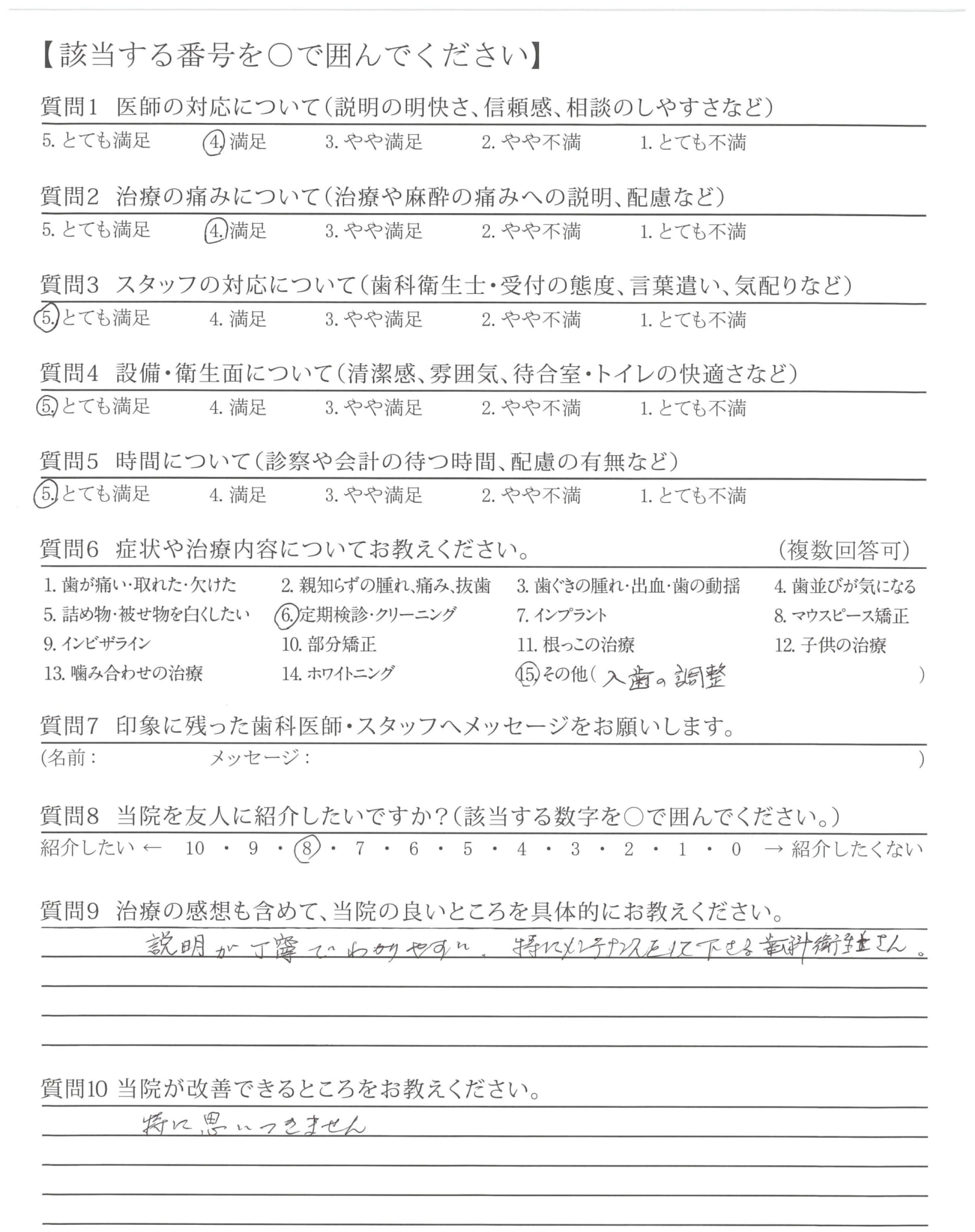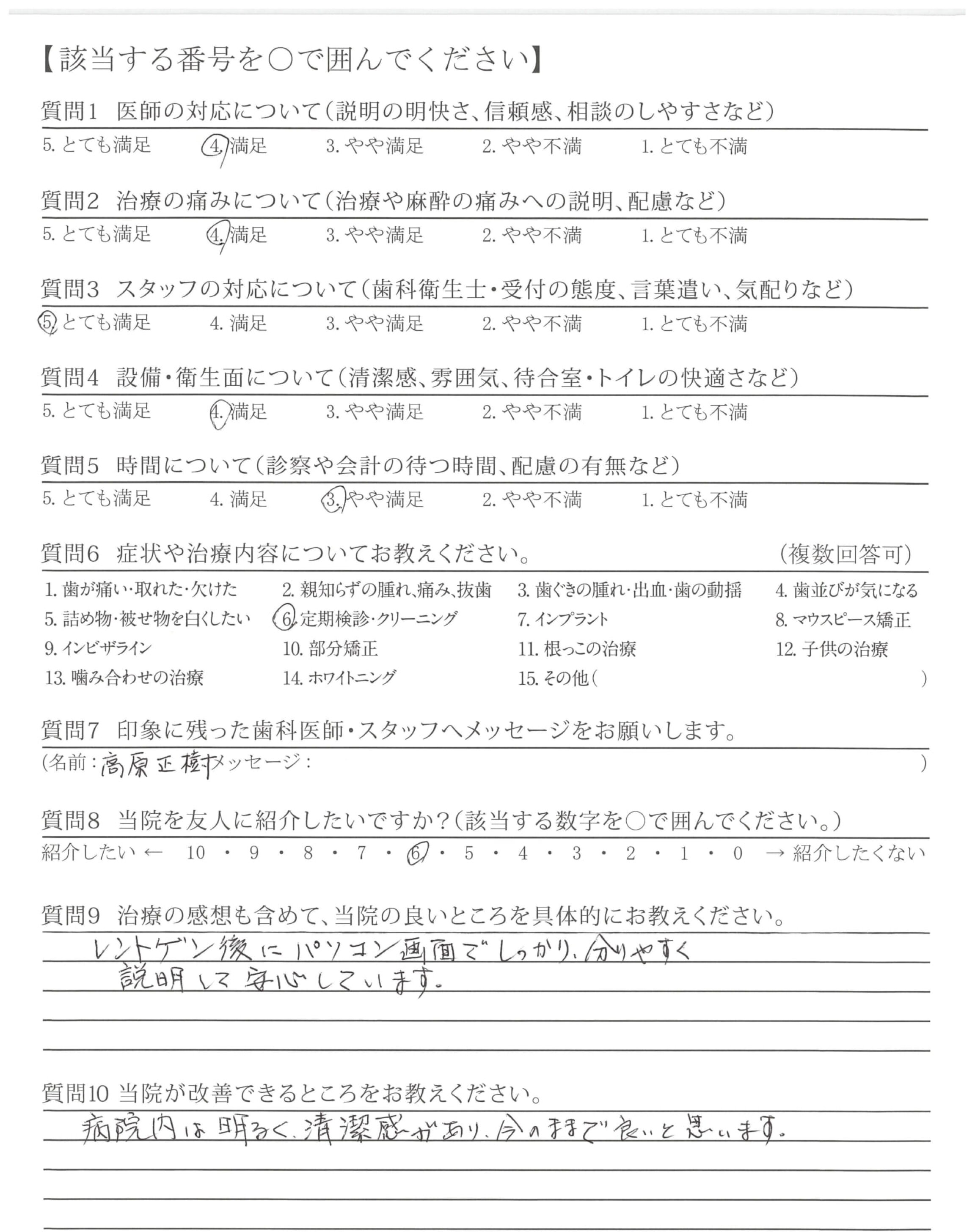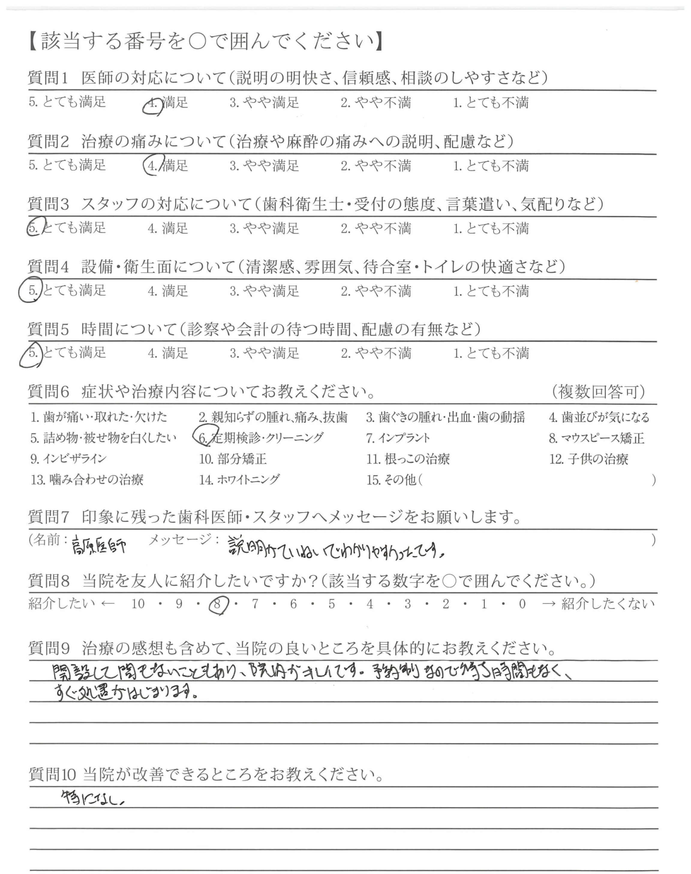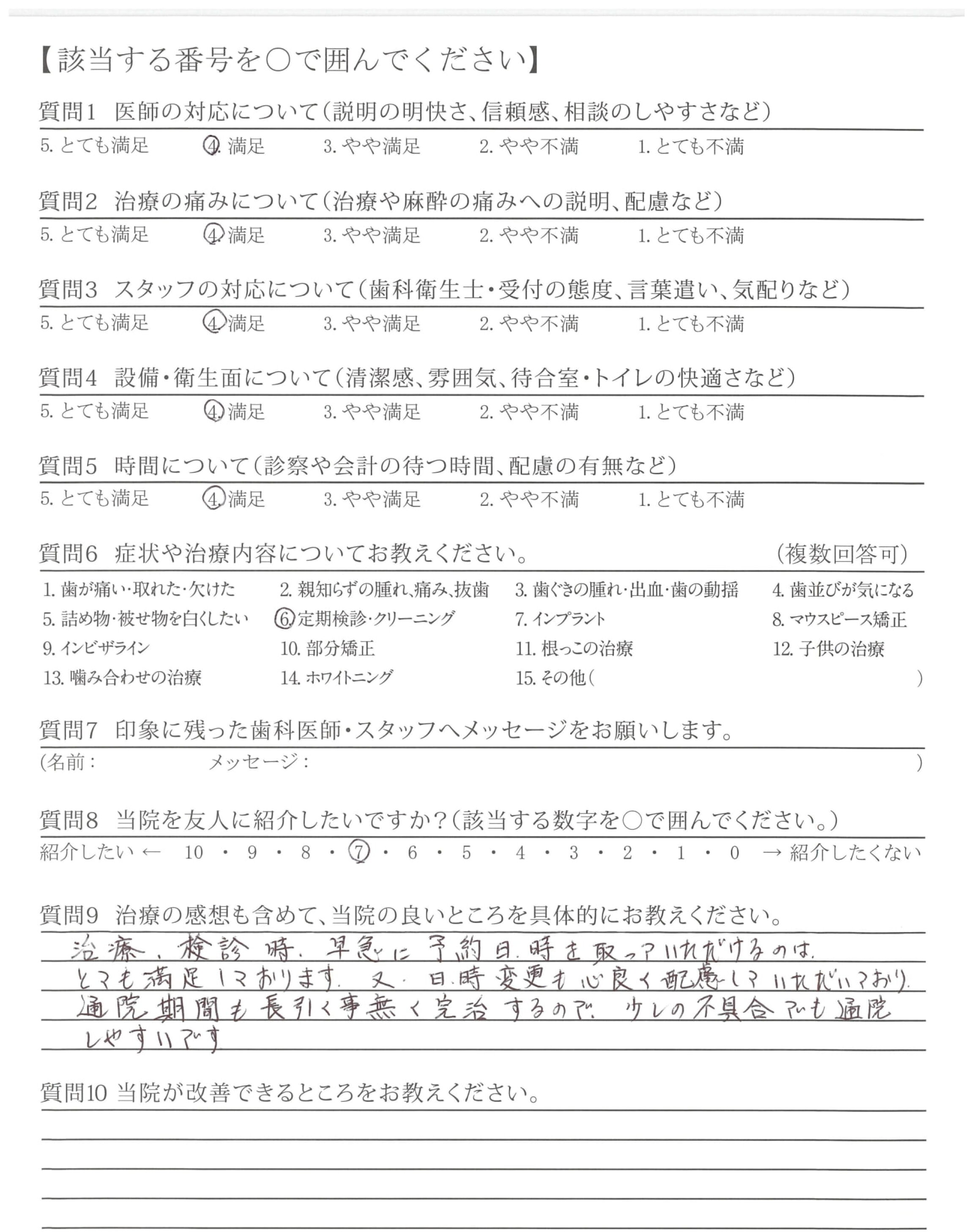 治療、検診時、早急に予約日時を取っていただけるのは、とても満足しております。又、日時変更も心良く配慮していただいており、通院期間も長引く事無く完治するので、少しの不具合でも通院しやすいです。