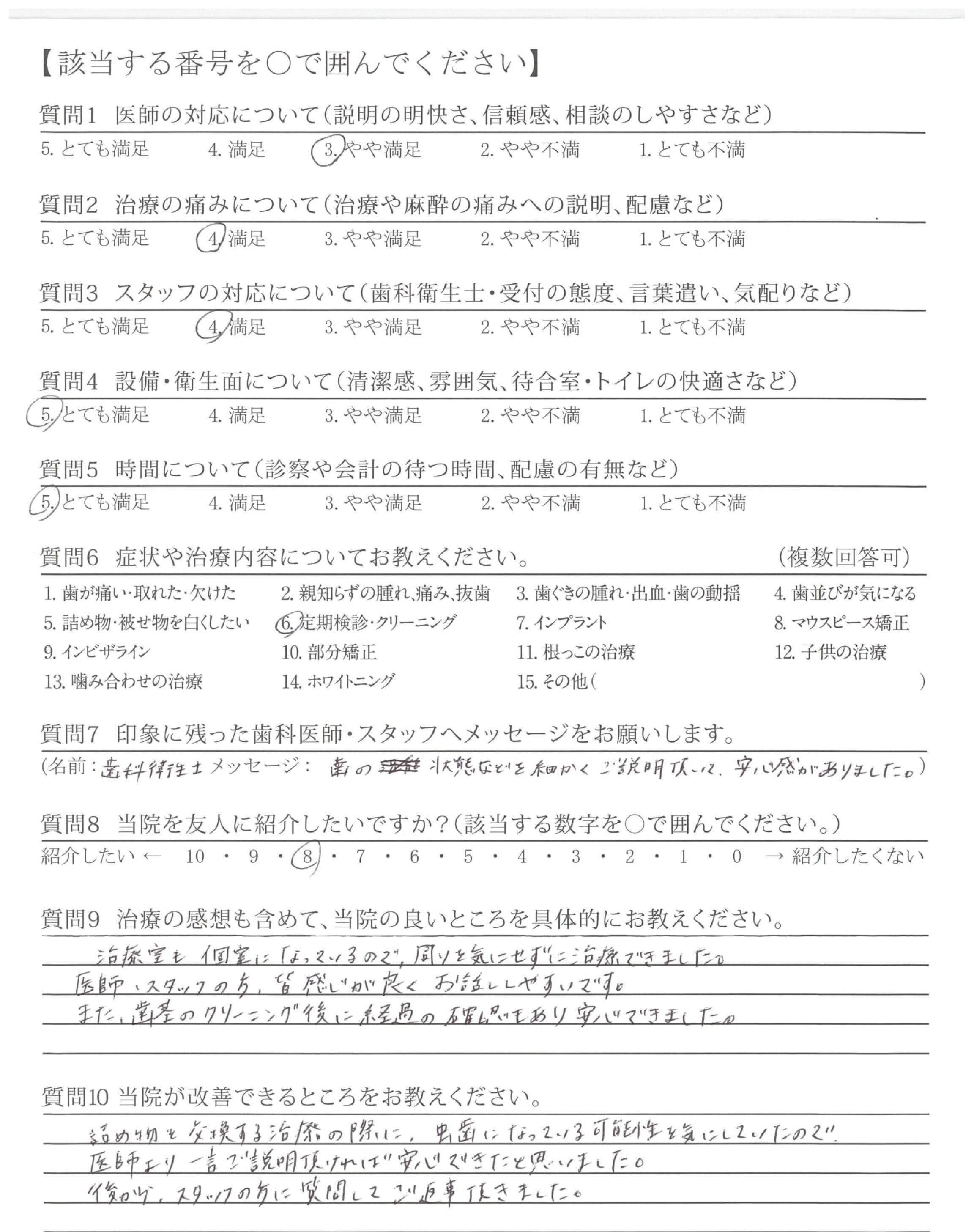詰め物を交換する治療の際に、虫歯になっている可能性を気にしていたので、医師より一言ご説明頂ければ安心できたと思いました。後から、スタッフの方に質問してご返事頂きました。