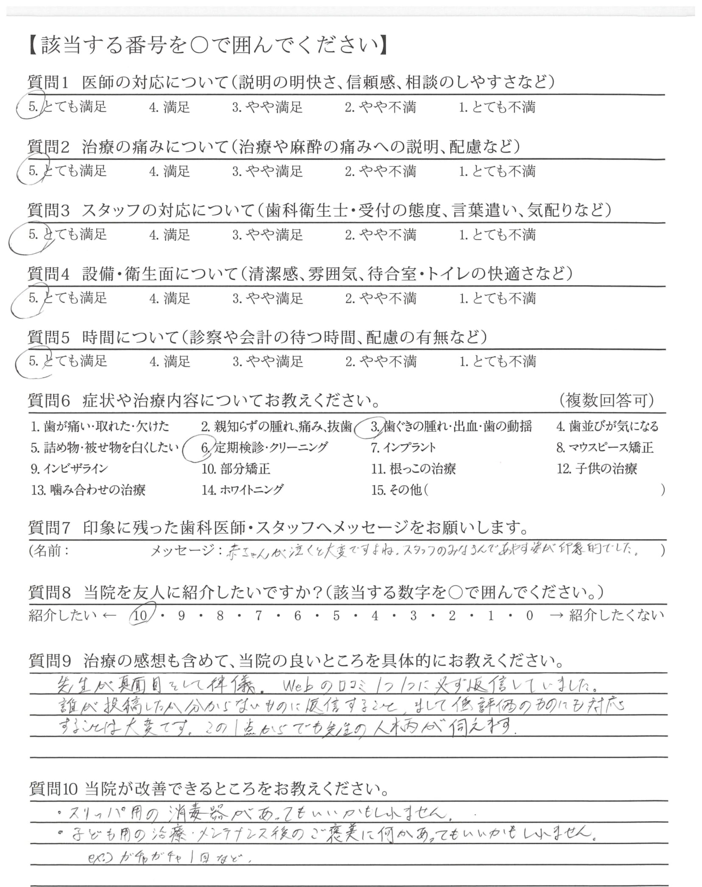 ・待合、トイレ等、全体的に清潔感がありましたが、診察台、診察室の細部の清掃がもう少しされていると尚更快適になると思います