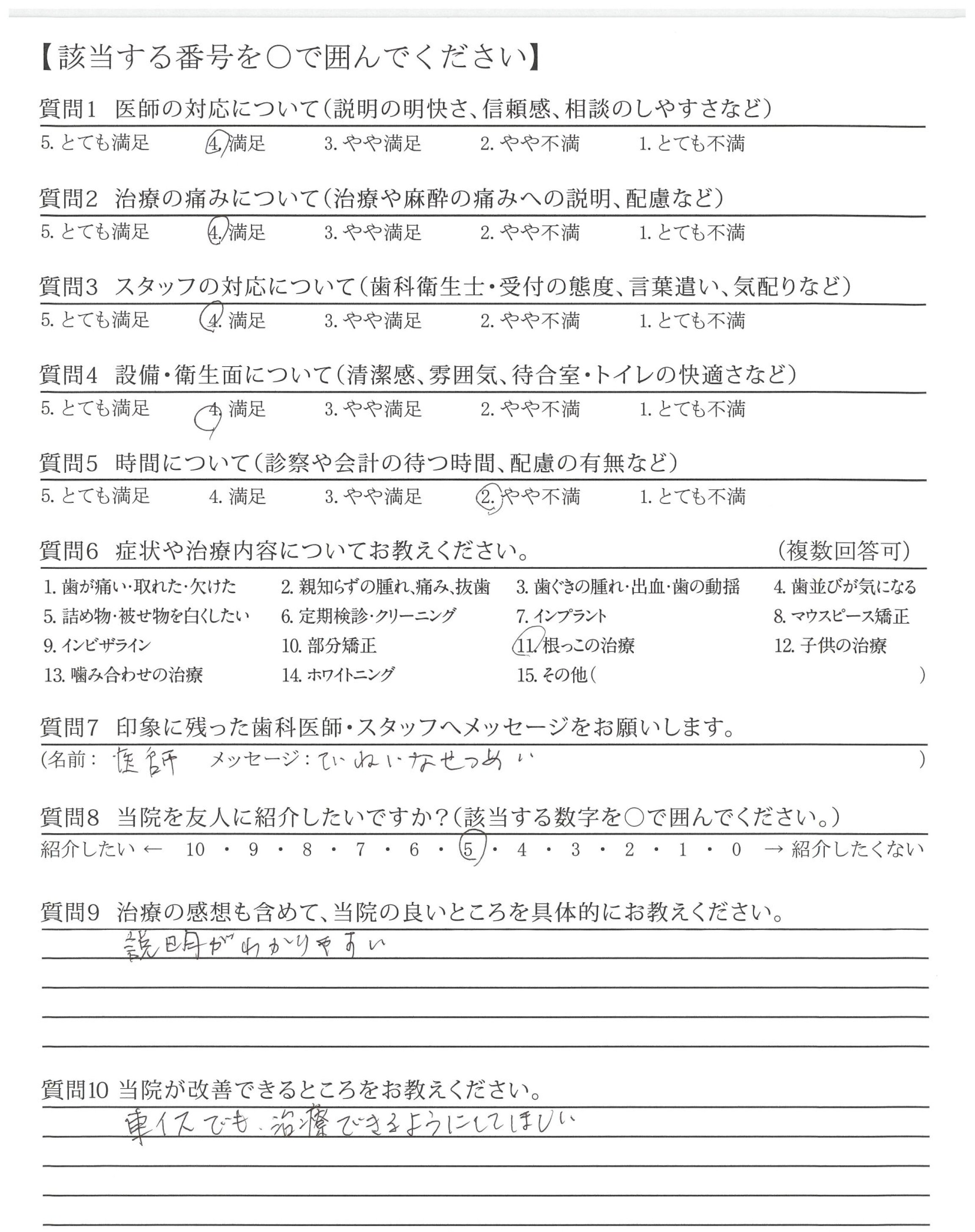 ・治療に対する説明はそれなりにしてくれますが、治療期間が長かった時があり、若干不安になったが終ればそれなりにしっかりしている。