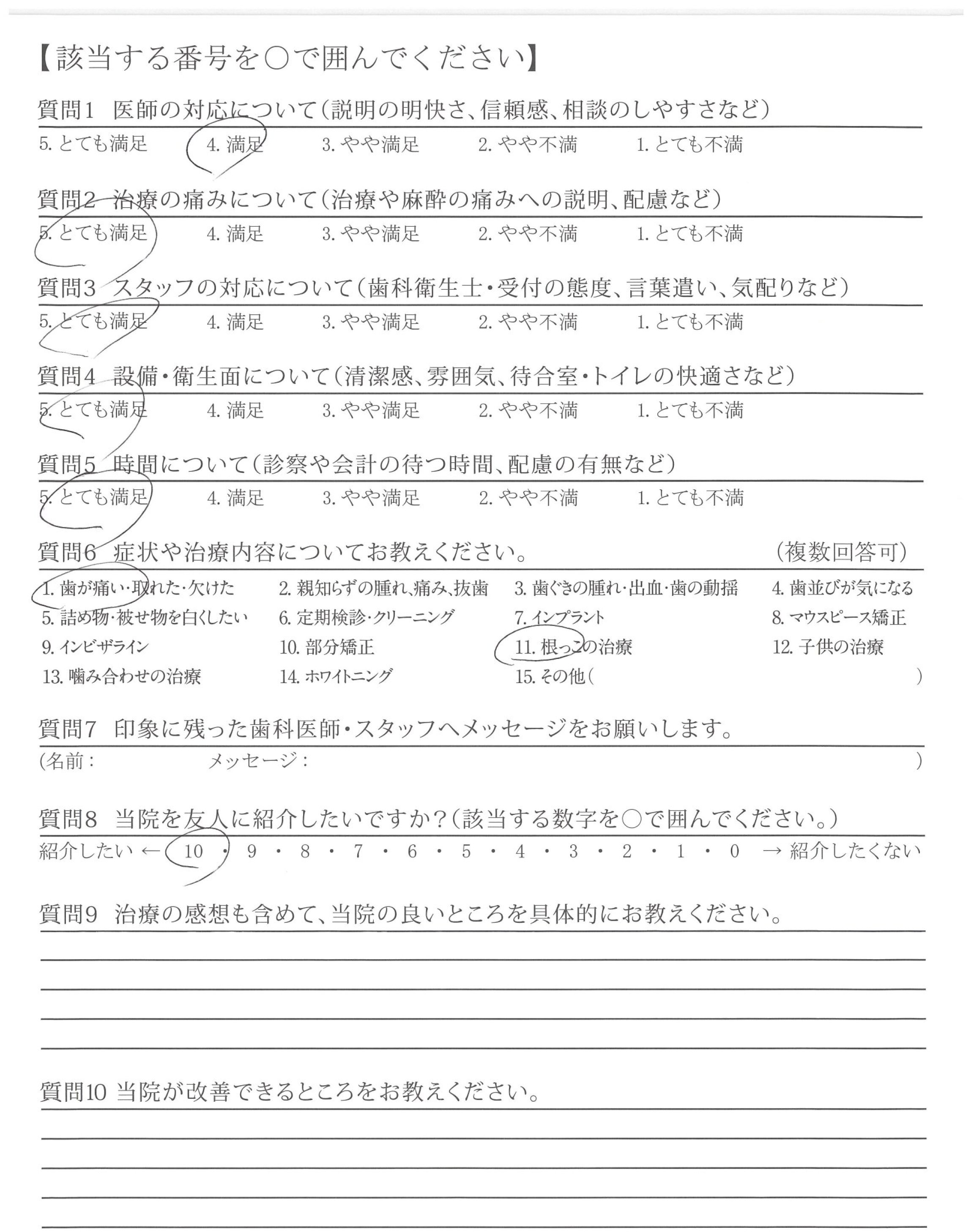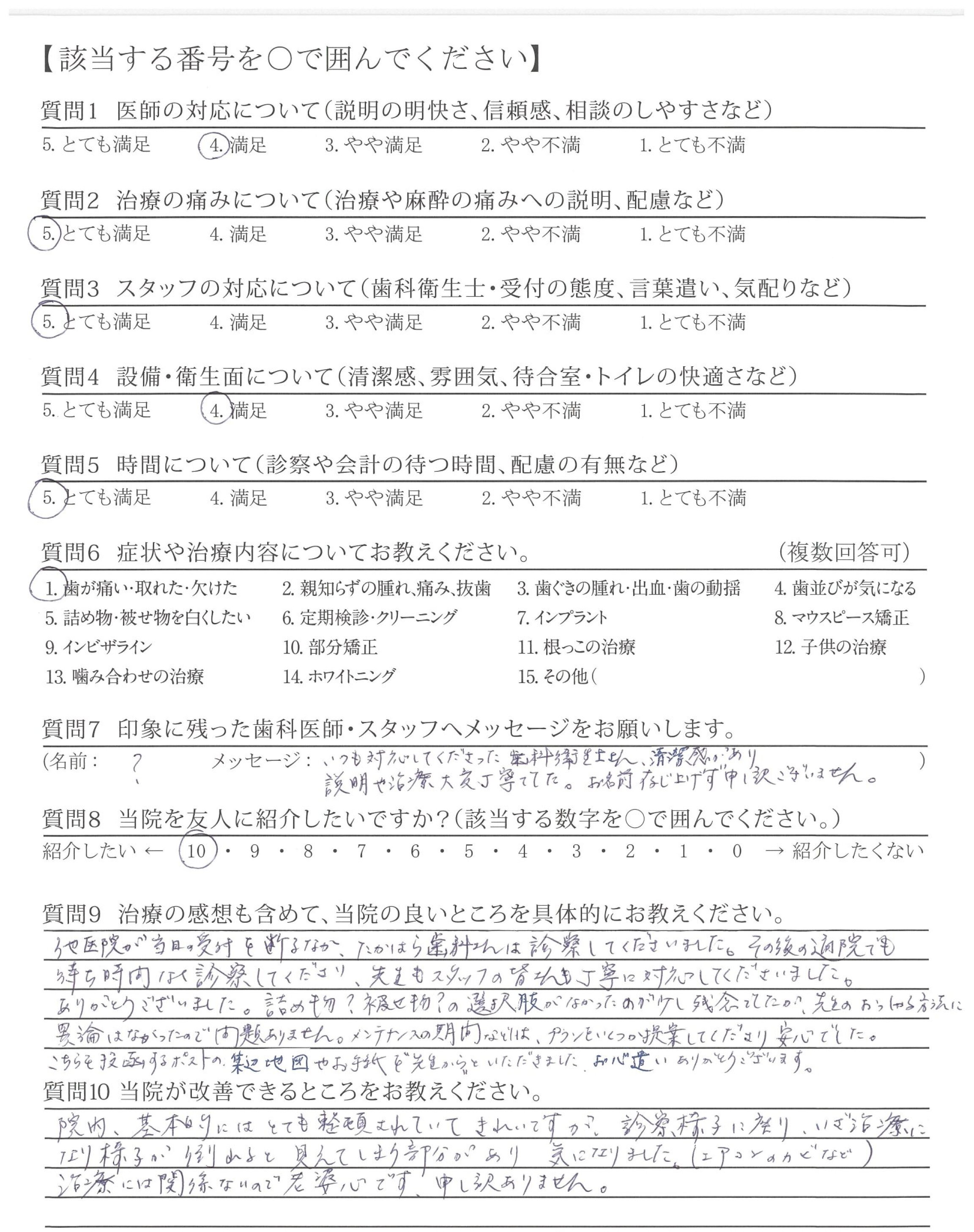 20年以上前に治療した奥歯の詰め物が取れた為、受診しました。早くに診ていただけたこと、先生の説明もわかりやすく、こちらの希望にも応じていただき、短期間で治療していただけて、とても満足しています。