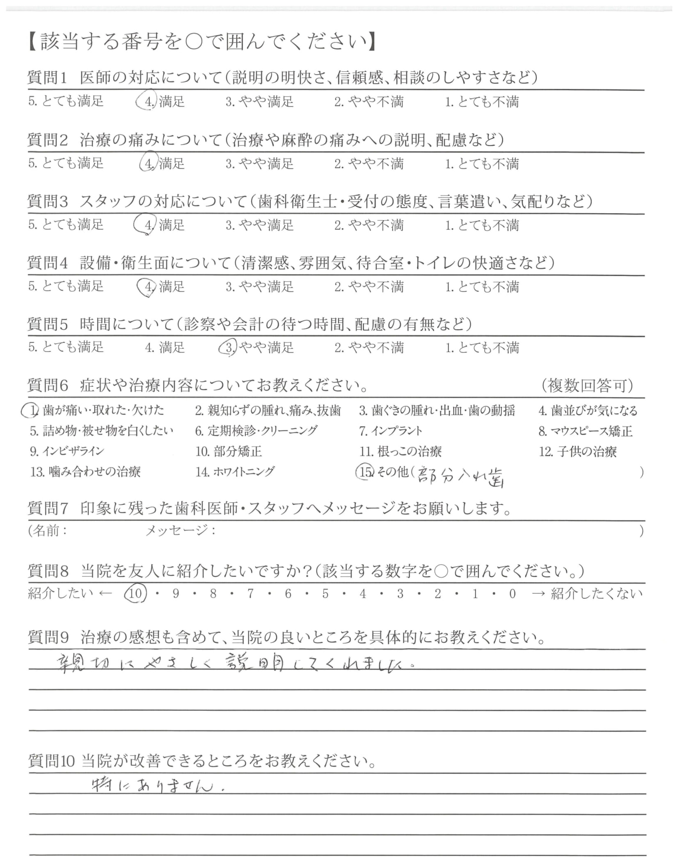 詰め物を交換する治療の際に、虫歯になっている可能性を気にしていたので、医師より一言ご説明頂ければ安心できたと思いました。後から、スタッフの方に質問してご返事頂きました。