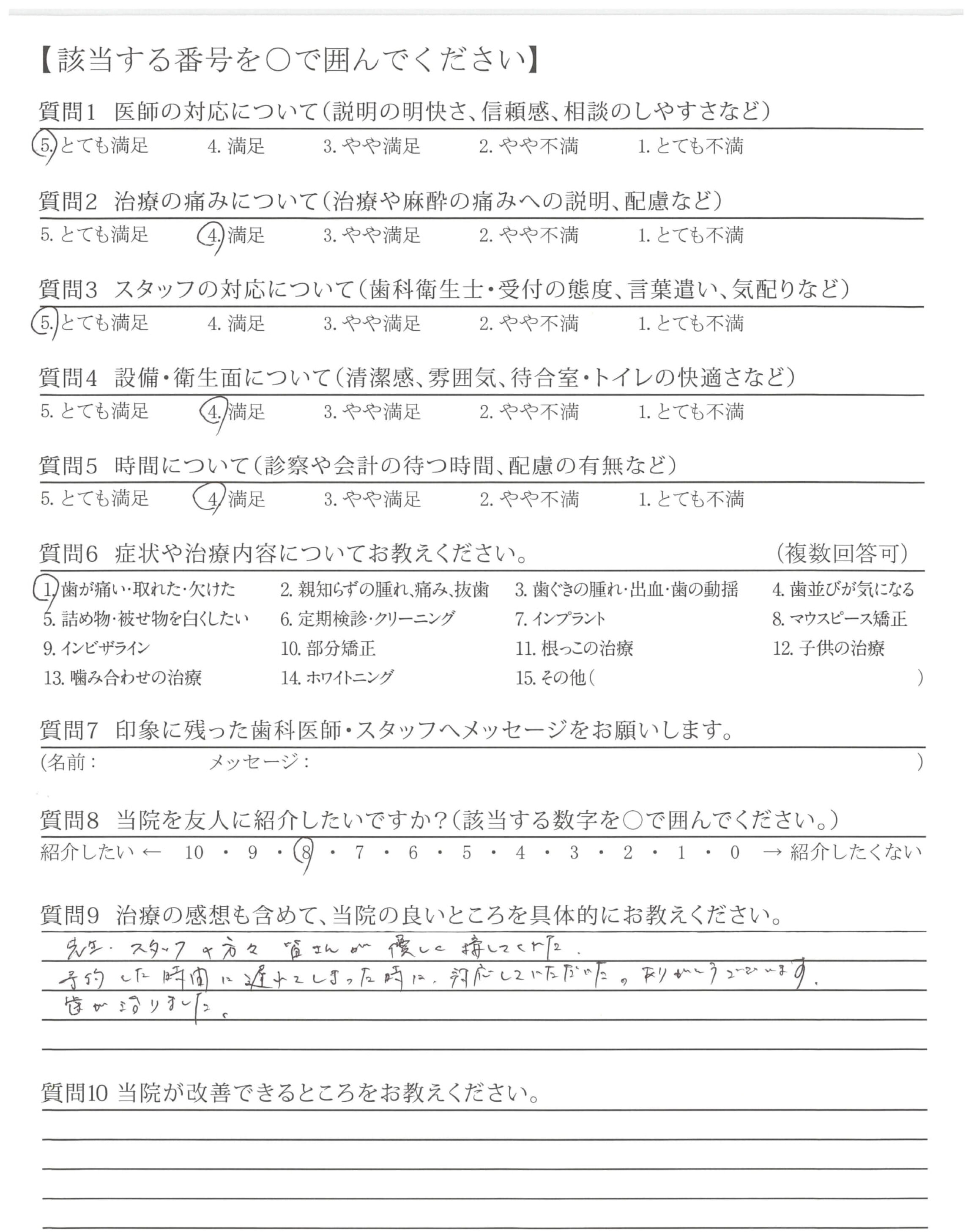 予約した時間に遅れてしまった時に、対応していただいた。ありがとうございます。歯が治りました。