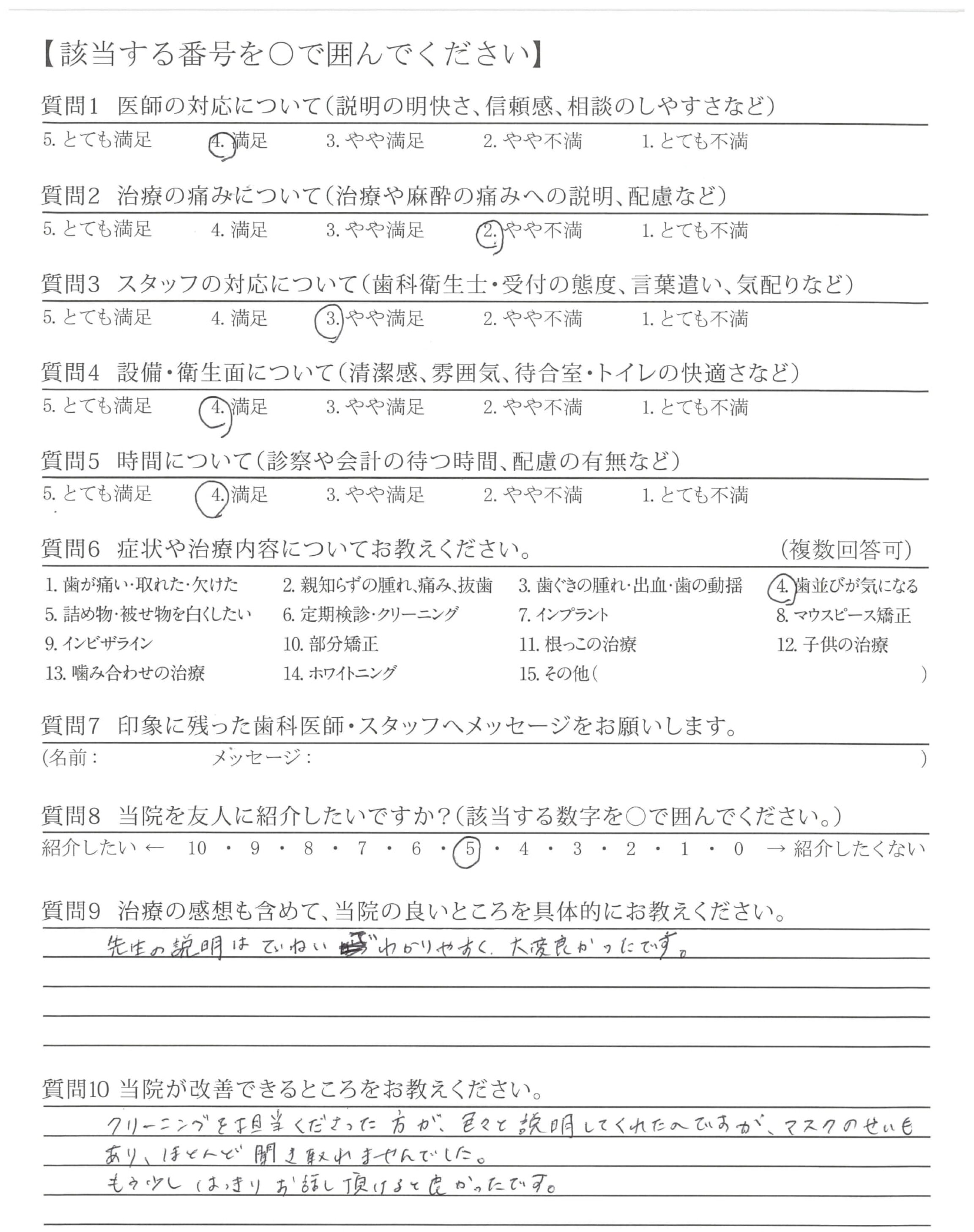 クリーニングを担当くださった方が、色々と説明してくれたのですが、マスクのせいもあり、ほとんど聞き取れませんでした。もう少しはっきりお話し頂けると良かったです。