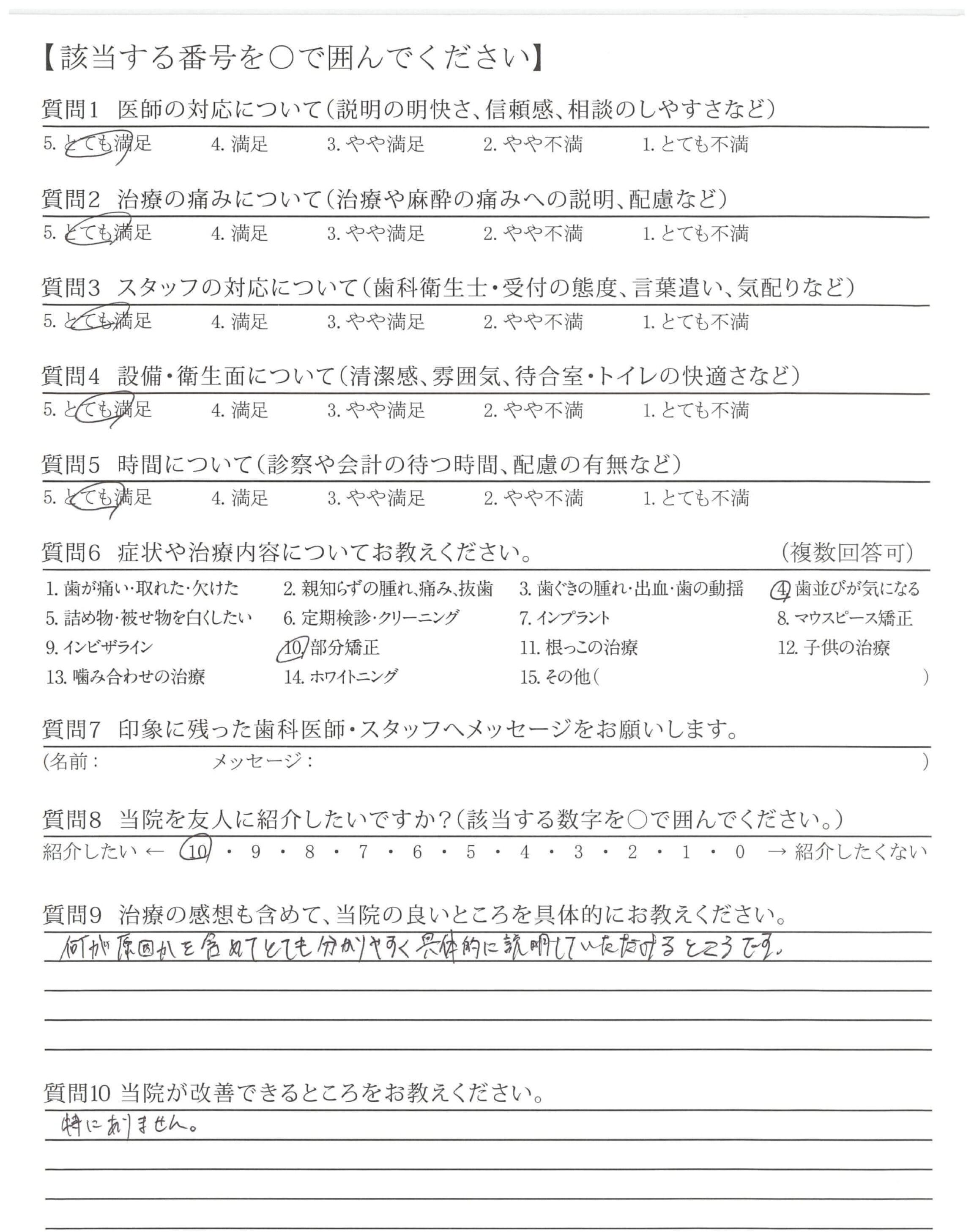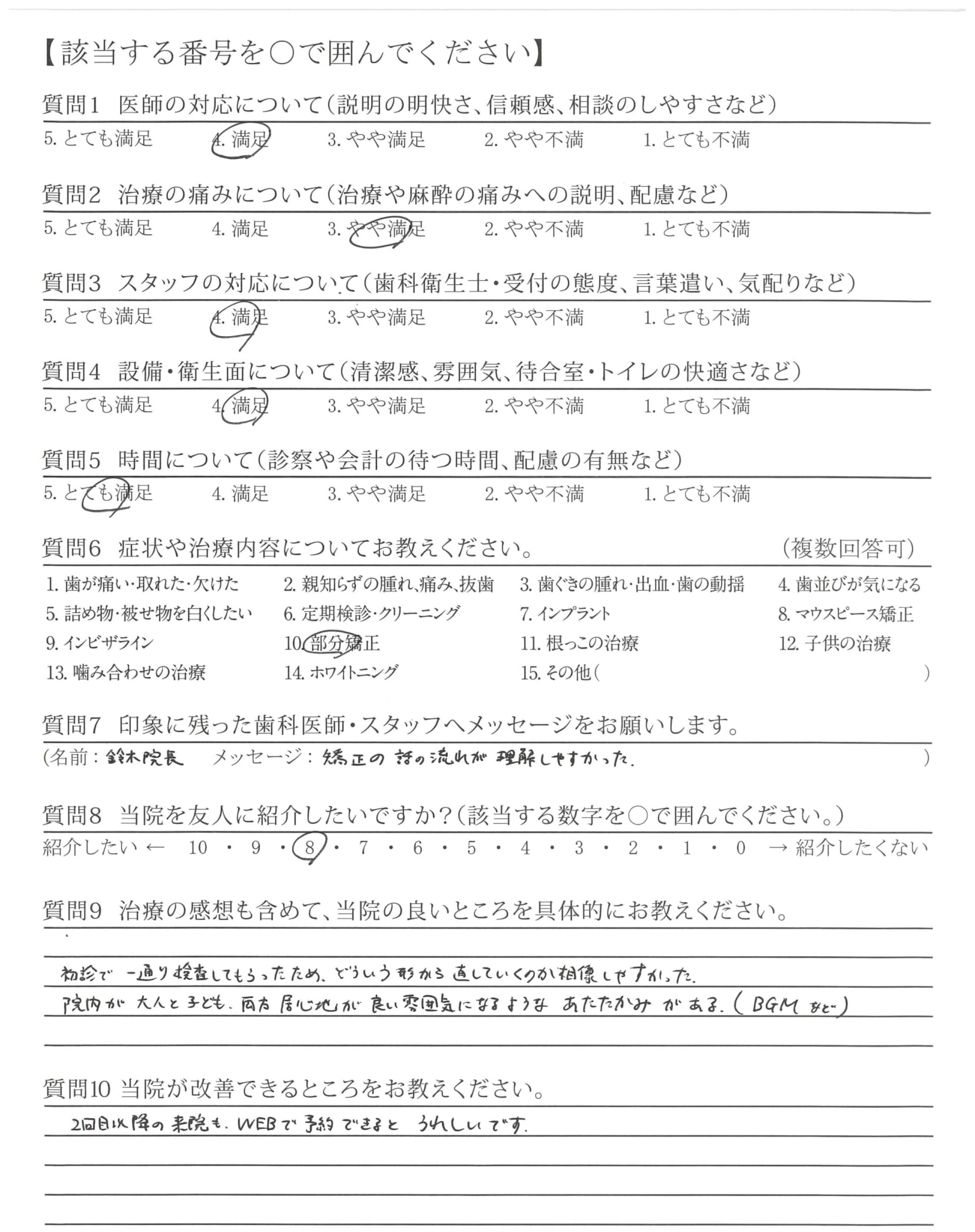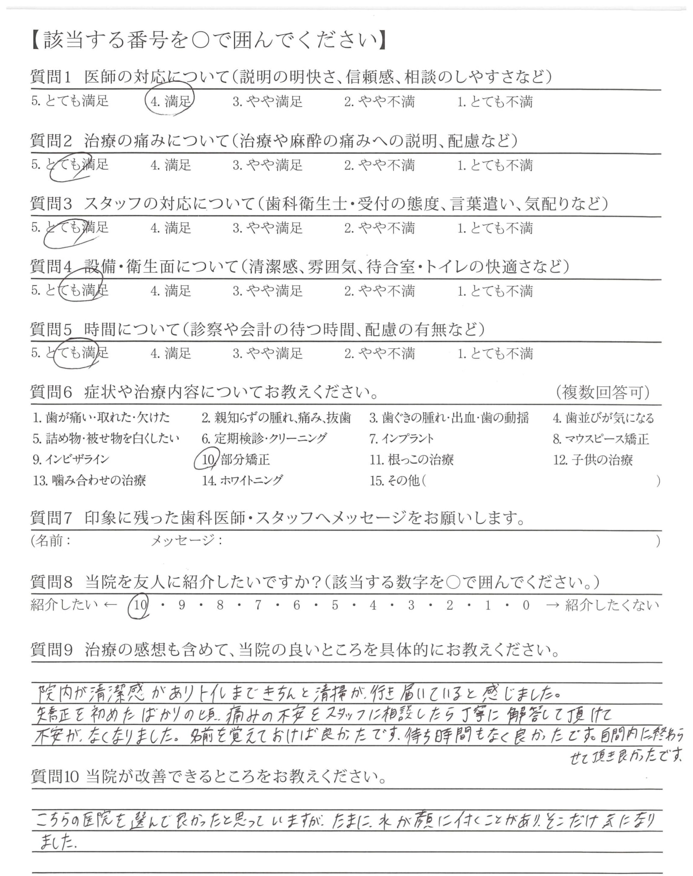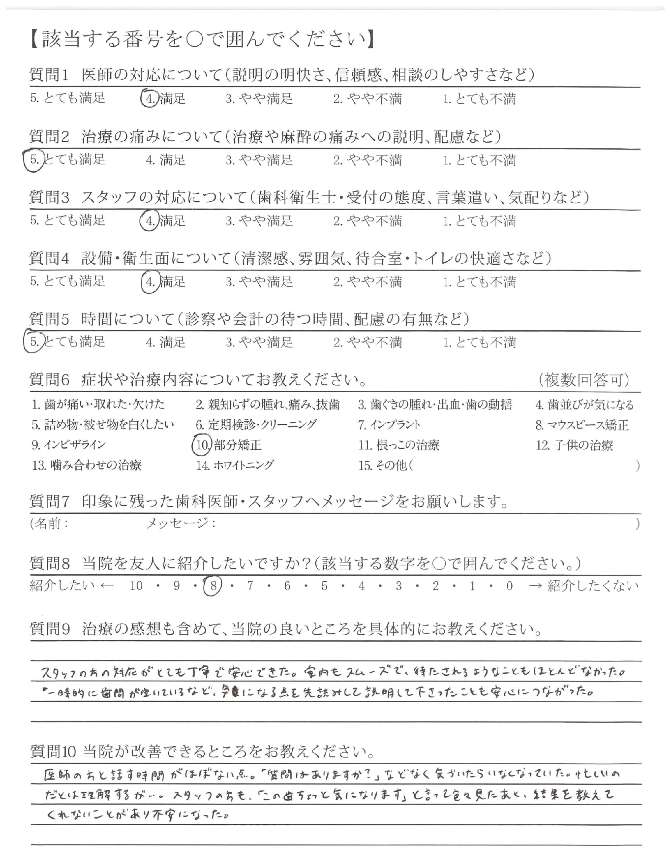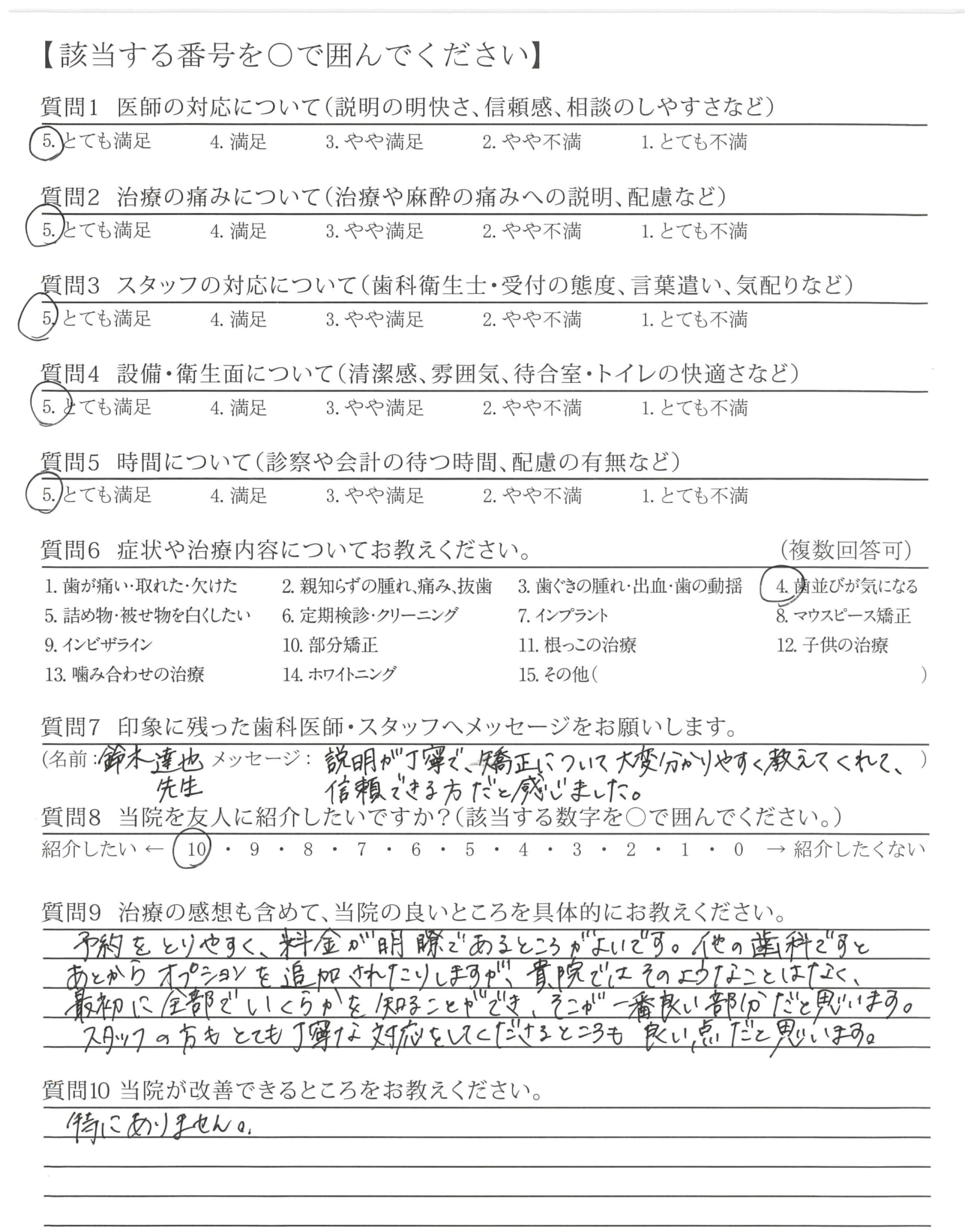 ワイヤーの部分矯正で非常に効果を感じられました。また、受付の方、先生、衛生士の方、皆さん丁寧に説明してくださるので不安、不満がありませんでした。