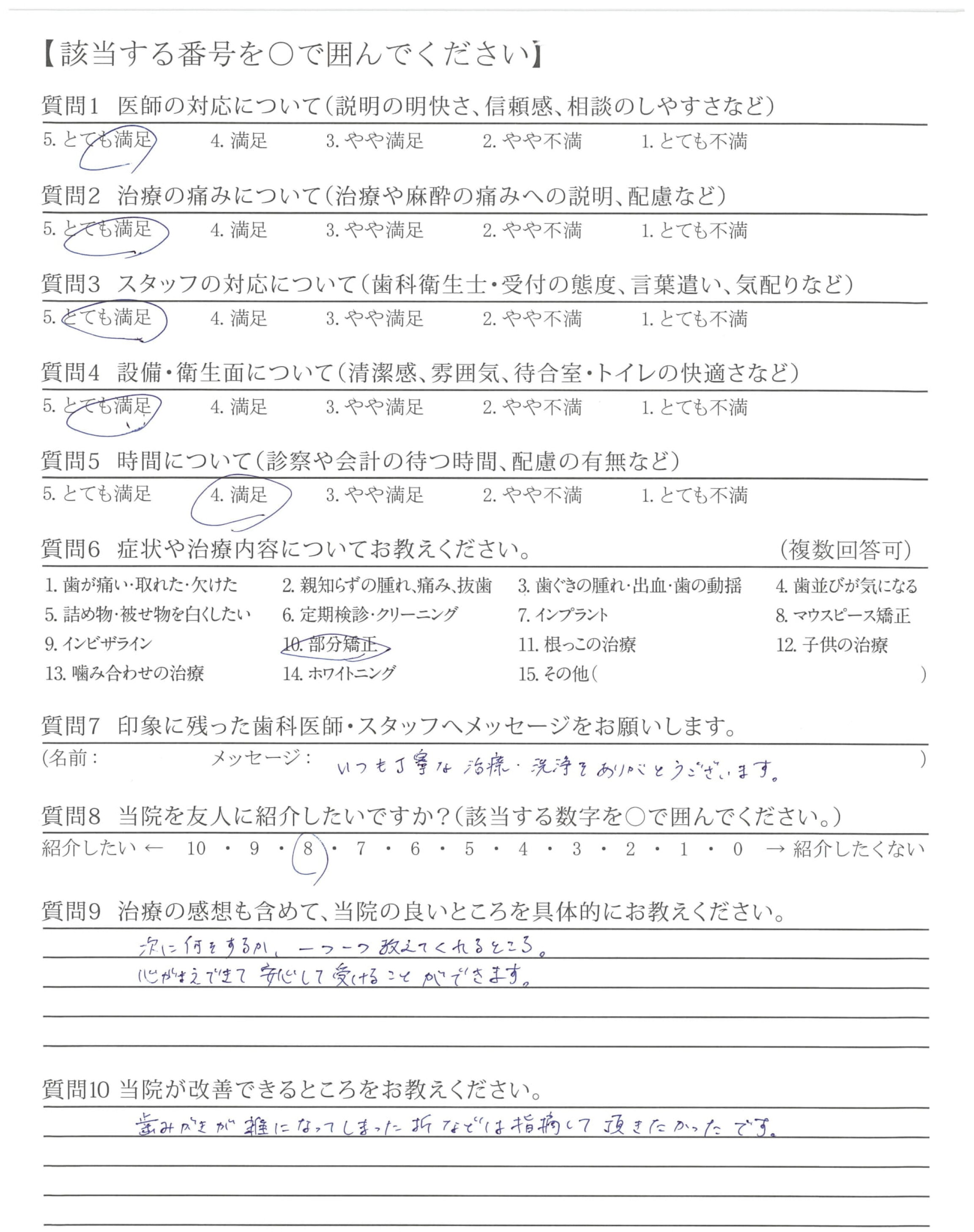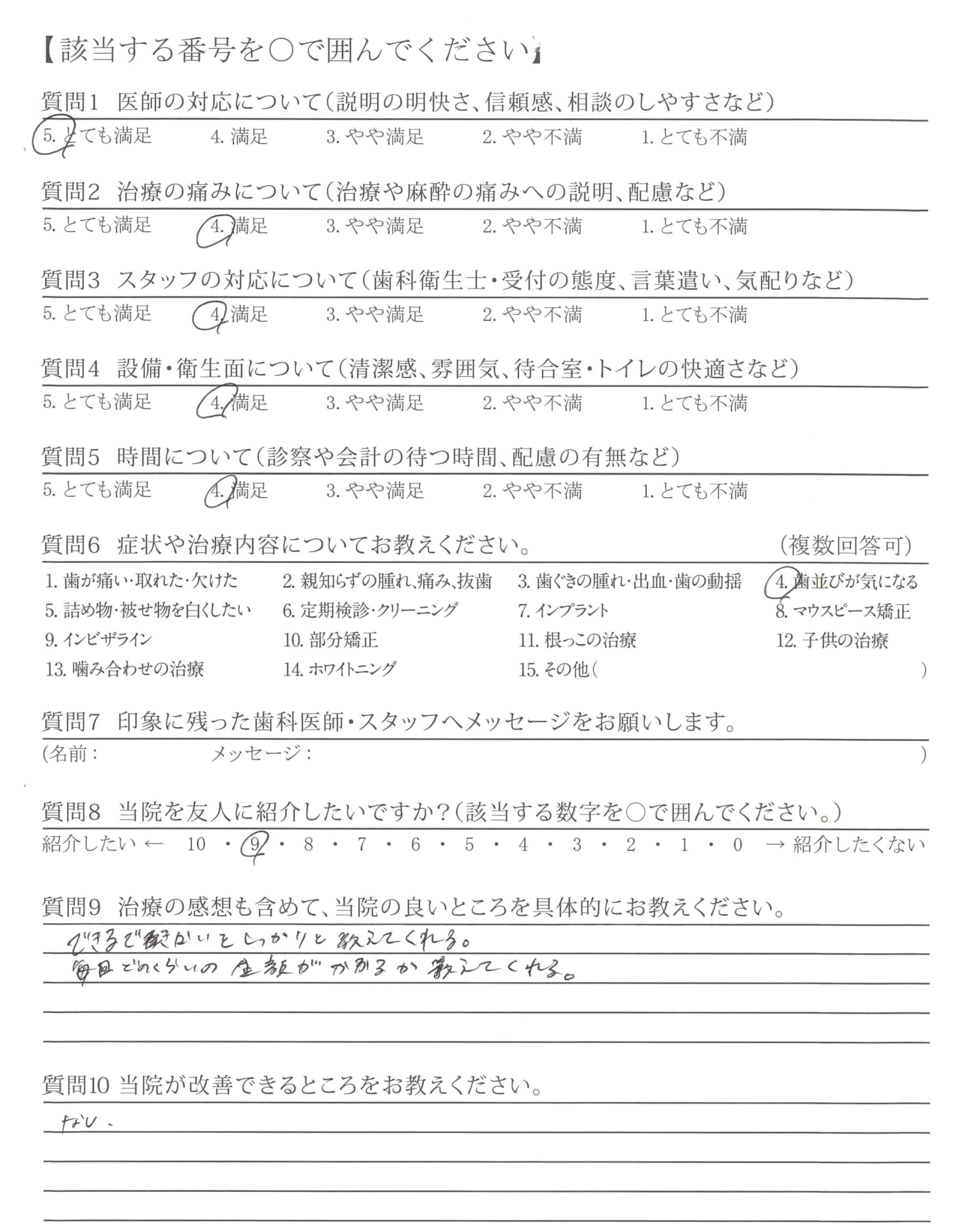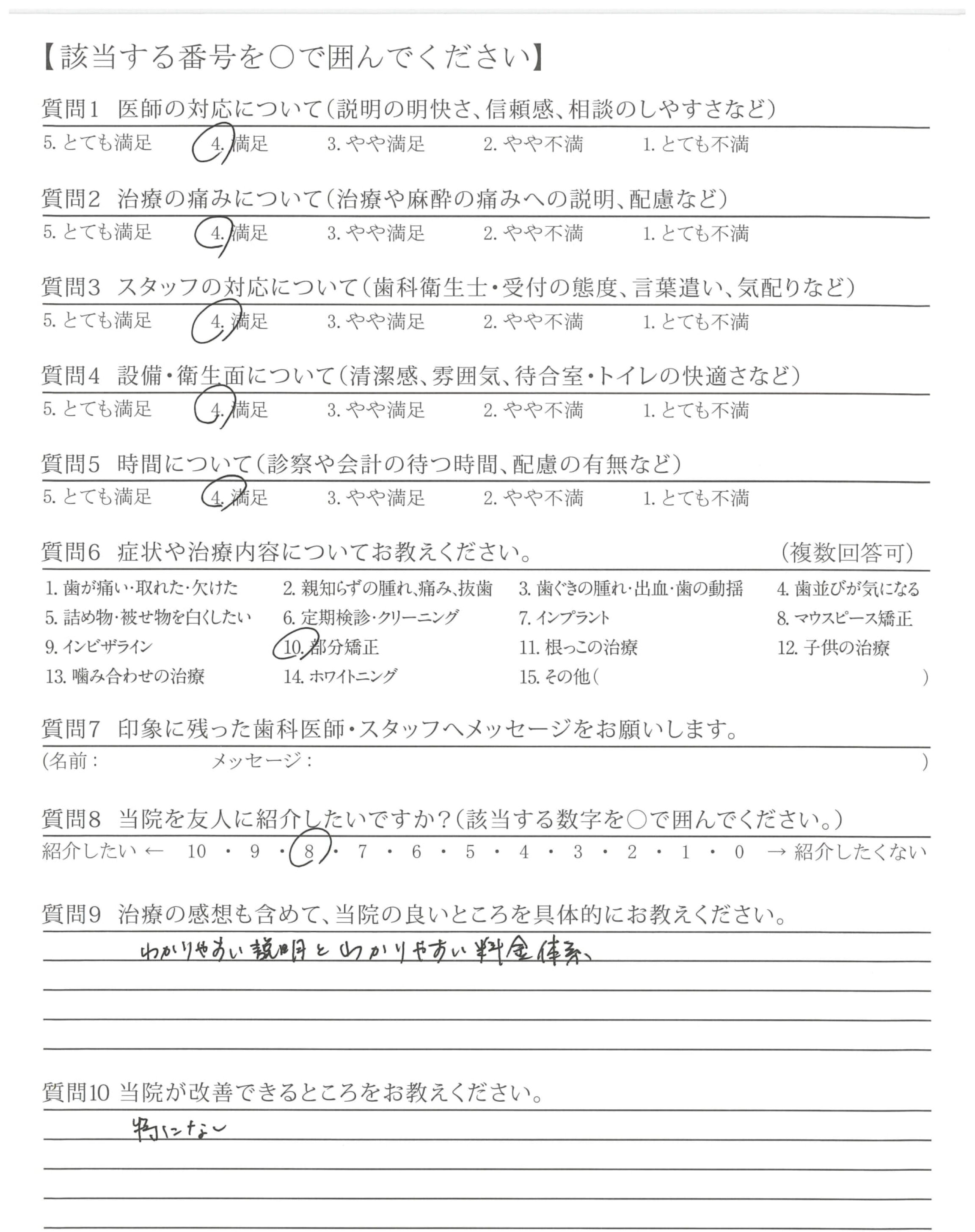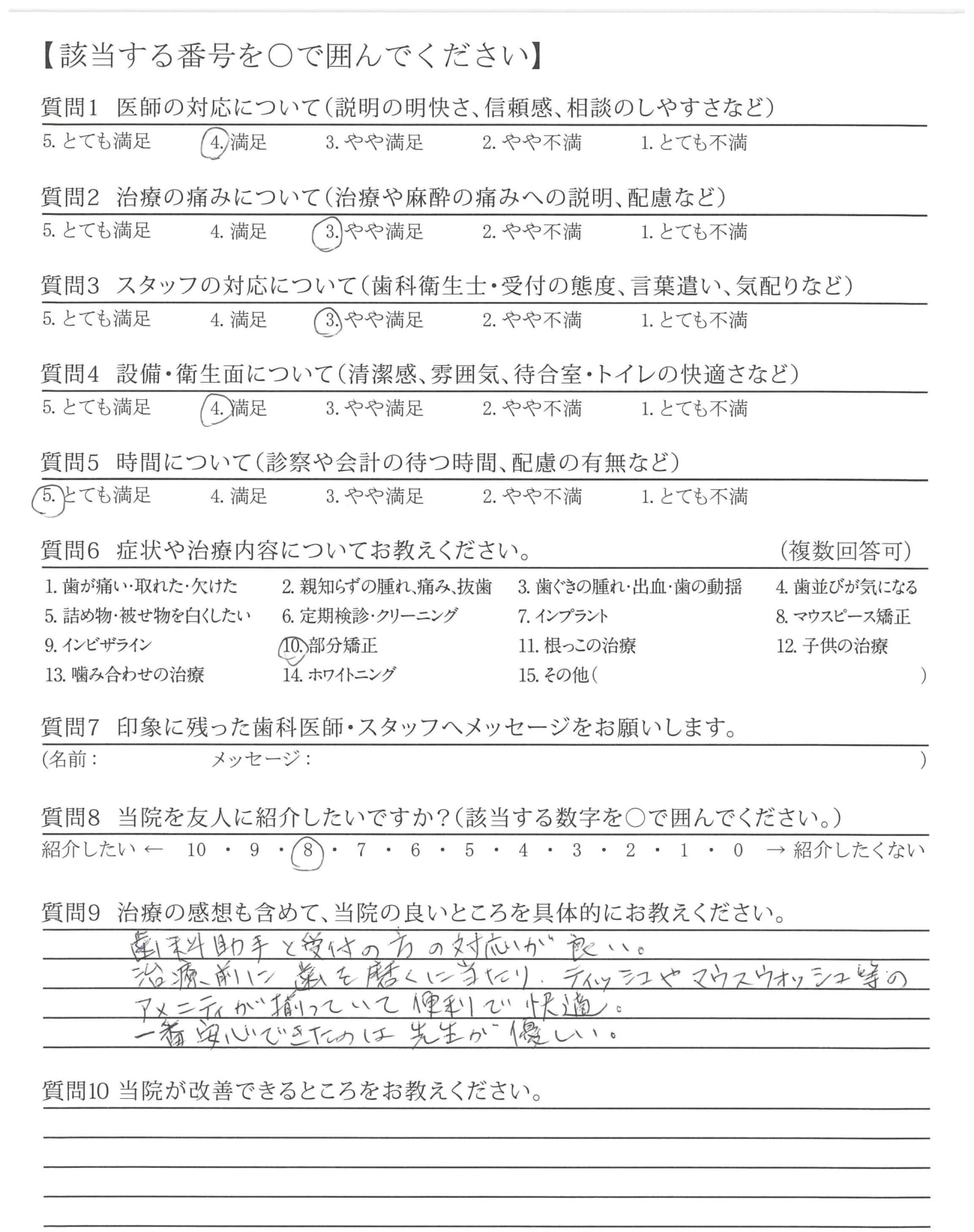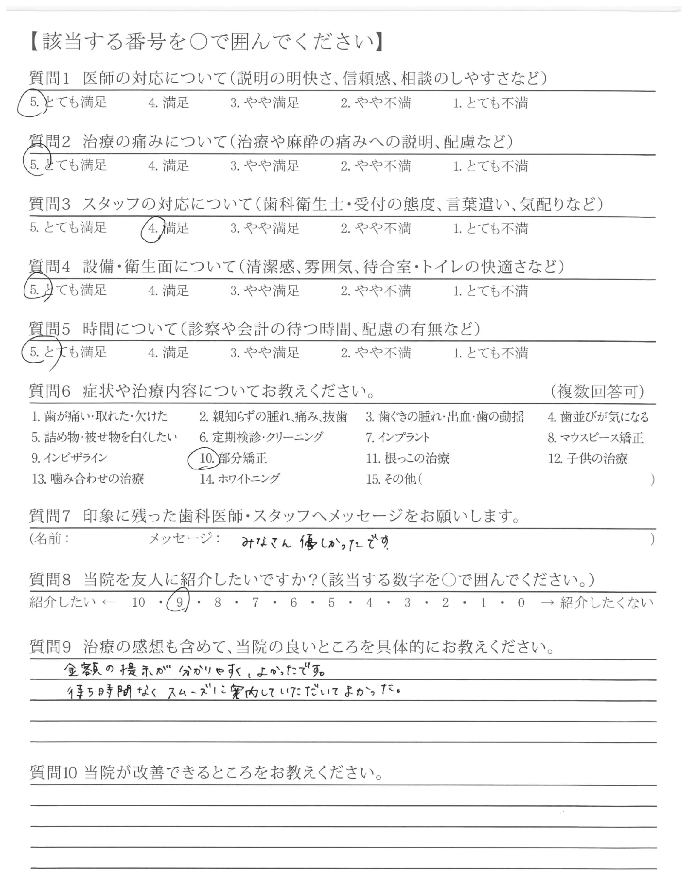 ワイヤーの部分矯正で非常に効果を感じられました。また、受付の方、先生、衛生士の方、皆さん丁寧に説明してくださるので不安、不満がありませんでした。