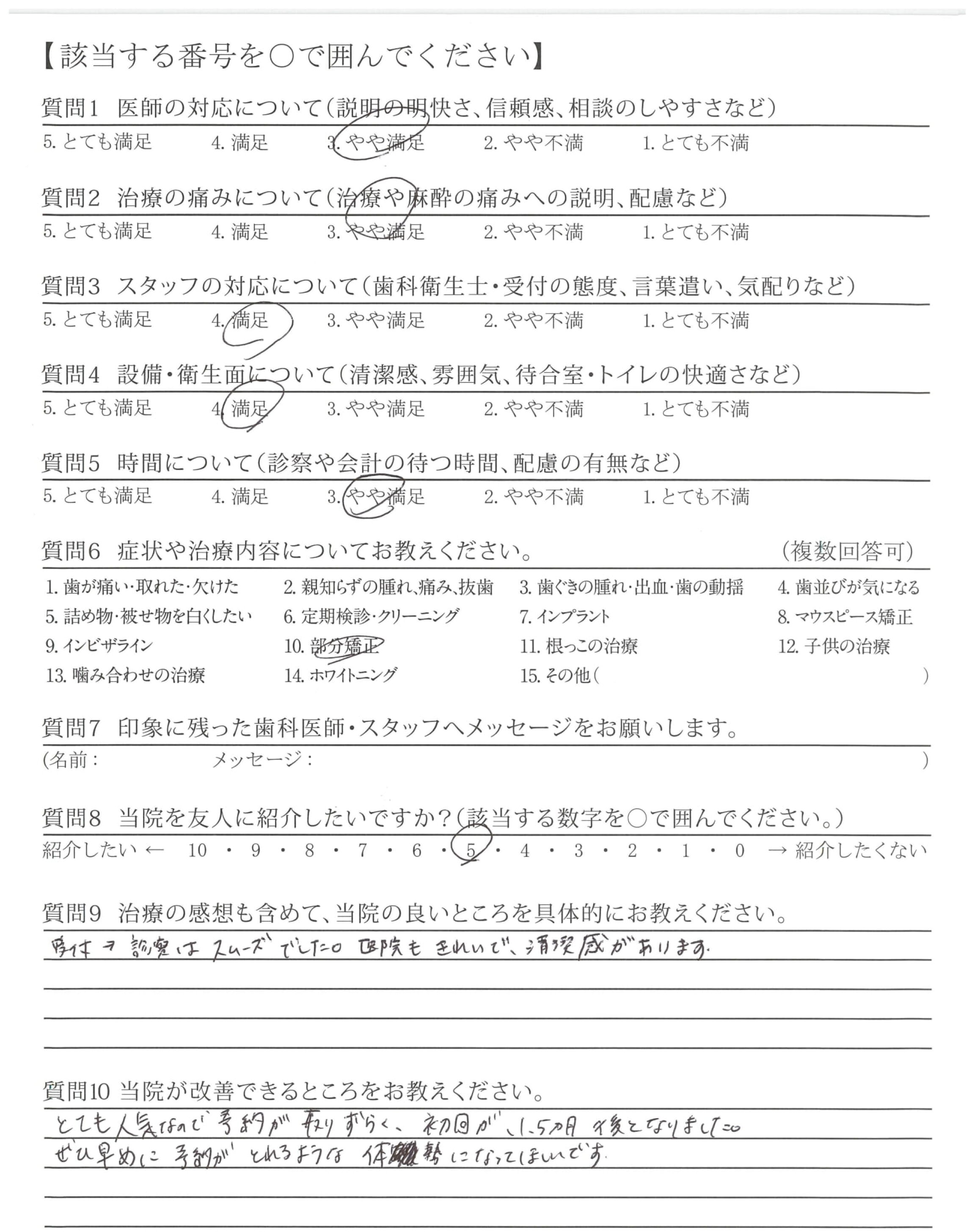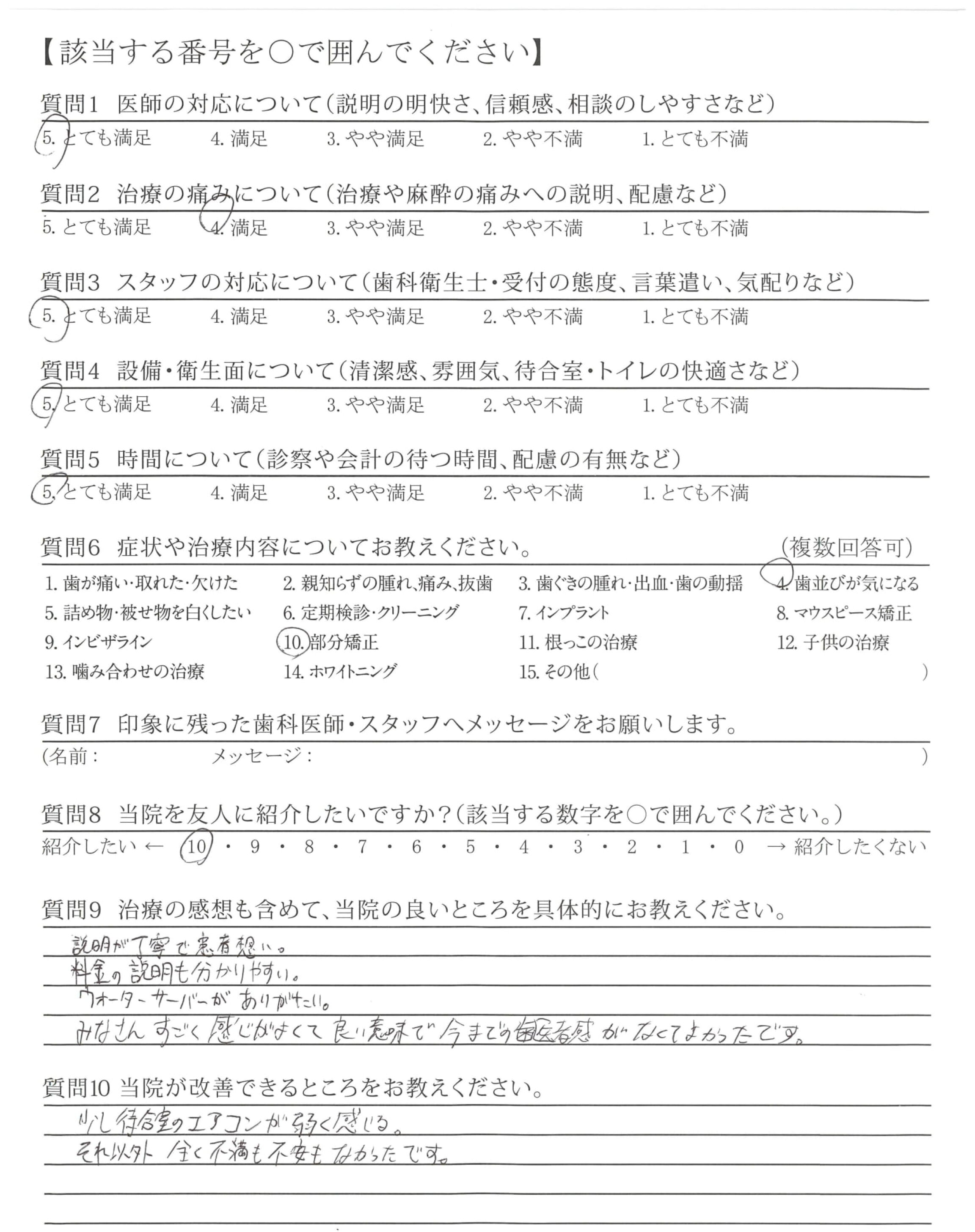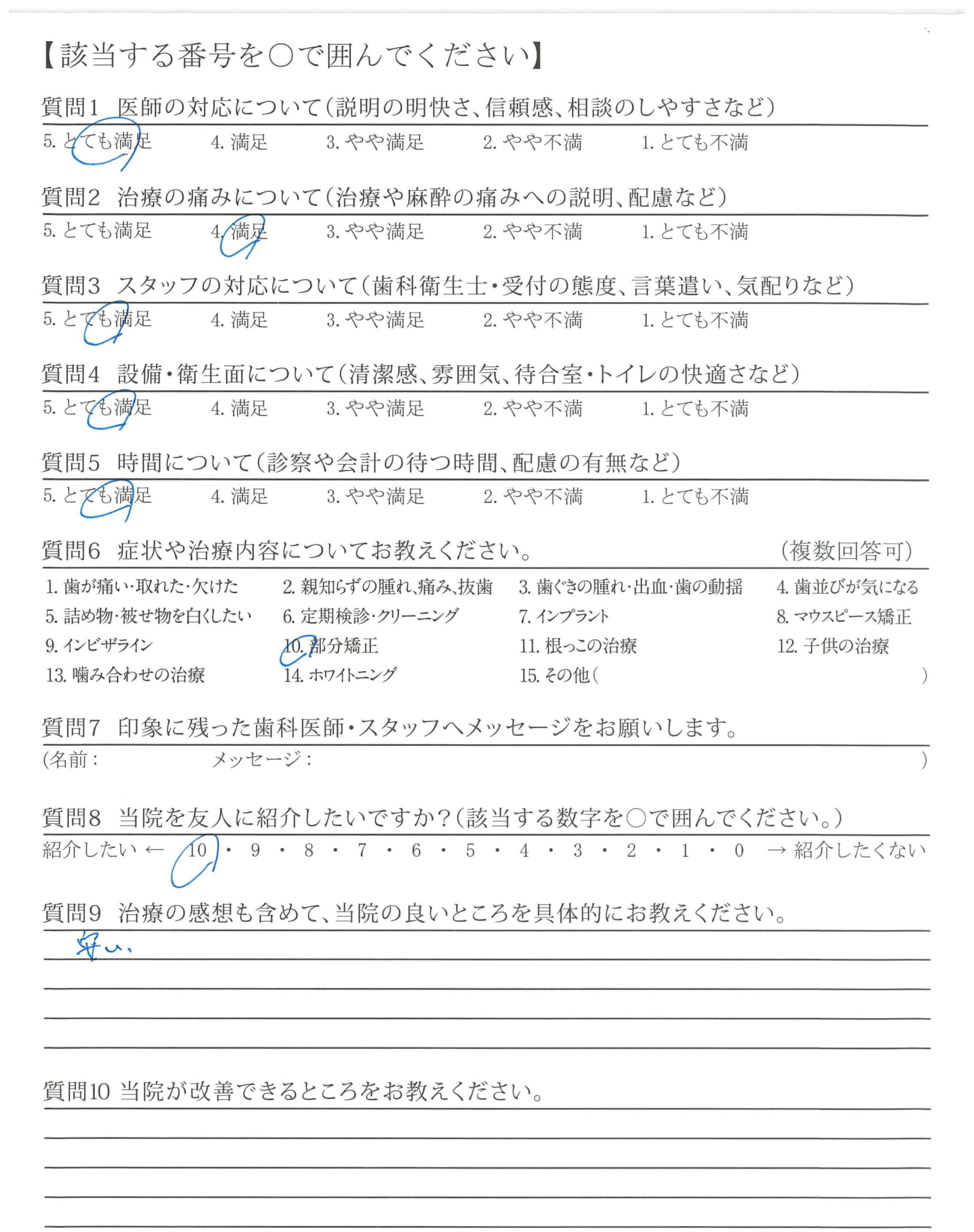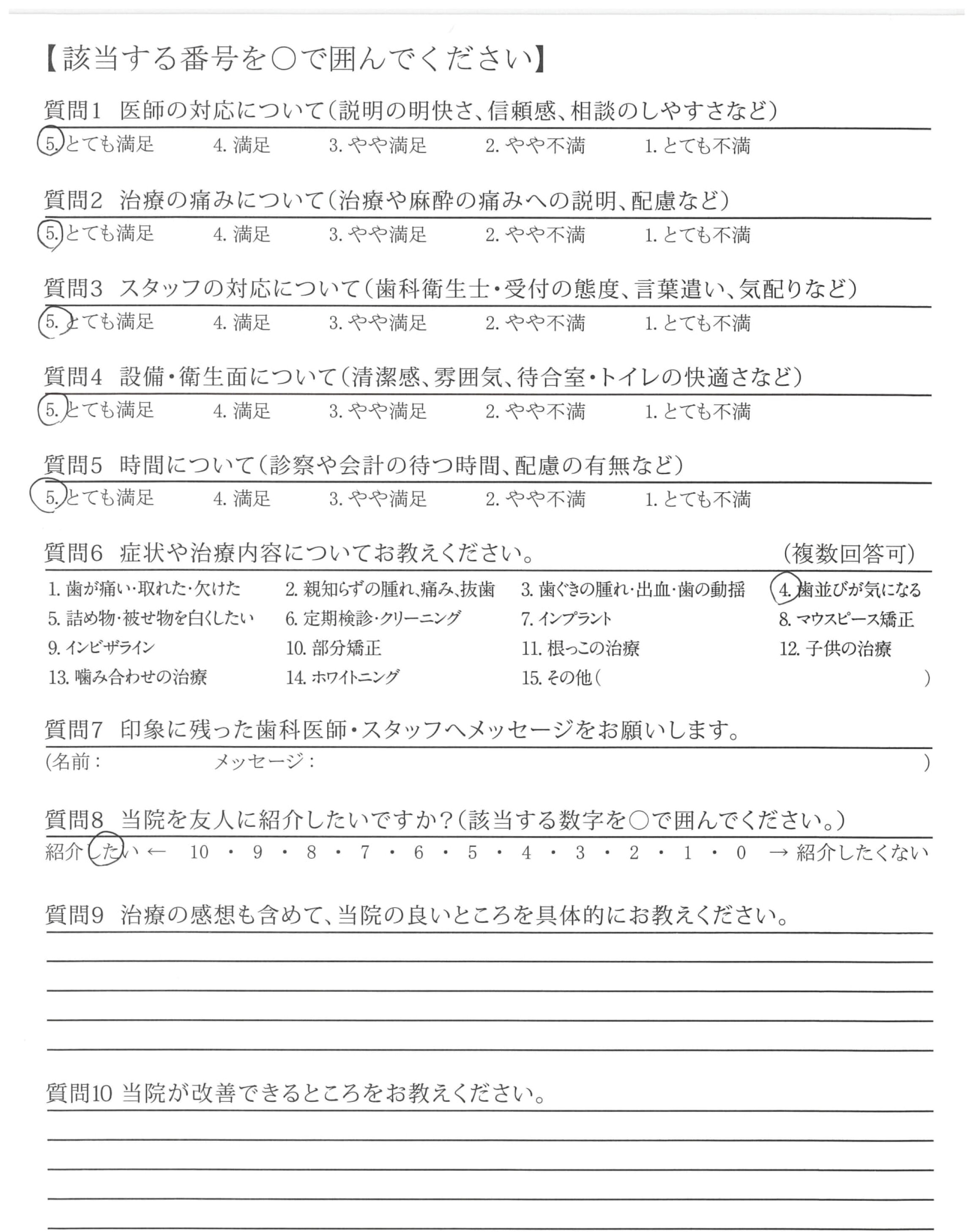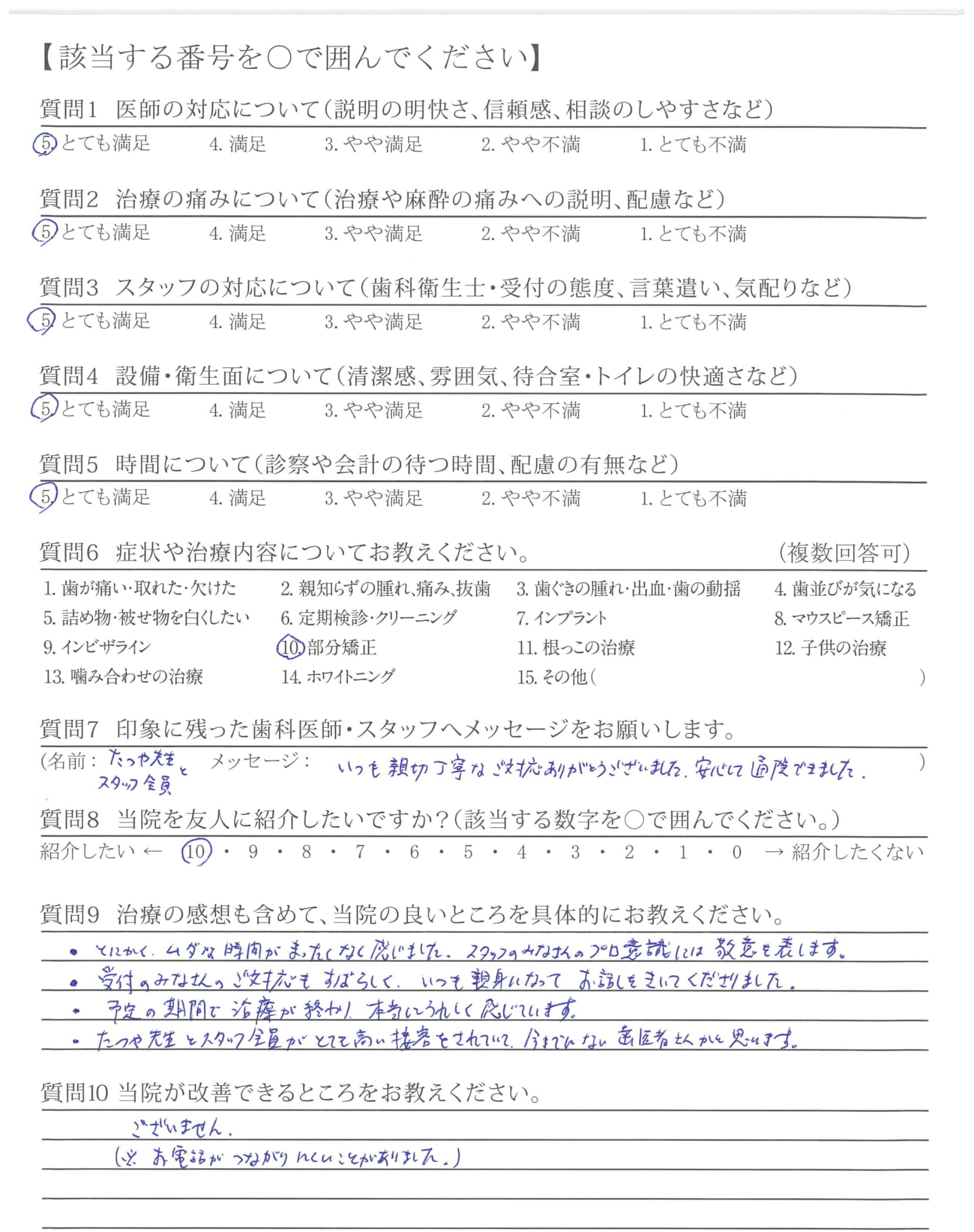 ワイヤーの部分矯正で非常に効果を感じられました。また、受付の方、先生、衛生士の方、皆さん丁寧に説明してくださるので不安、不満がありませんでした。