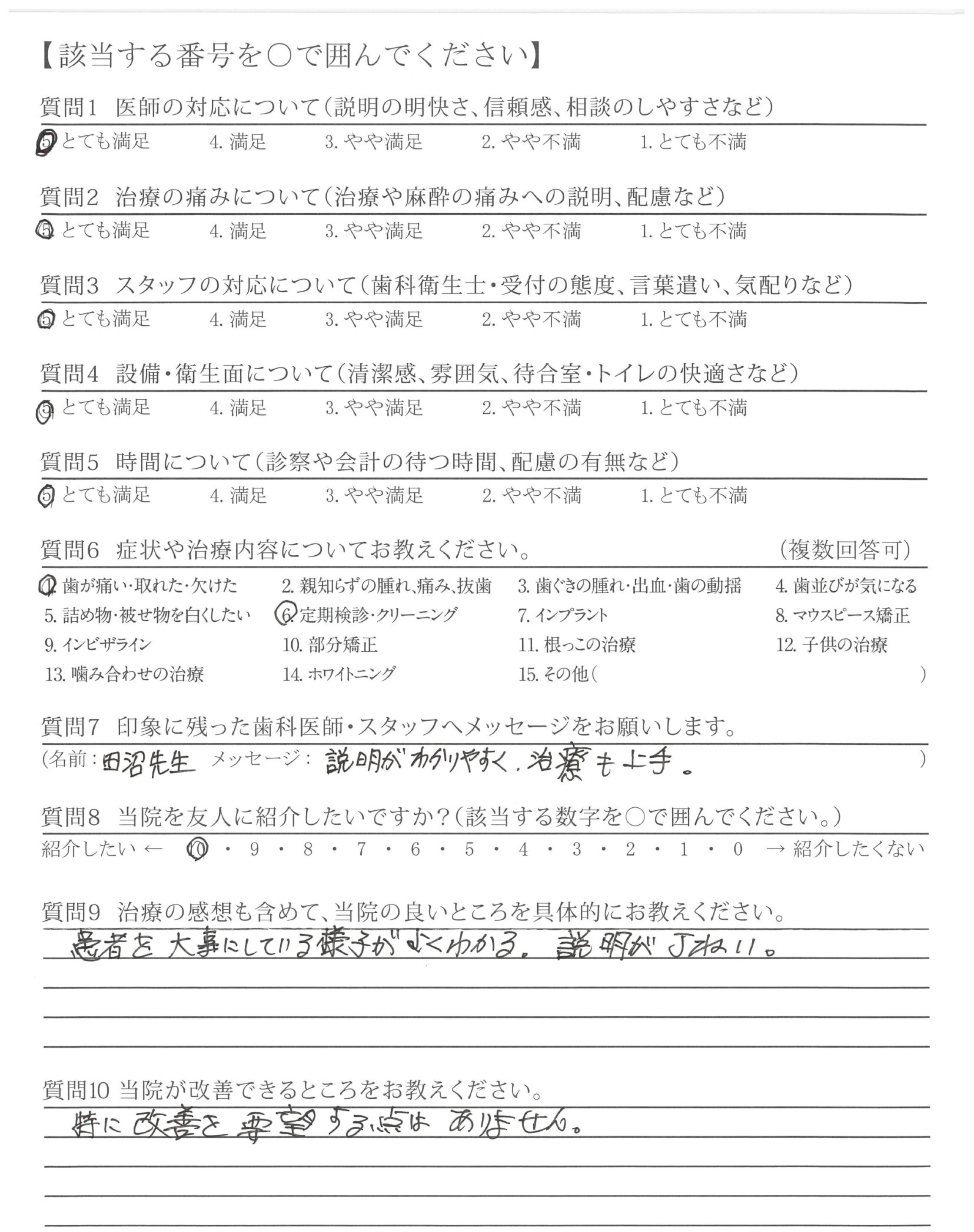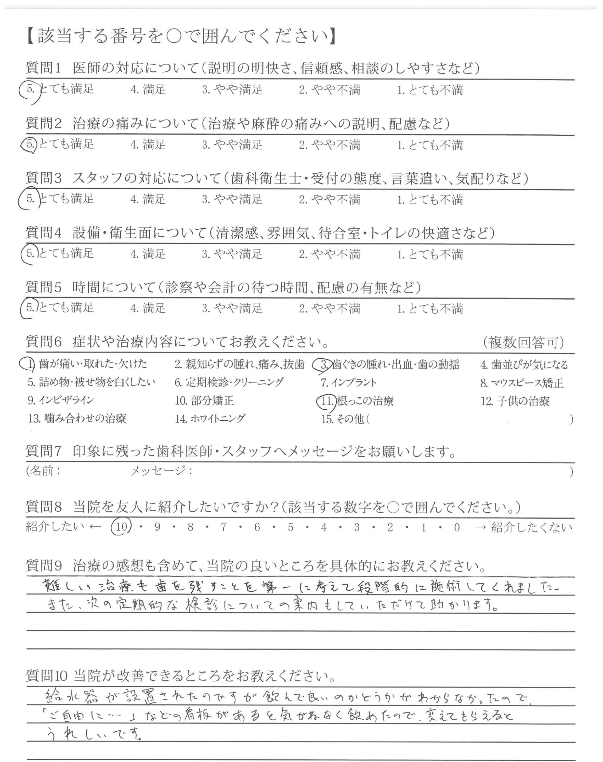 初診時のアンケート通り、希望に促した対応をしていただいたこと。またテキパキと最速・最短で治療していただきました。また、予約した時間通りに、全く待ち時間無く治療開始していただきとても信頼できました。