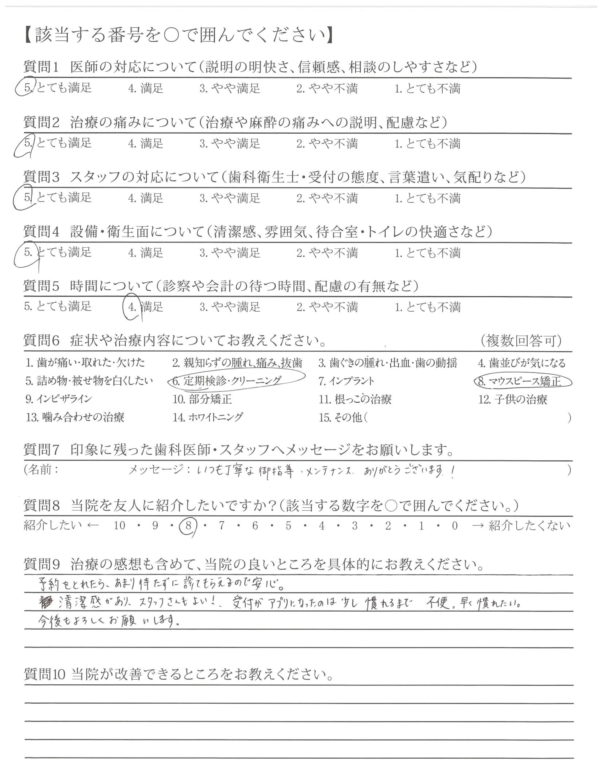 ・治療歴を含めて、口の状態を総合的にしっかり見ていただき安心しました。他院で不要な治療を受けたことがあるため歯医者自体に不信感がありましたが、こちらでは、治療前にきちんとカウンセリングもあり、治療方針も選択肢をもたせてえらばせてもらえるので、納得して治療が受けられました。