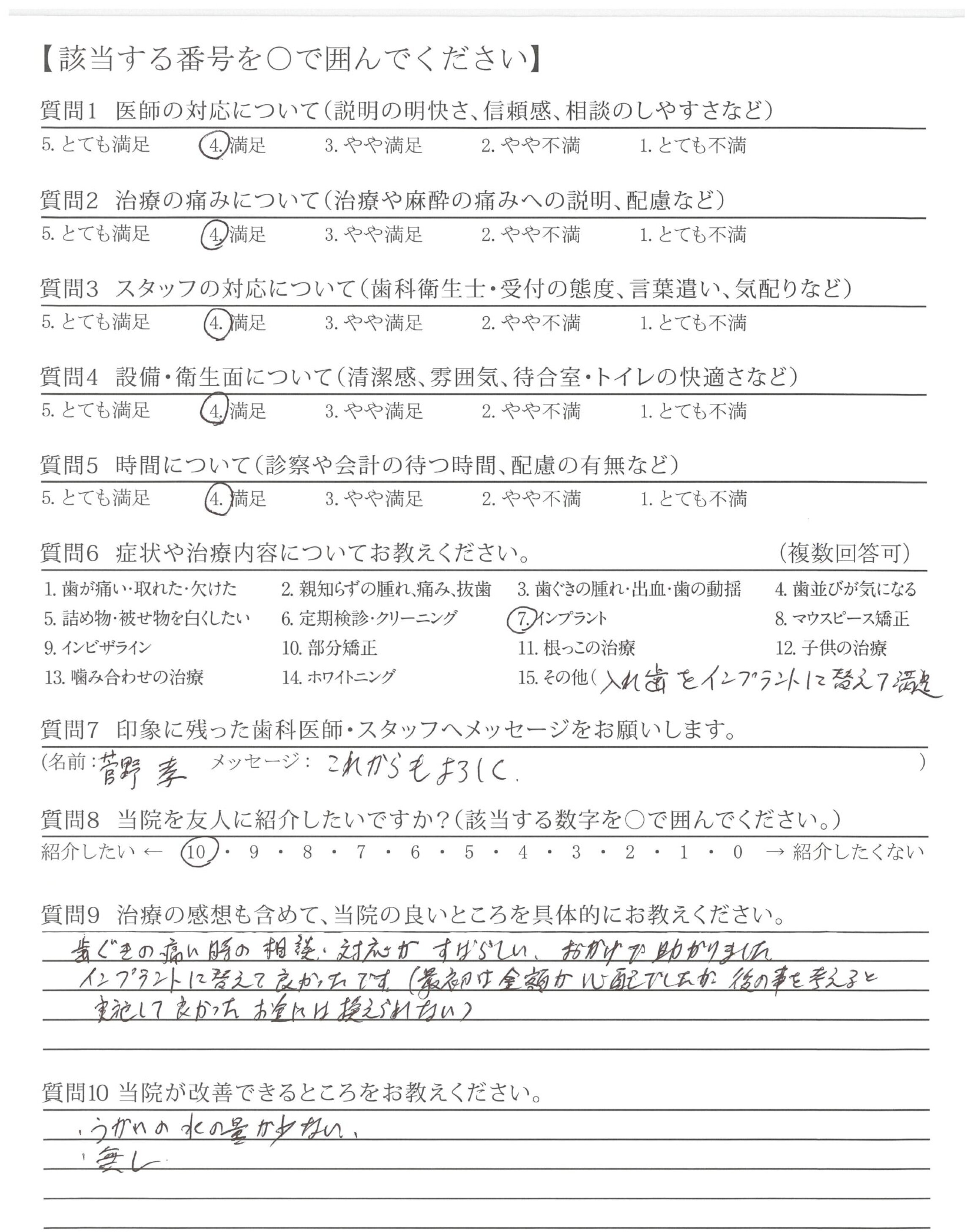インプラントに替えて良かったです。(最初は金額が心配でしたが、後の事を考えると実施して良かった、お金には換えられない)