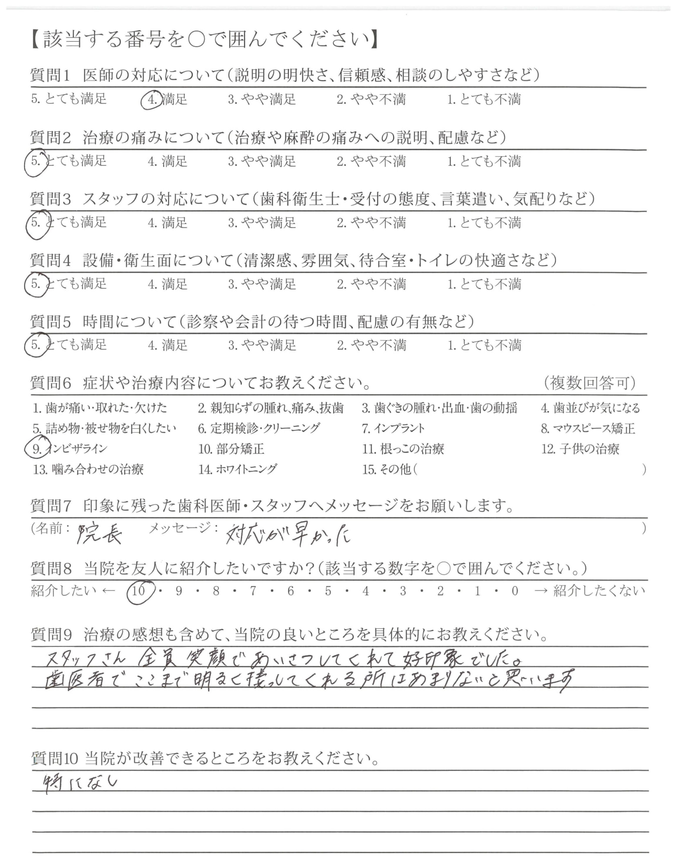 安心できる院との事で娘の紹介で受診しました。他院での先生の対応の悪さやインビザラインの治療で下の左2が前に出ないのに納得がいかないとの相談に親切に対応してくれました。また前歯のセラミックと他の歯との色の違いでホワイトニングもやり、歯科衛生士の経験やアドバイスをしっかり話して下さり、満足でした。