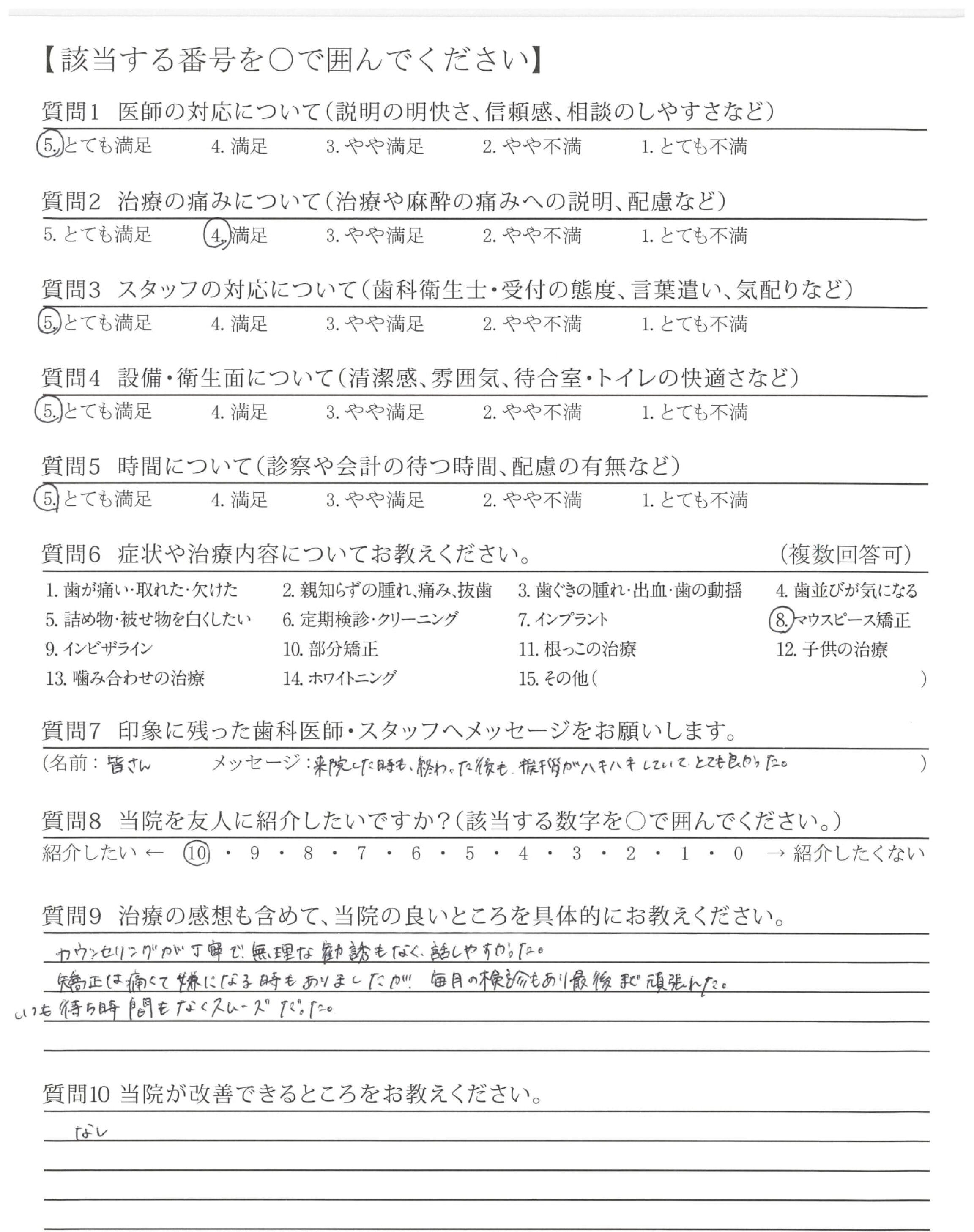 矯正というと長い期間、通い続けるイメージでしたが、娘の場合マウスピース矯正で短期間で治ると説明され、半信半疑でしたが本当に短期間で治療が終了し驚きました。見た目もよくなり、大変満足しております。