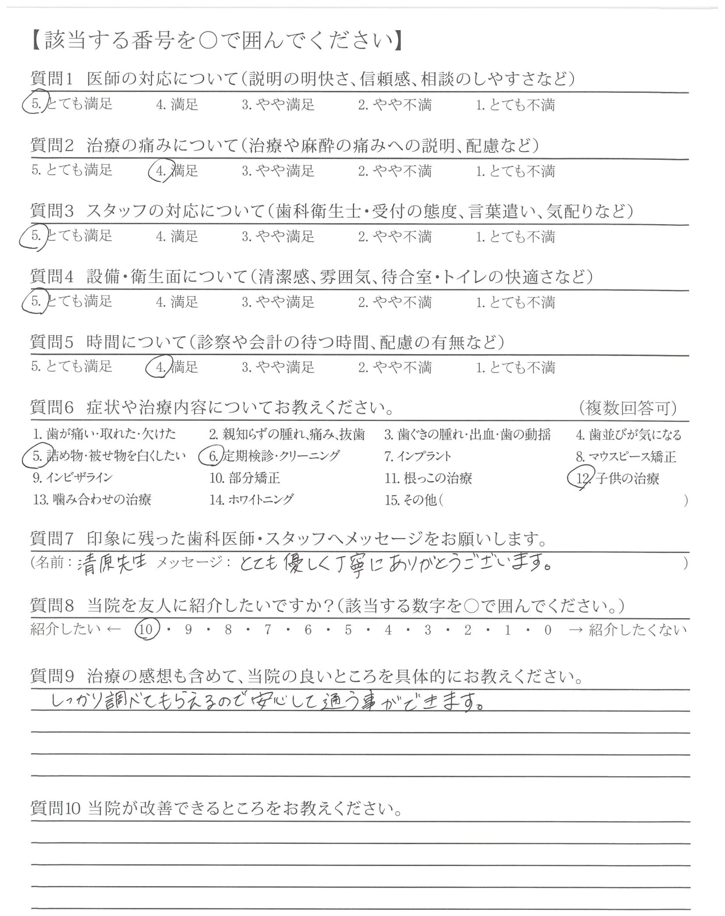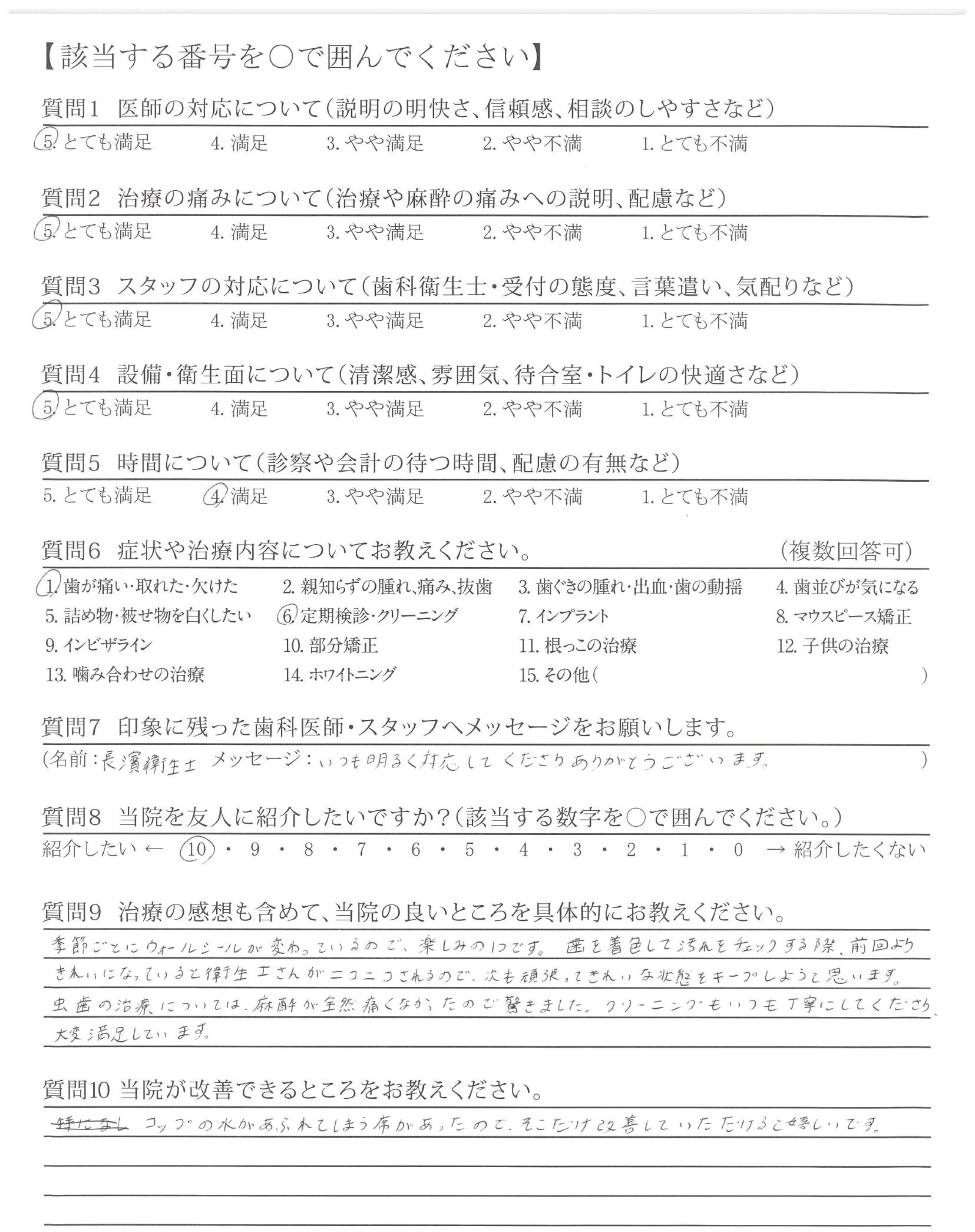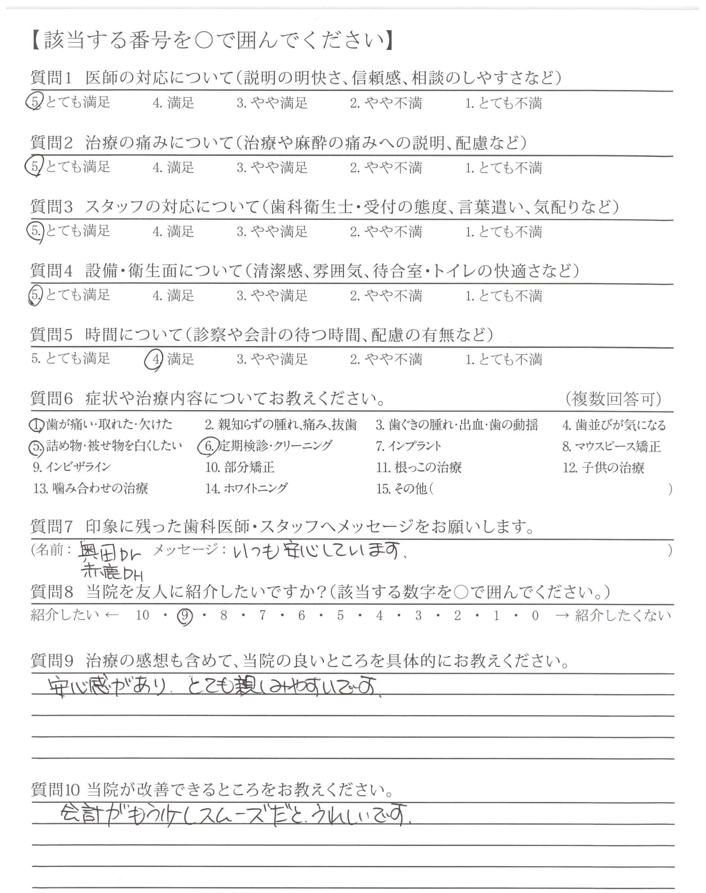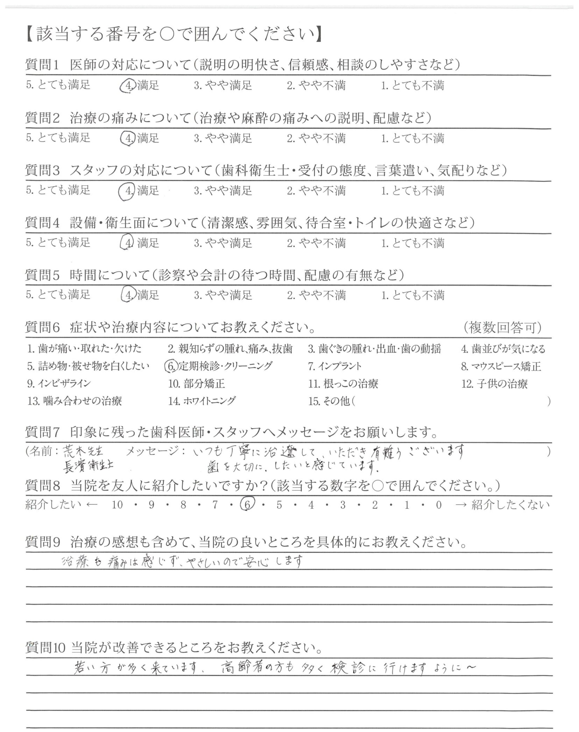 いつも丁寧に治療して、いただき有難うございます。歯を大切に、したいと感じています。