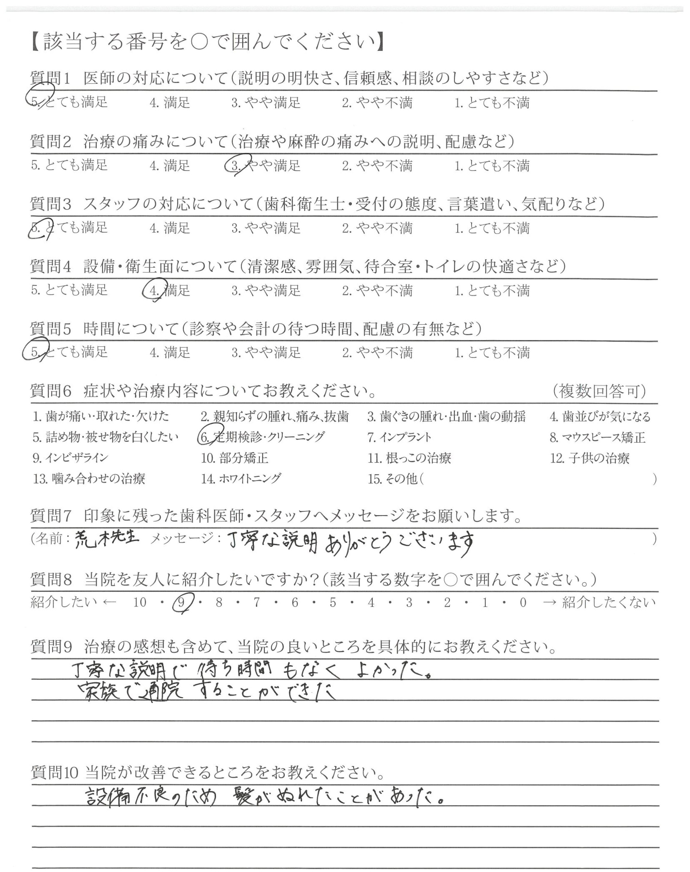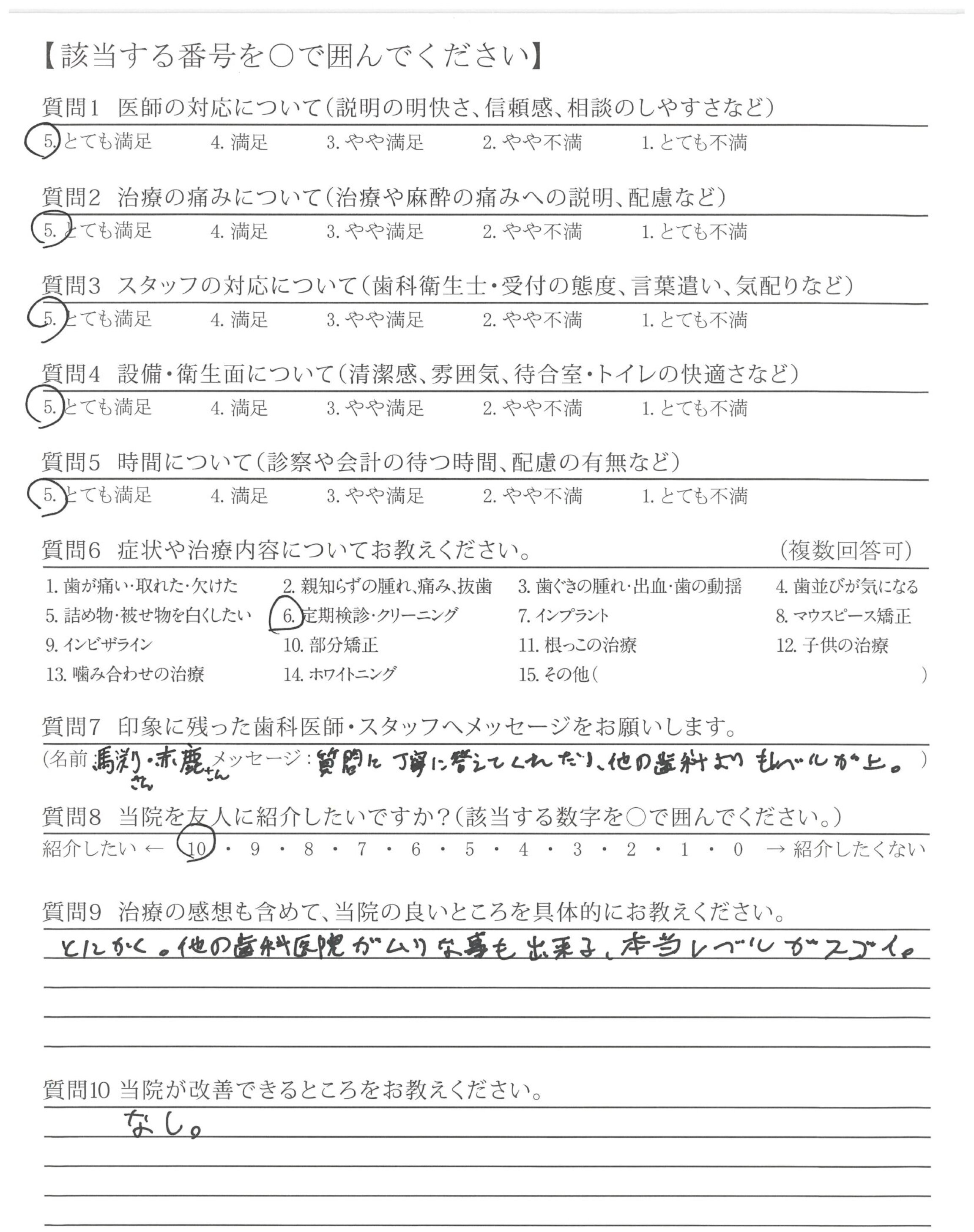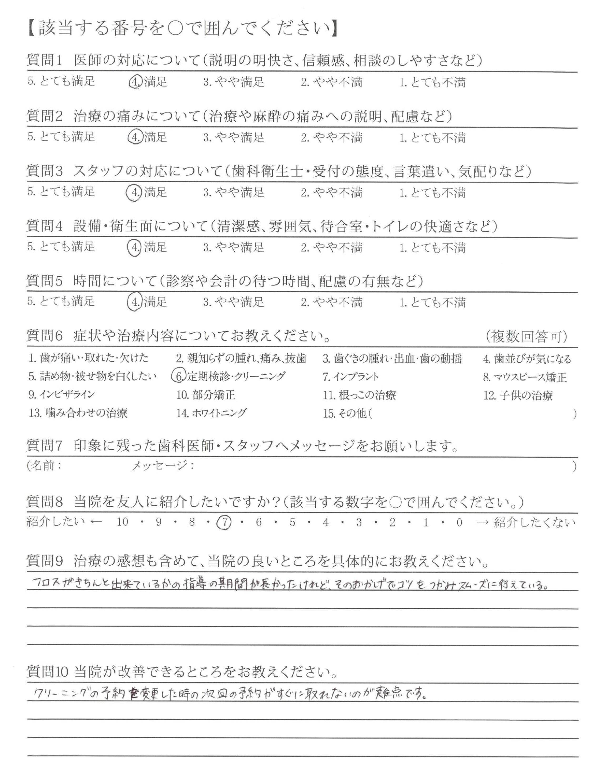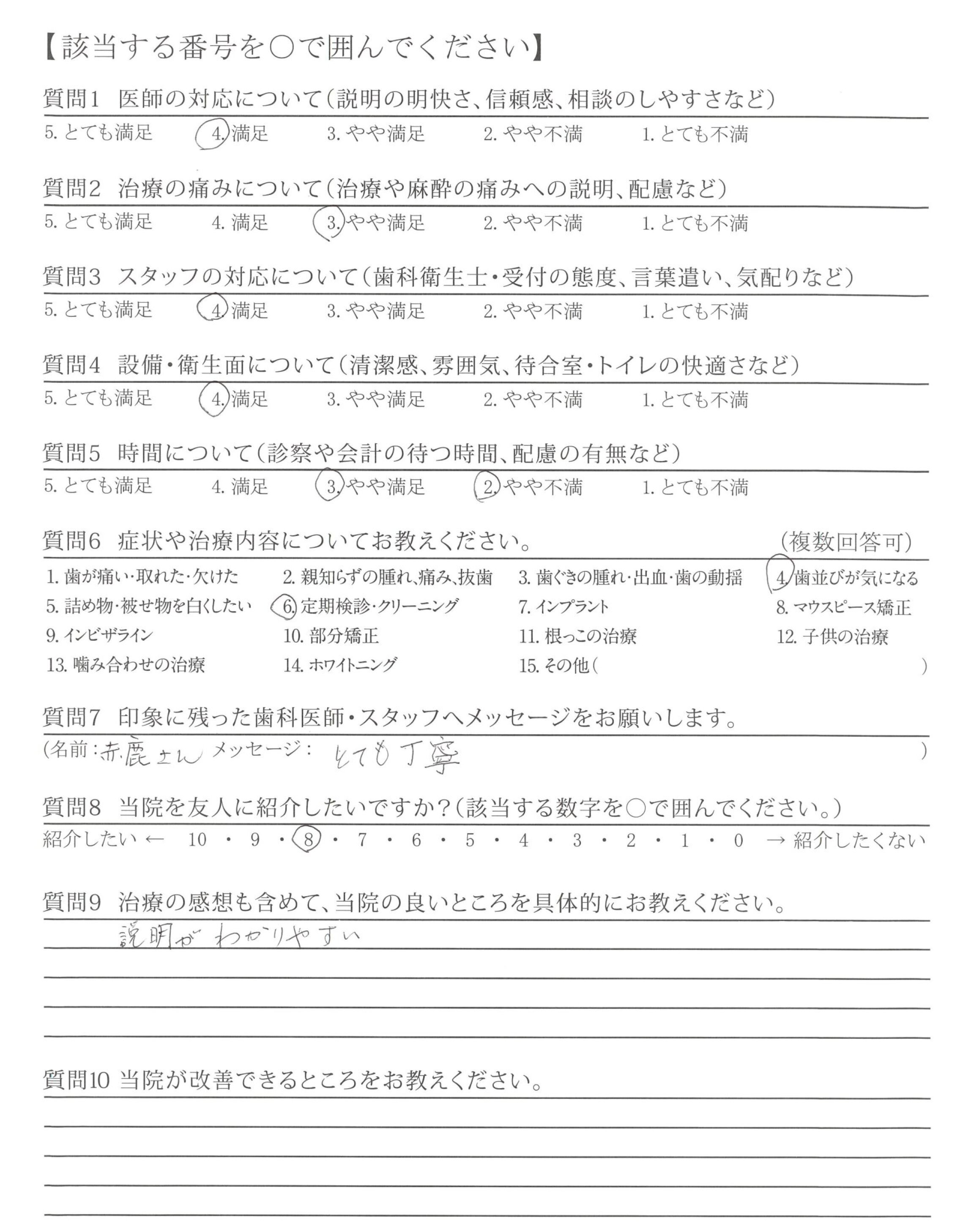 いつも丁寧に治療して、いただき有難うございます。歯を大切に、したいと感じています。