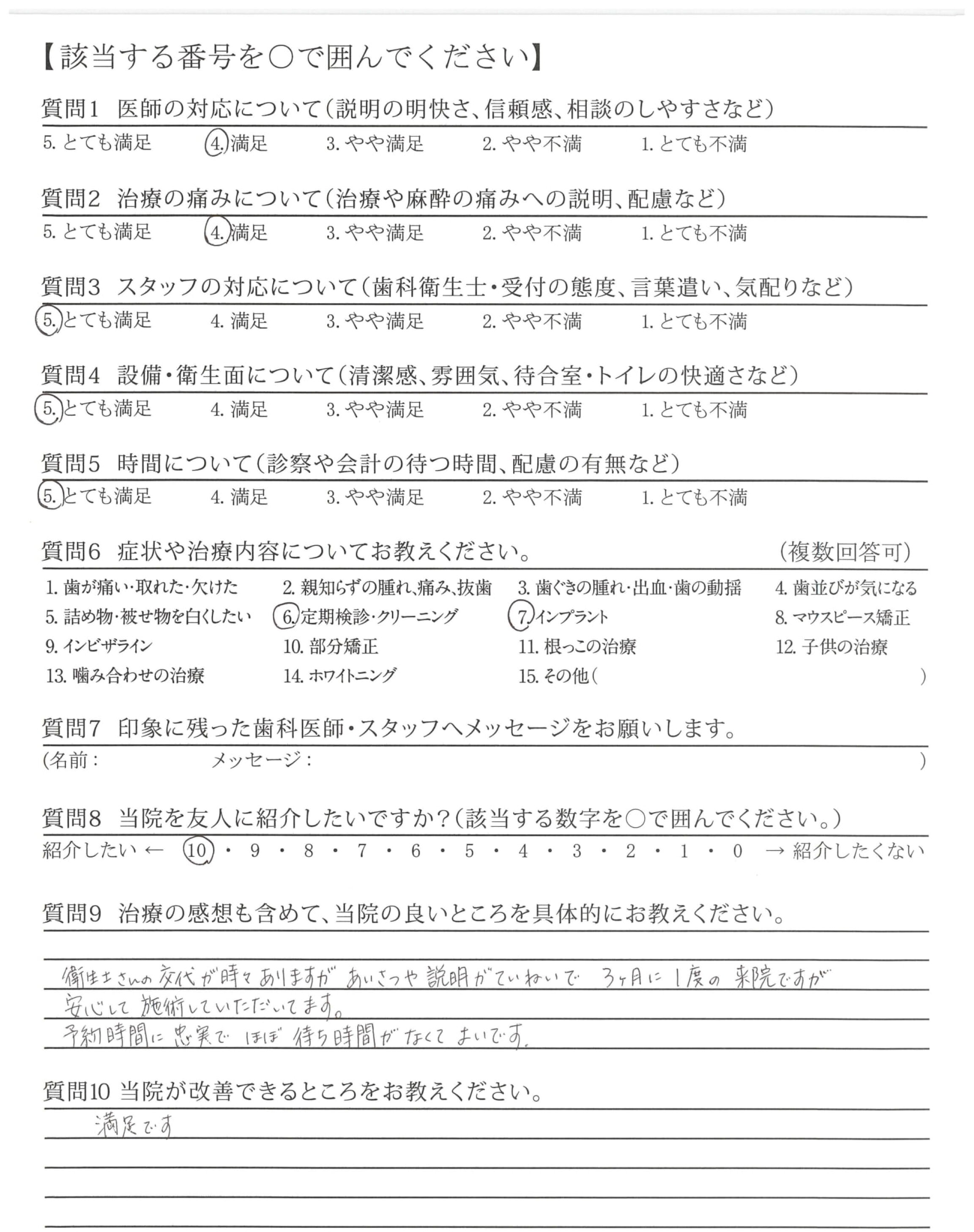 メンテナンスが主なので、スタッフの方が治療をして下さることが多いが、歯科医師の方とお話し、治療してもらったのが1回のみだったので、もう少し先生とのコミュニケーションの機会があってもよいのではと思った。