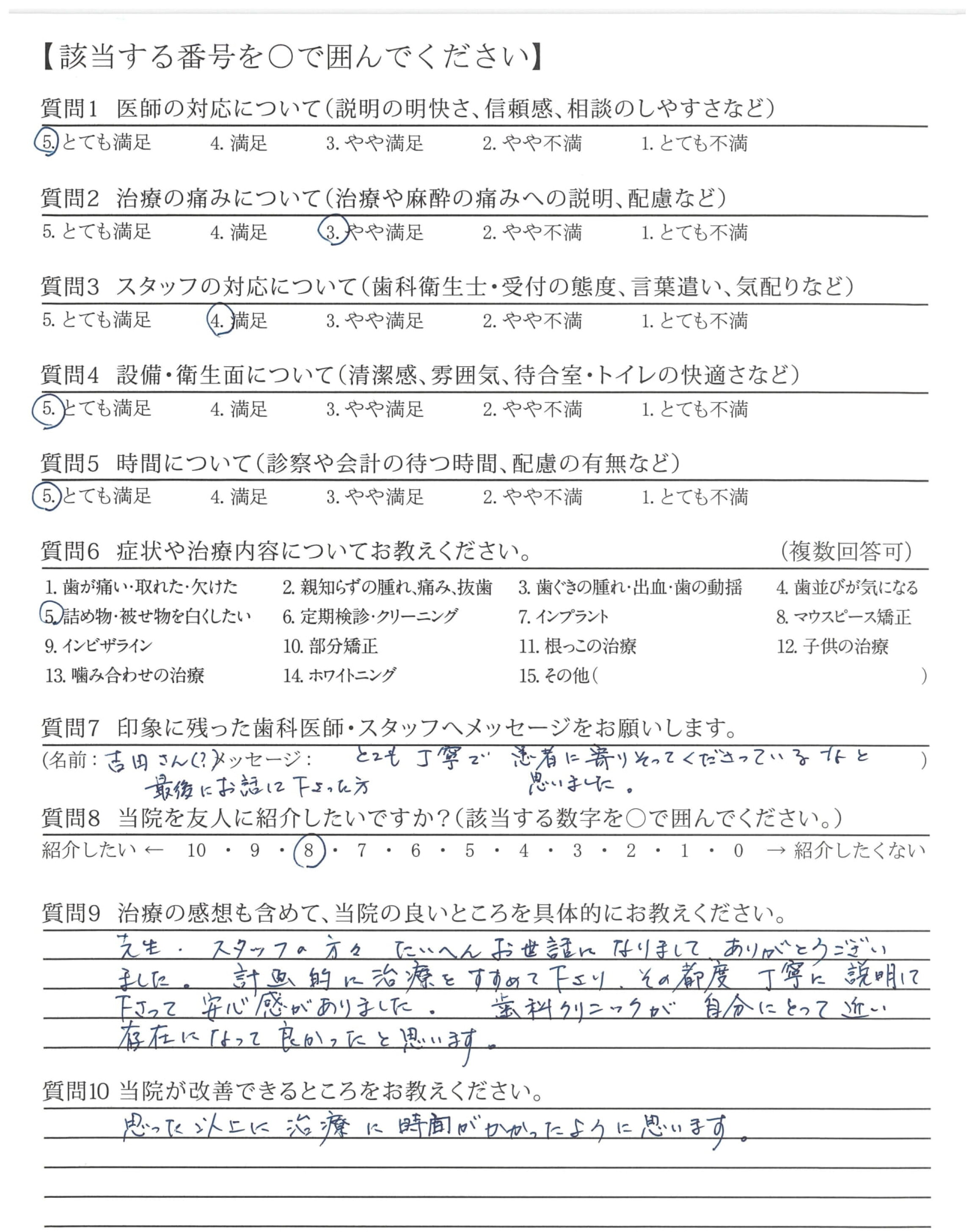 治療にいたしましても良くして頂き丁寧さもありとくに先生は手先が器用にみうけました。