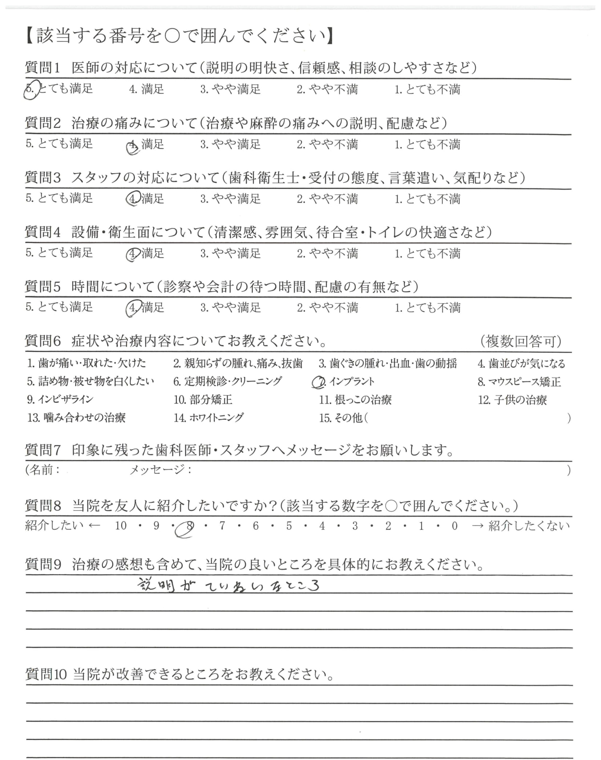 転院する前の歯科はレントゲンと歯ぐきチェック、1日8回でも歯みがきとスパルタ指導だけで先が見えなかった。転院してきて、入れ歯、インプラントなど様々な選択ができ、治療方針も説明を多くしてもらえ、時間も待つほどでは無く、通院に苦痛がない。転院してきてよかった。