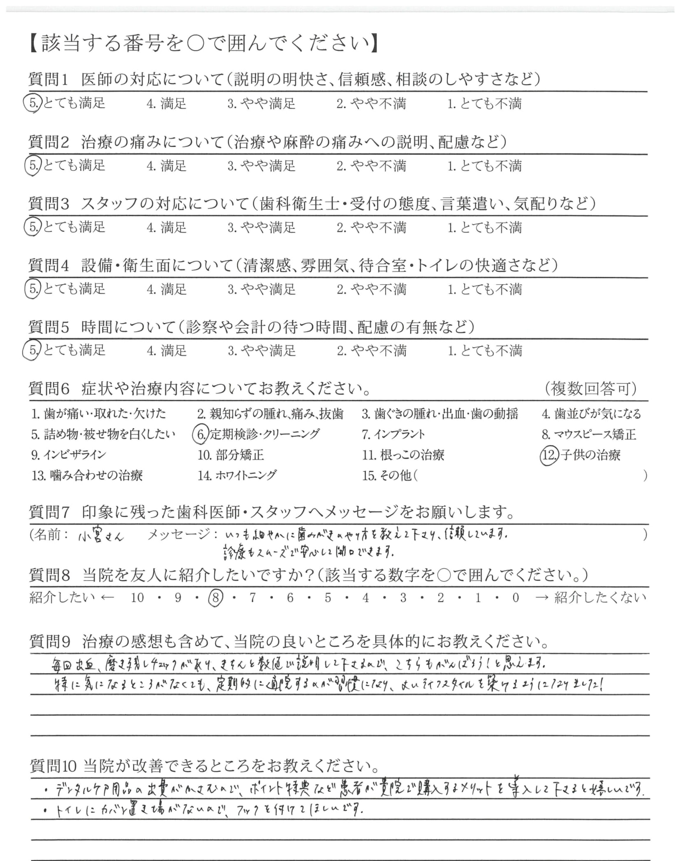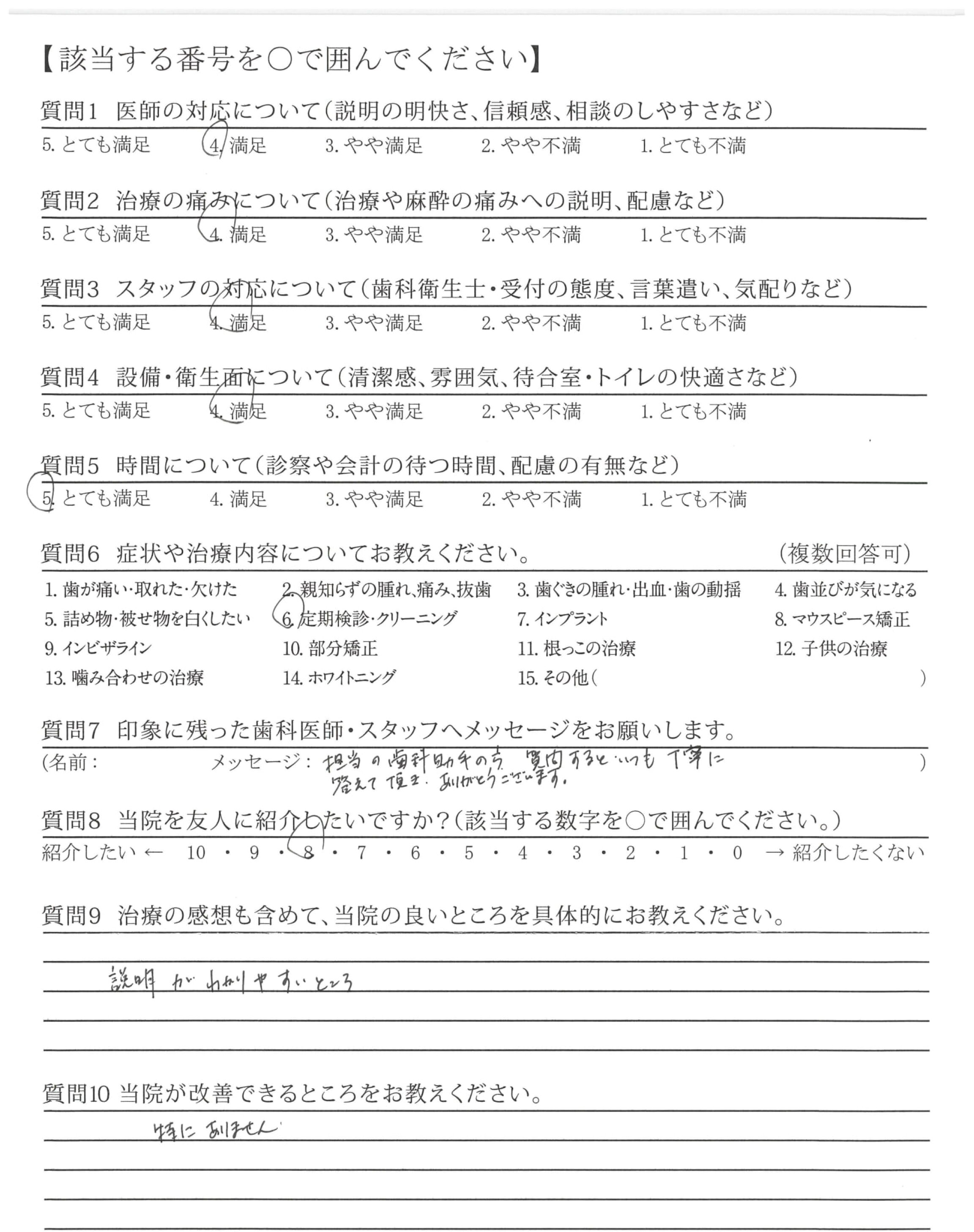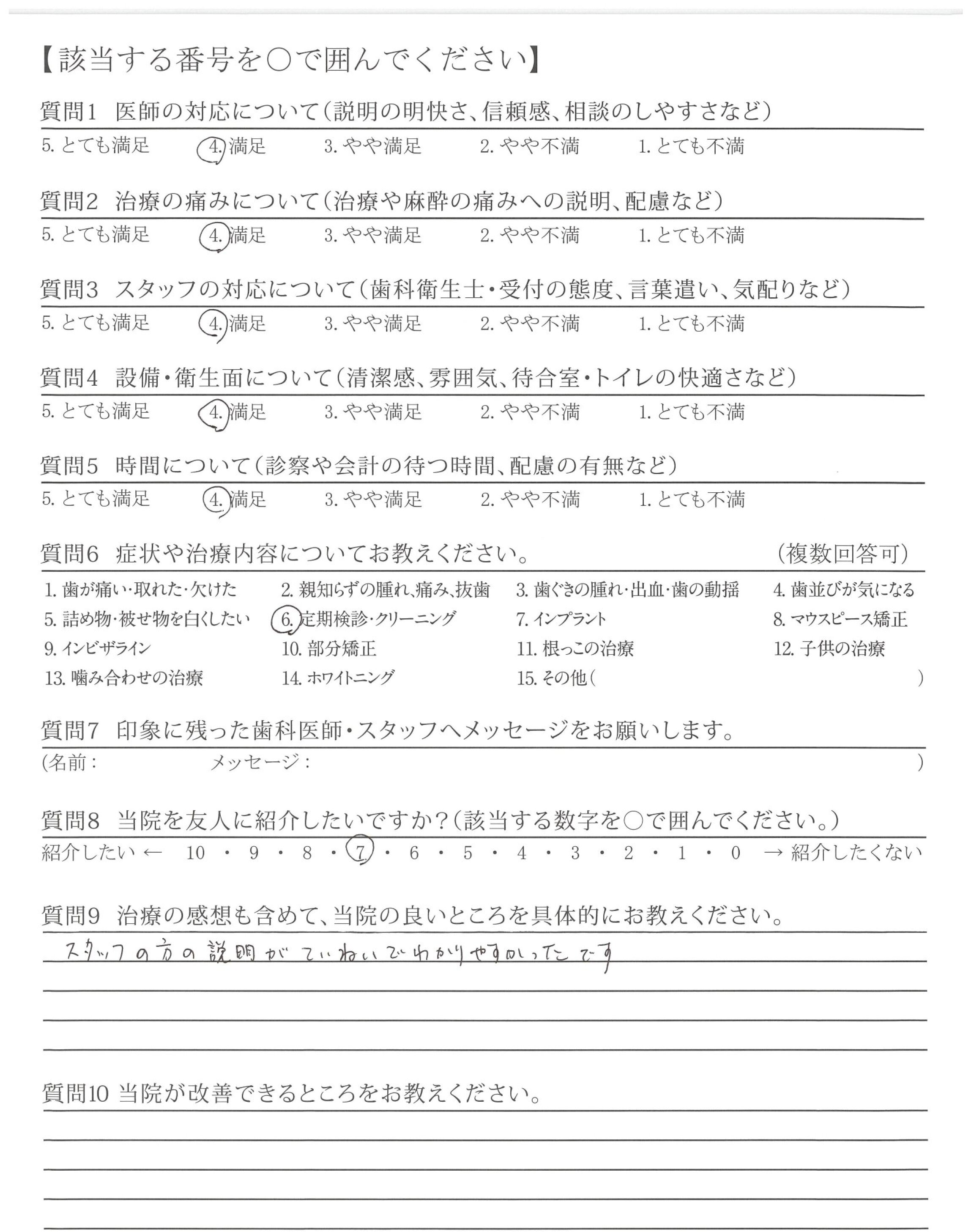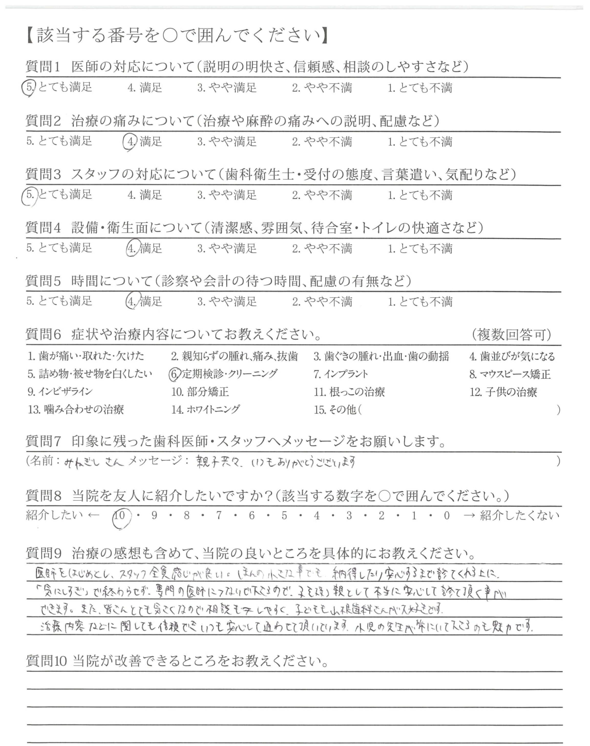 いつも細やかに歯みがきのやり方を教えて下さり、信頼しています。診療もスムーズで安心して開口できます。