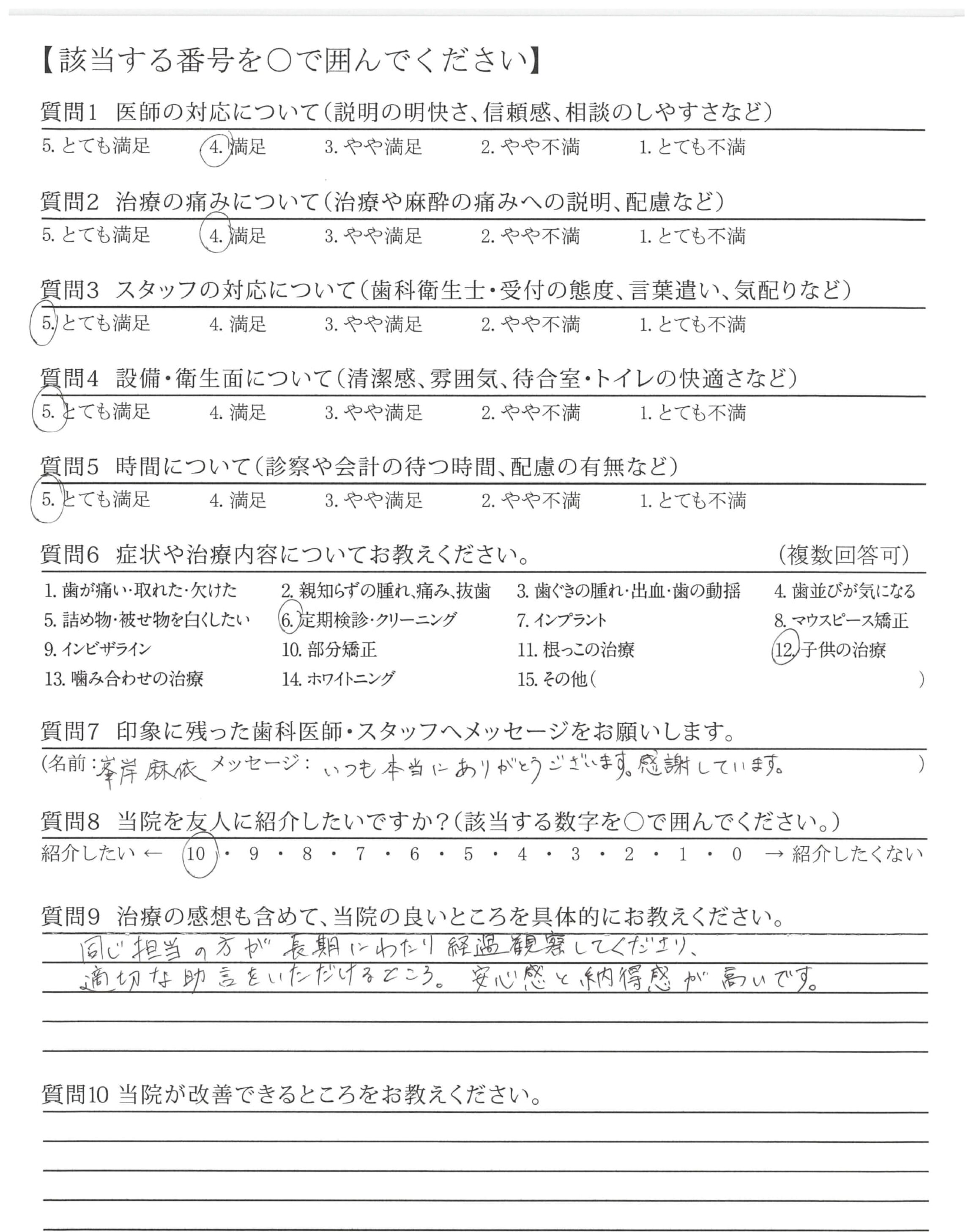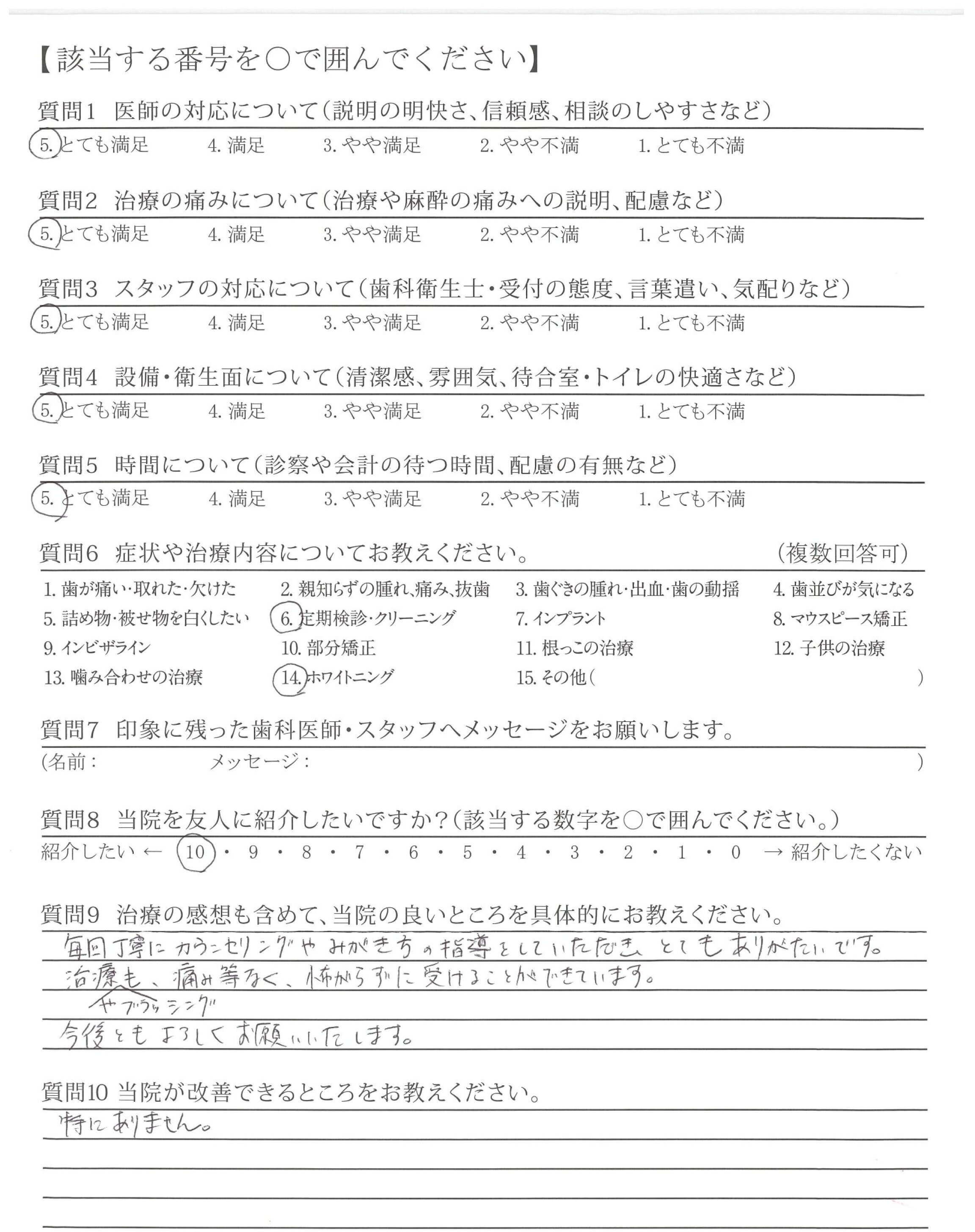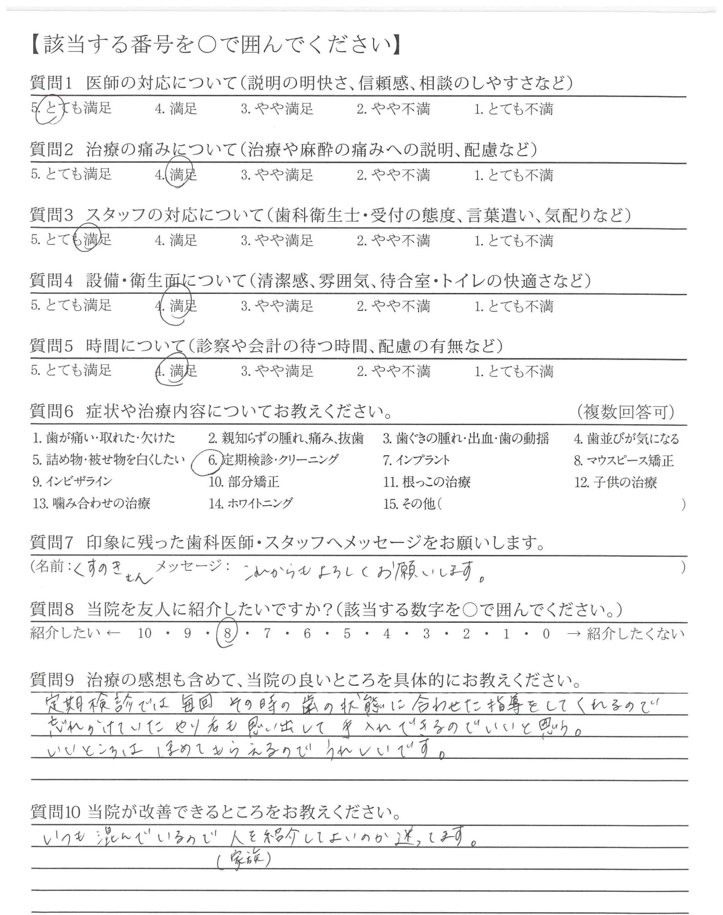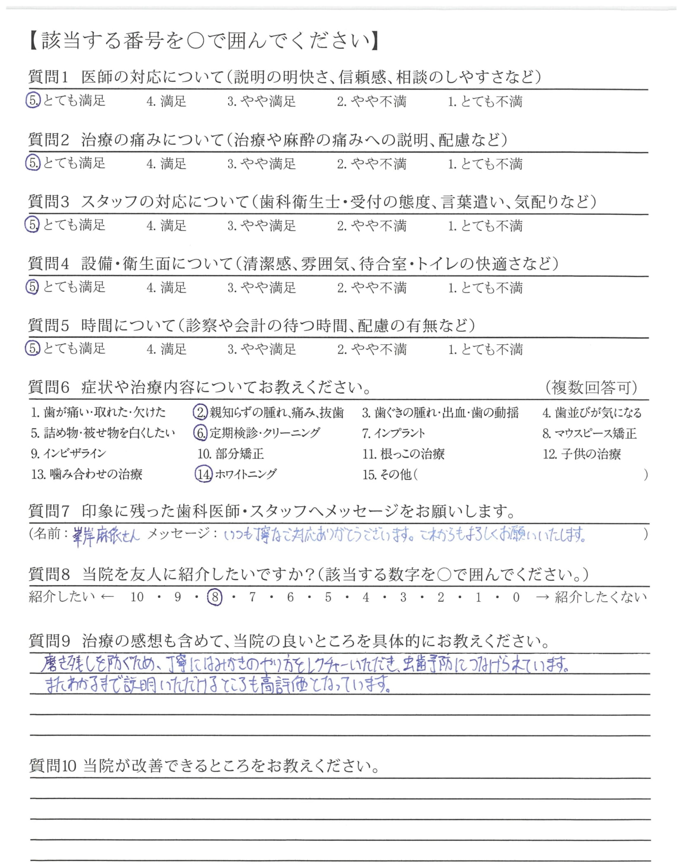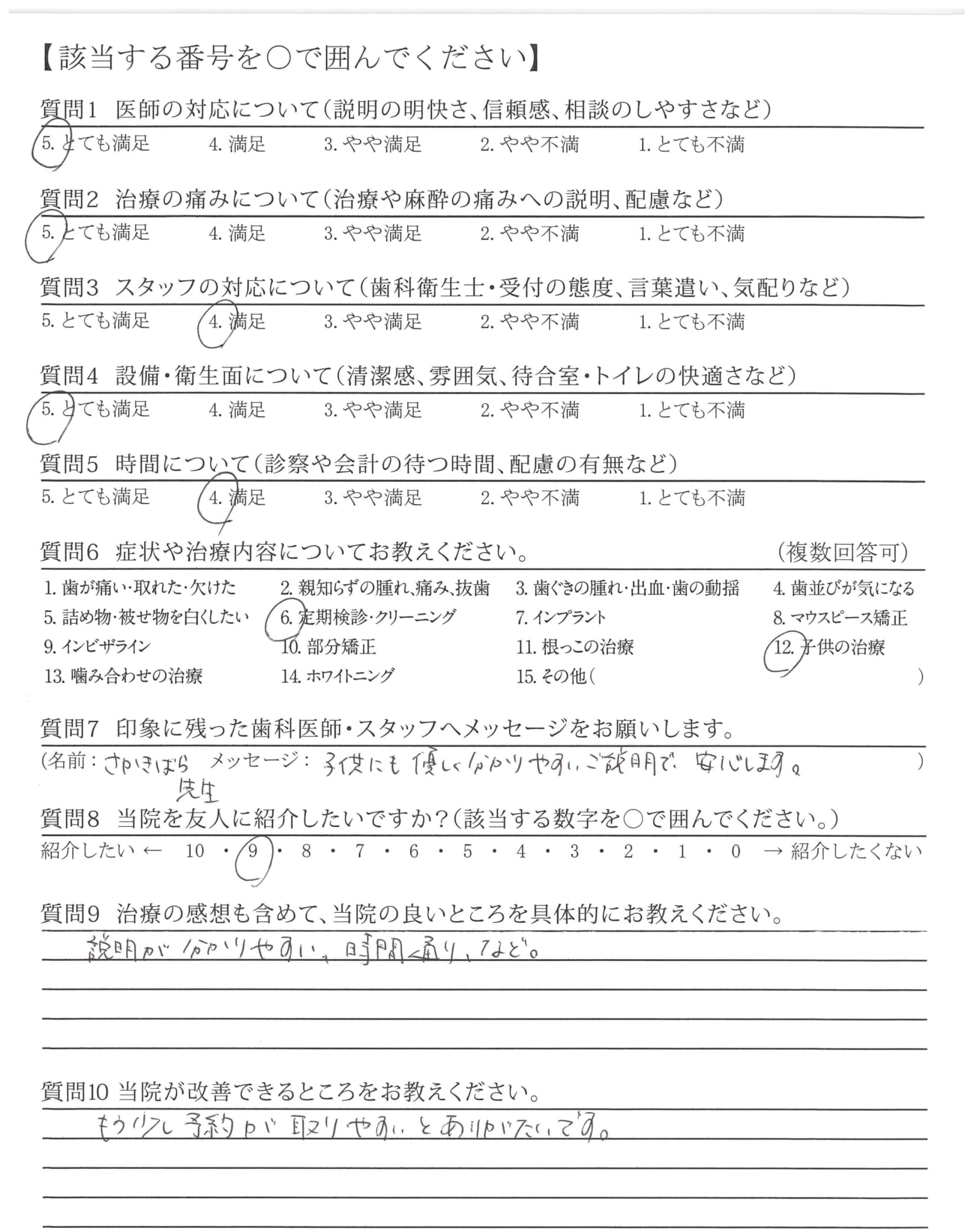 いつも細やかに歯みがきのやり方を教えて下さり、信頼しています。診療もスムーズで安心して開口できます。