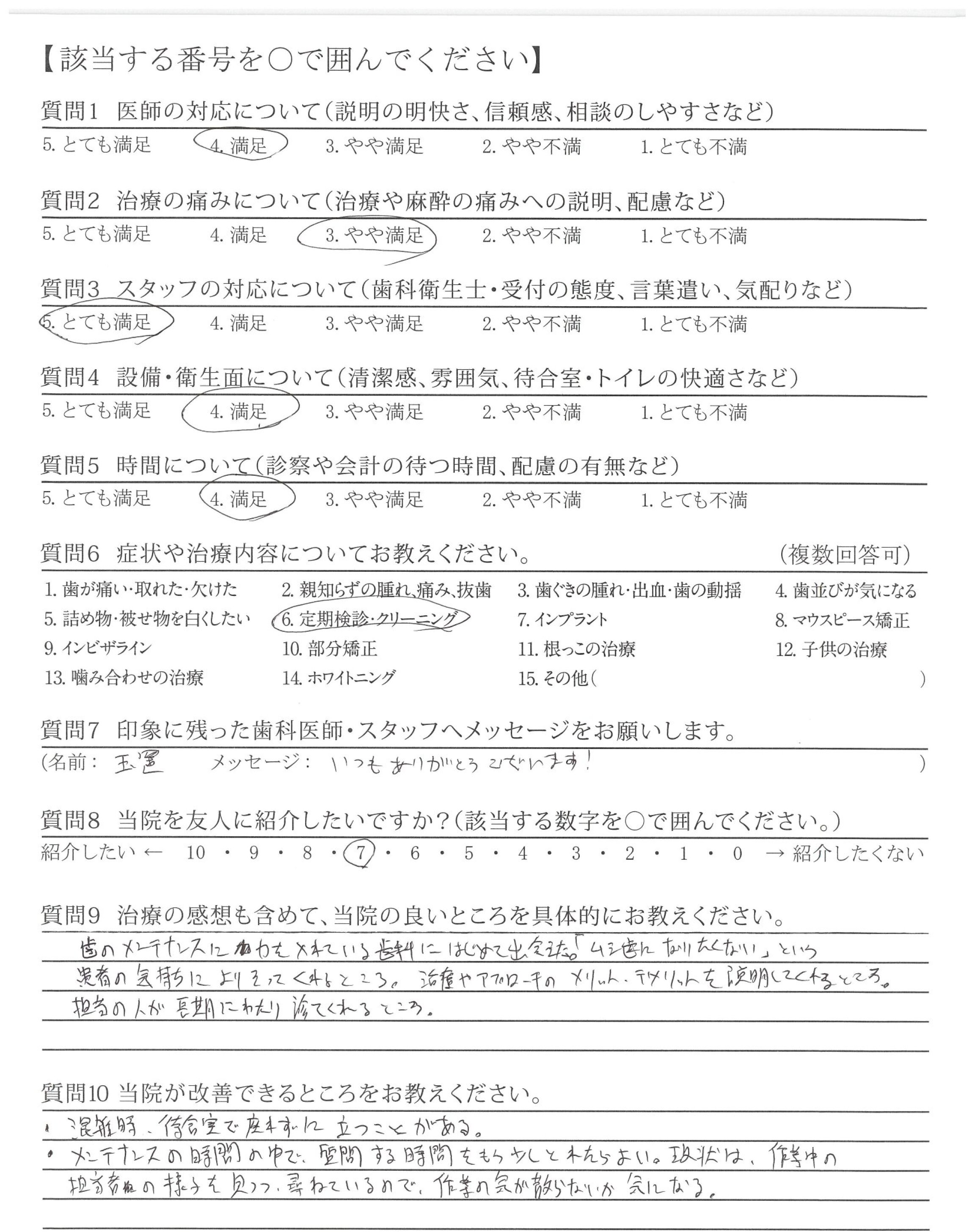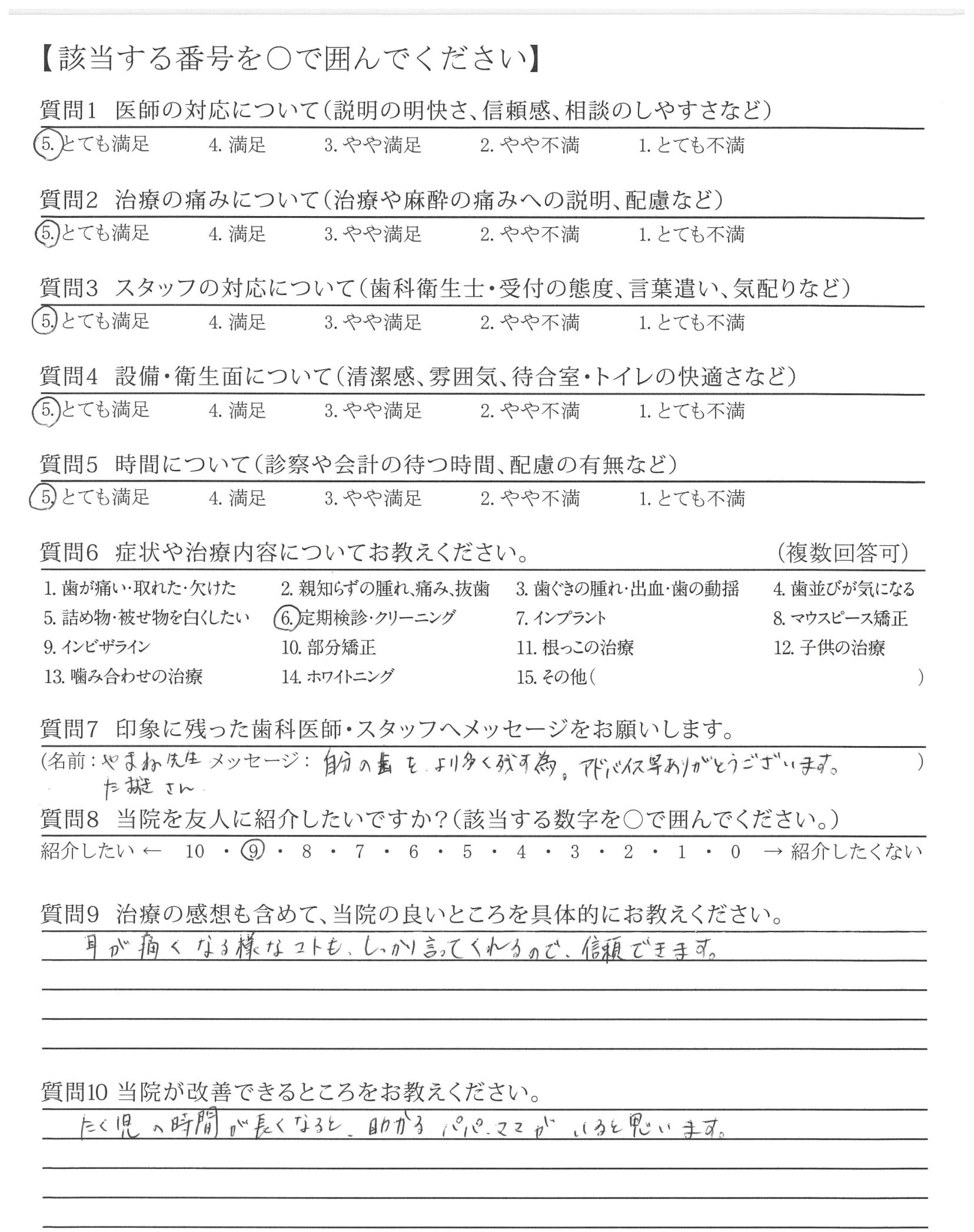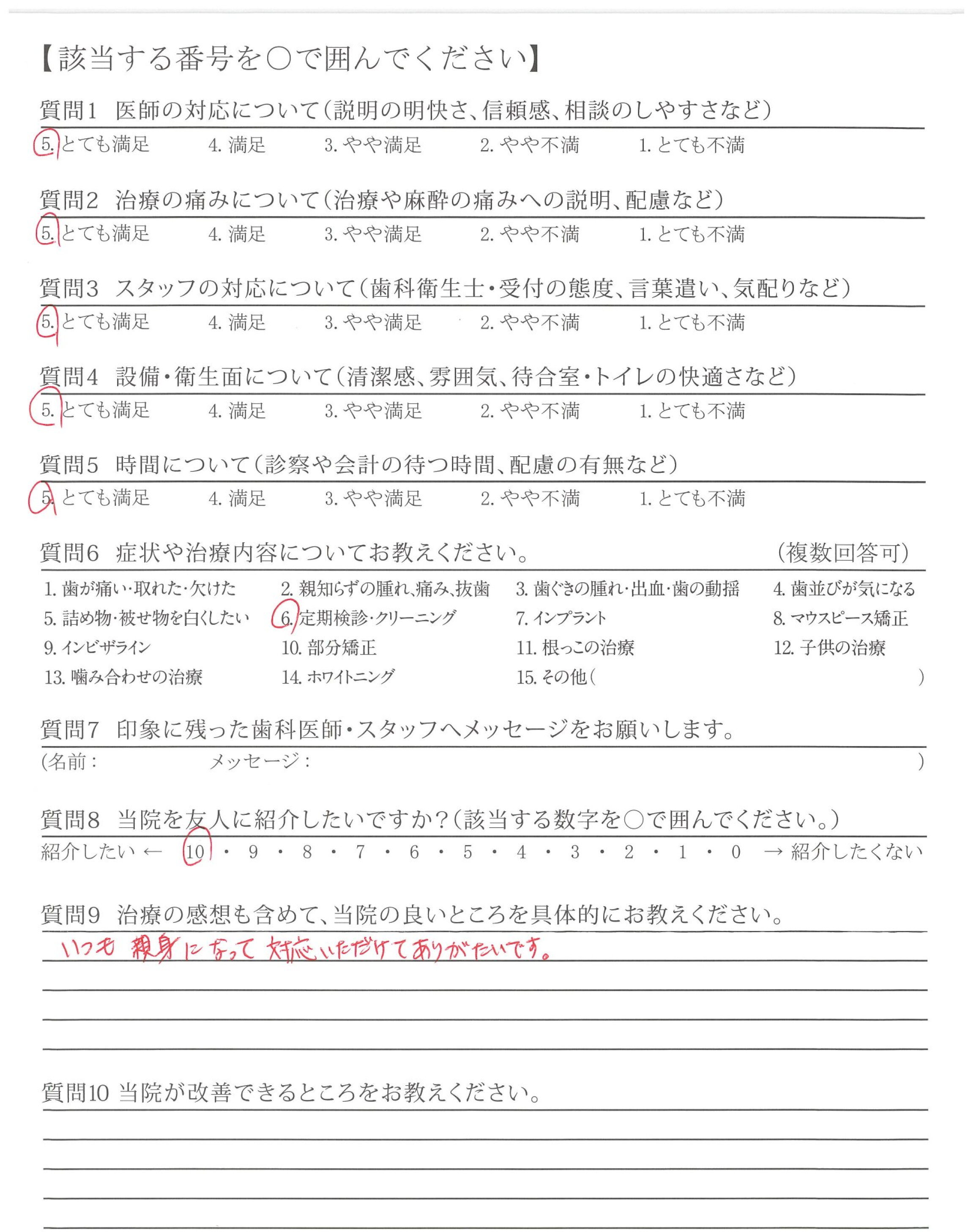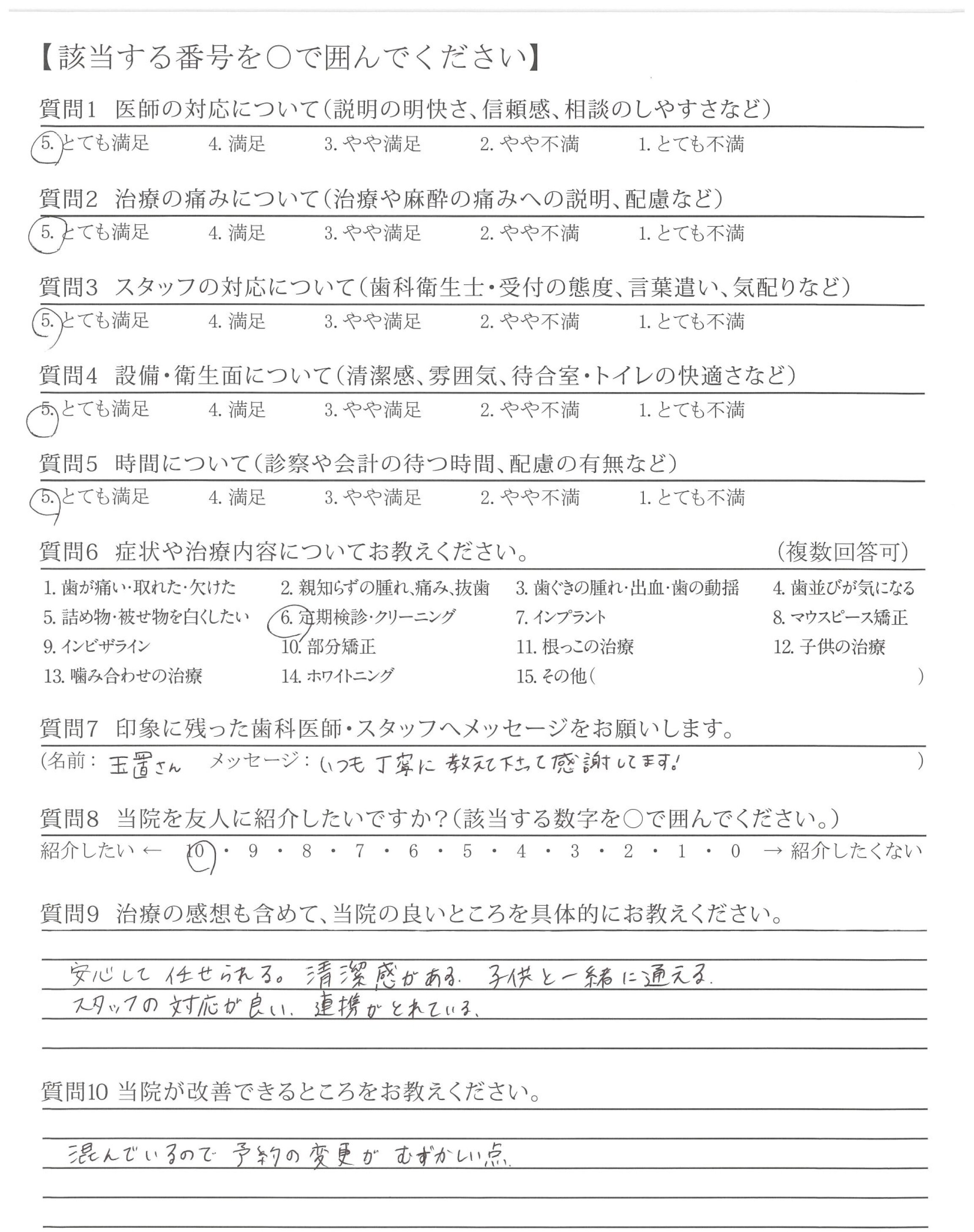 いつも細やかに歯みがきのやり方を教えて下さり、信頼しています。診療もスムーズで安心して開口できます。