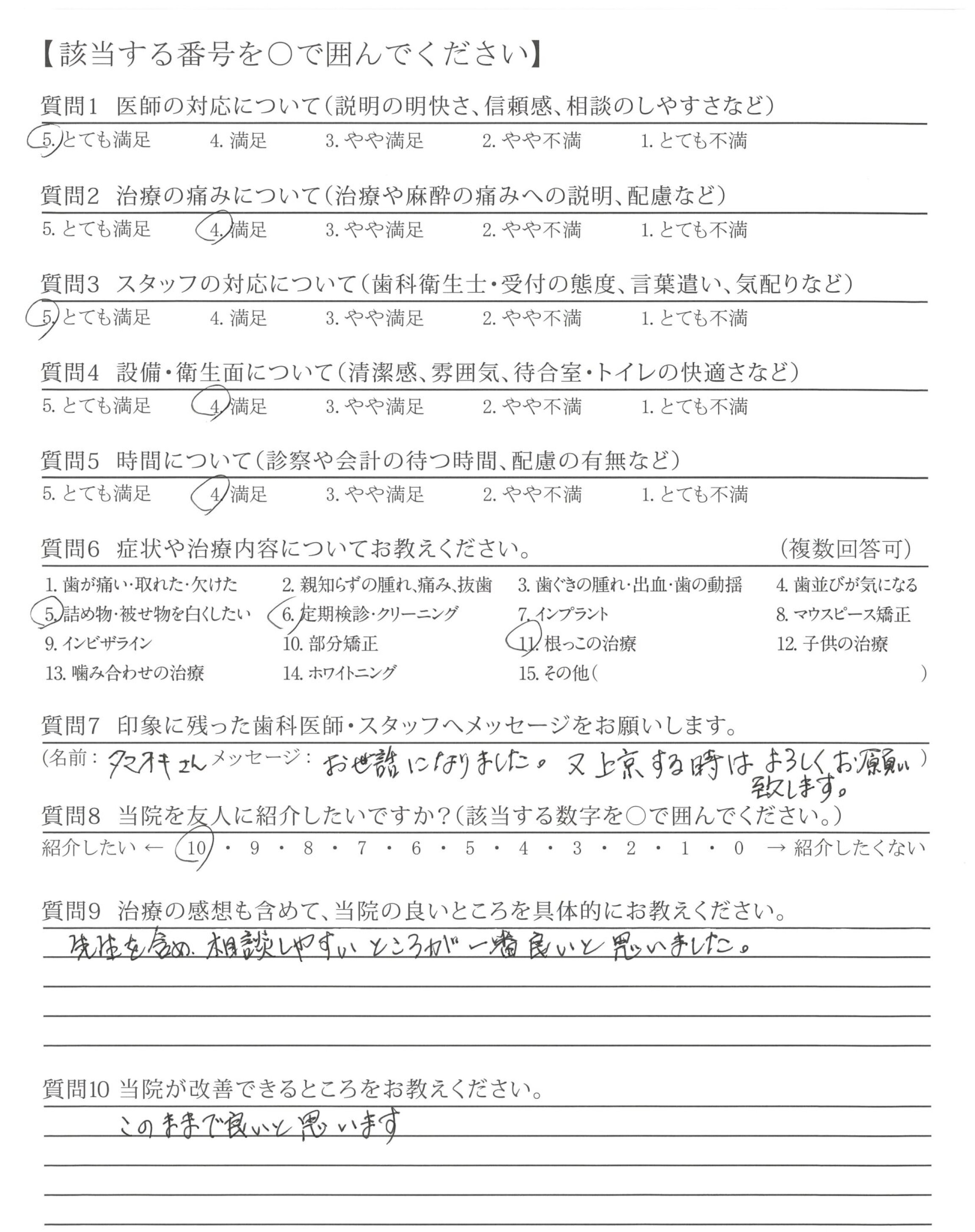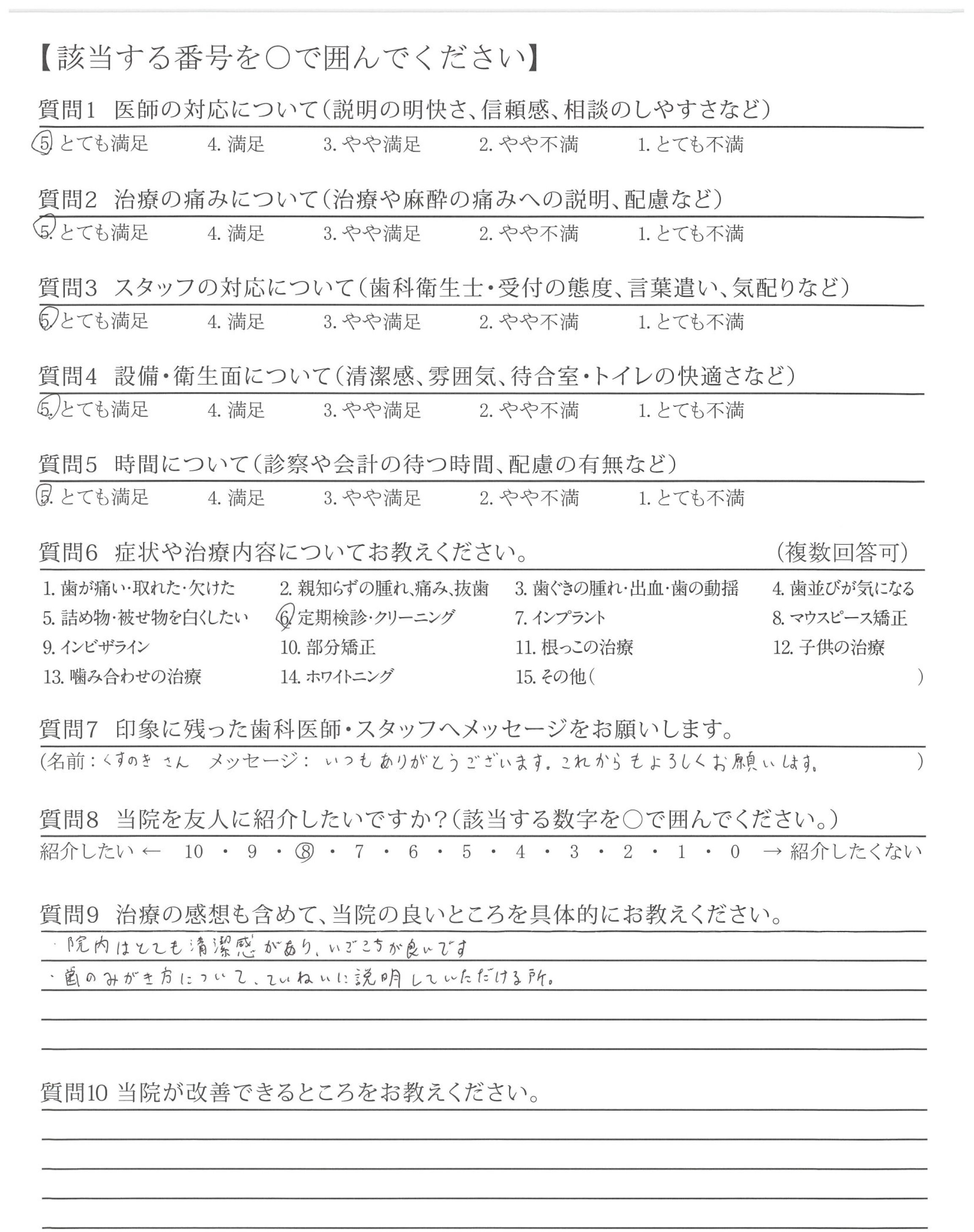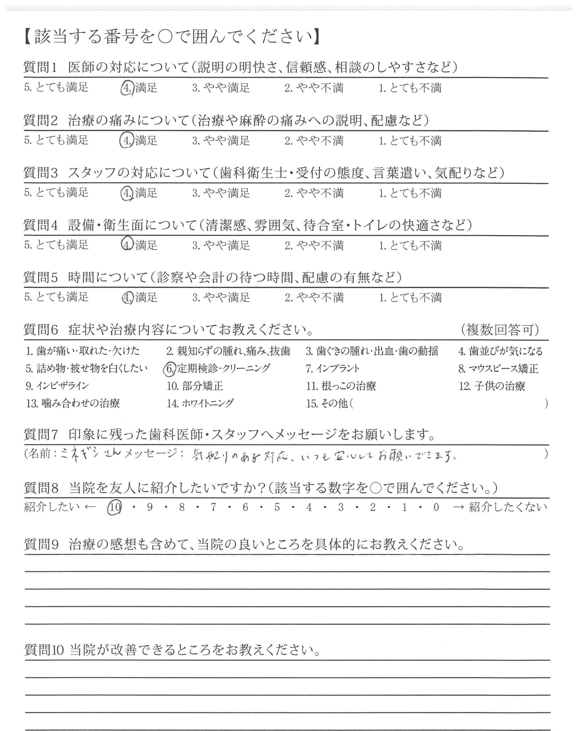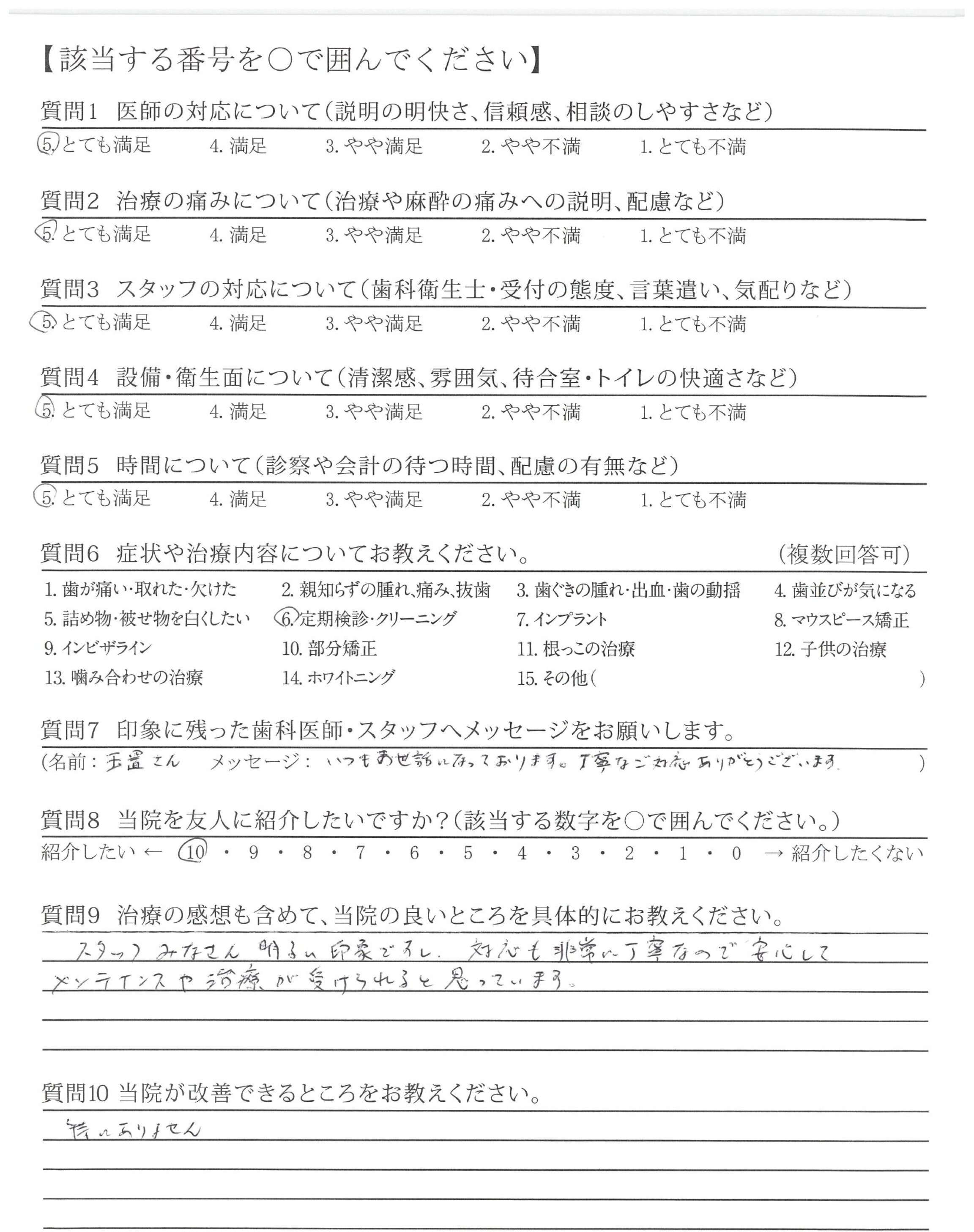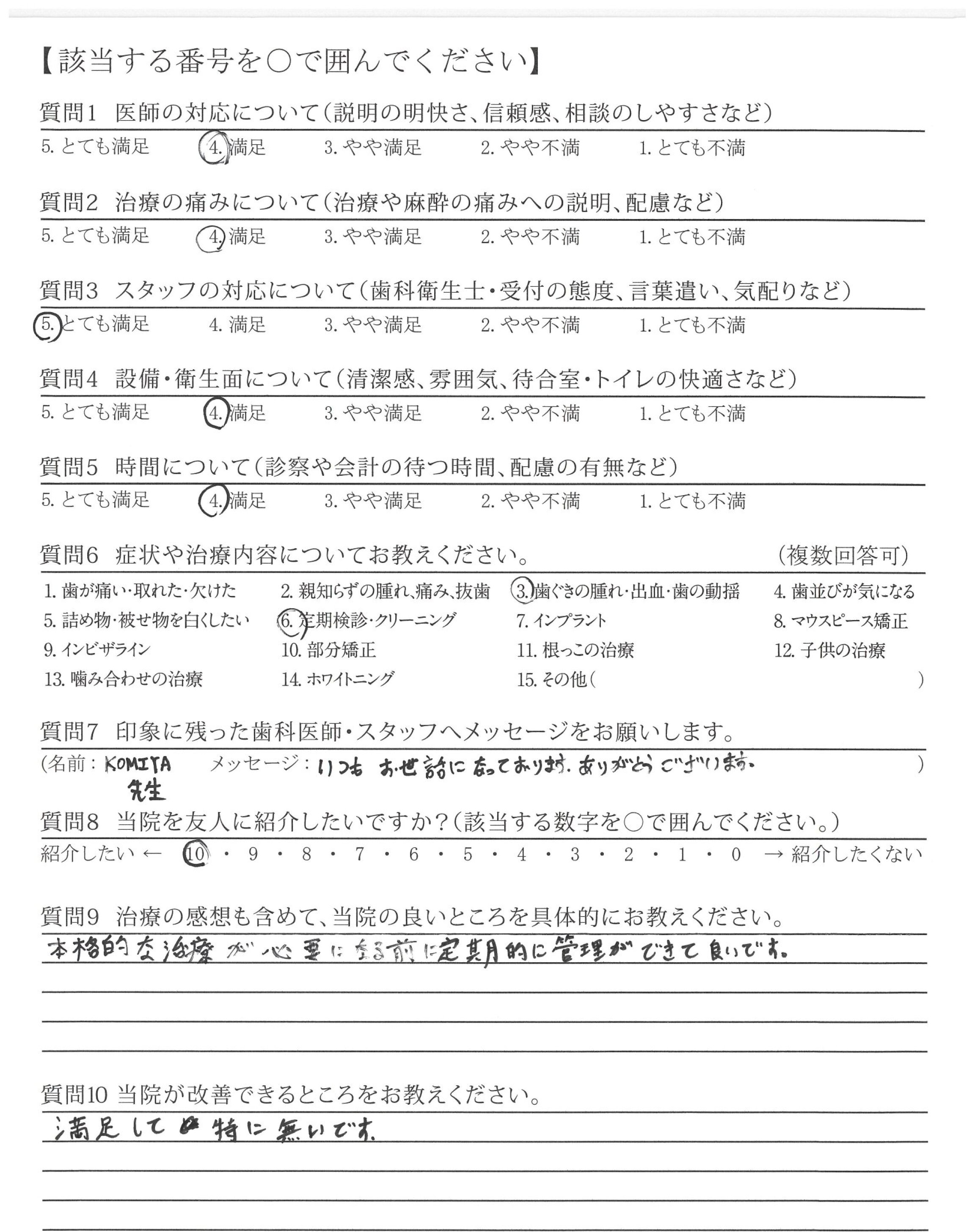 いつも細やかに歯みがきのやり方を教えて下さり、信頼しています。診療もスムーズで安心して開口できます。