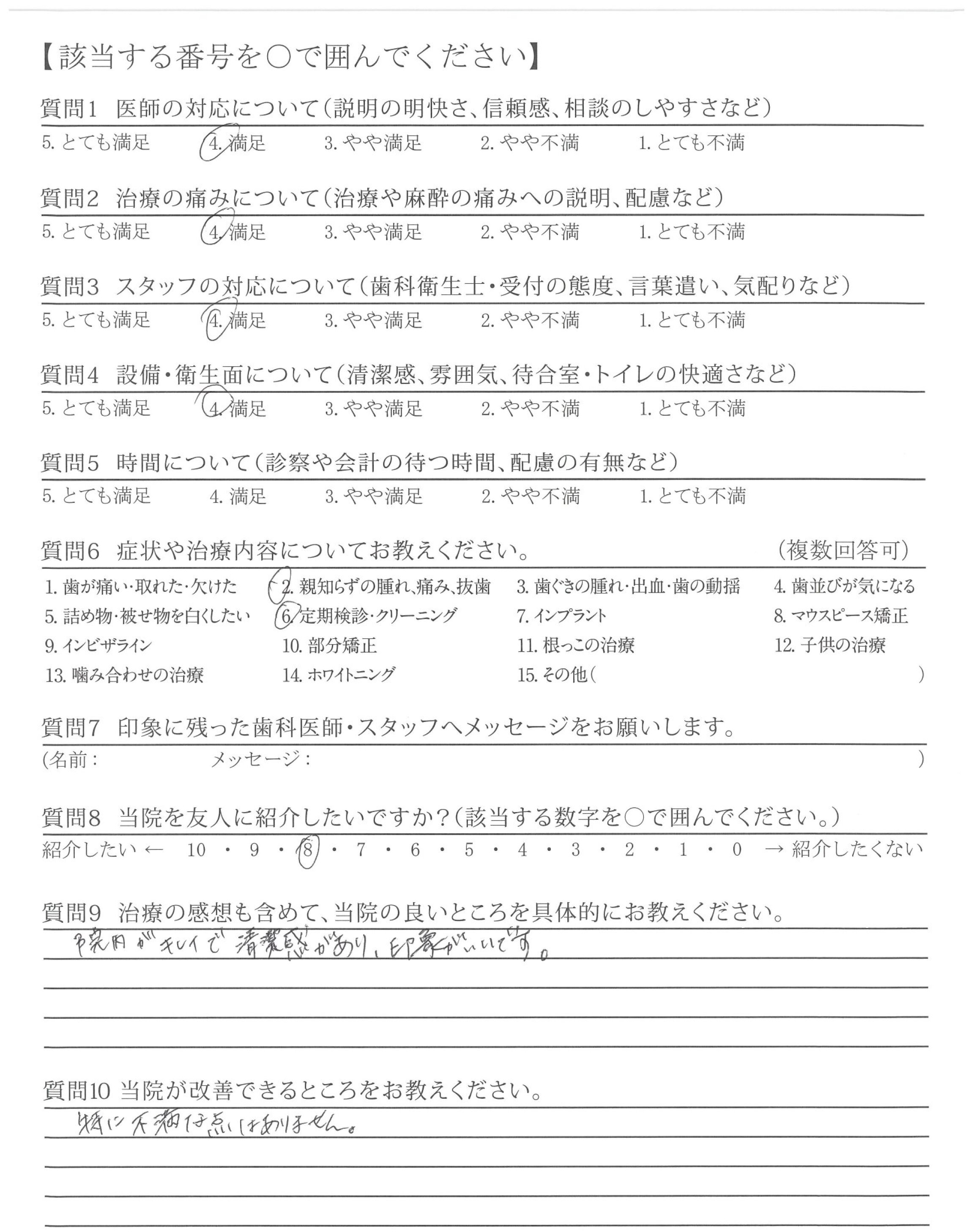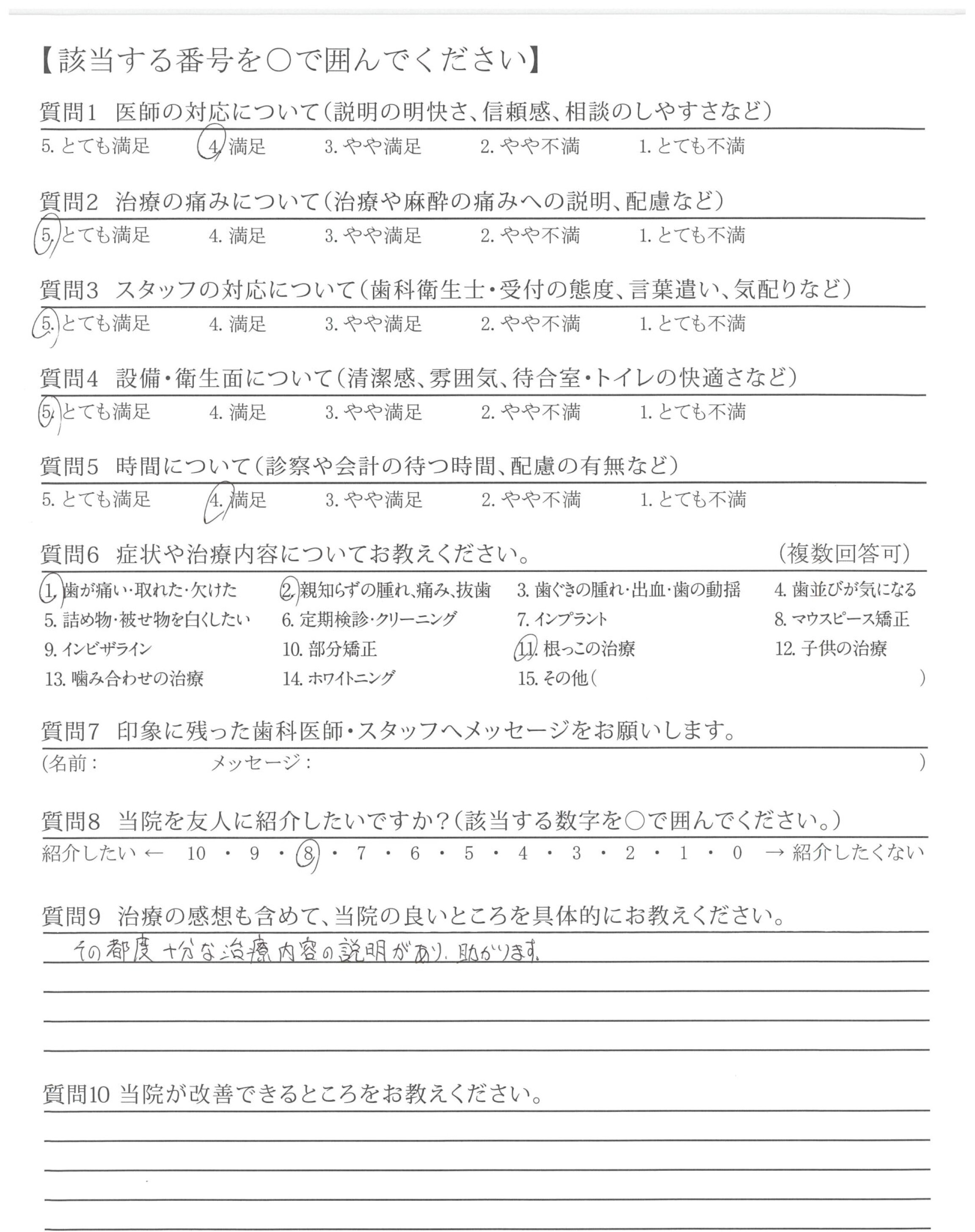 麻酔に対して、不安を軽減する対応をしてくれるのか心配だったが、きちんと対応し、1つ1つの施術に対しても説明しながら行なってくれたので、安心できた。
