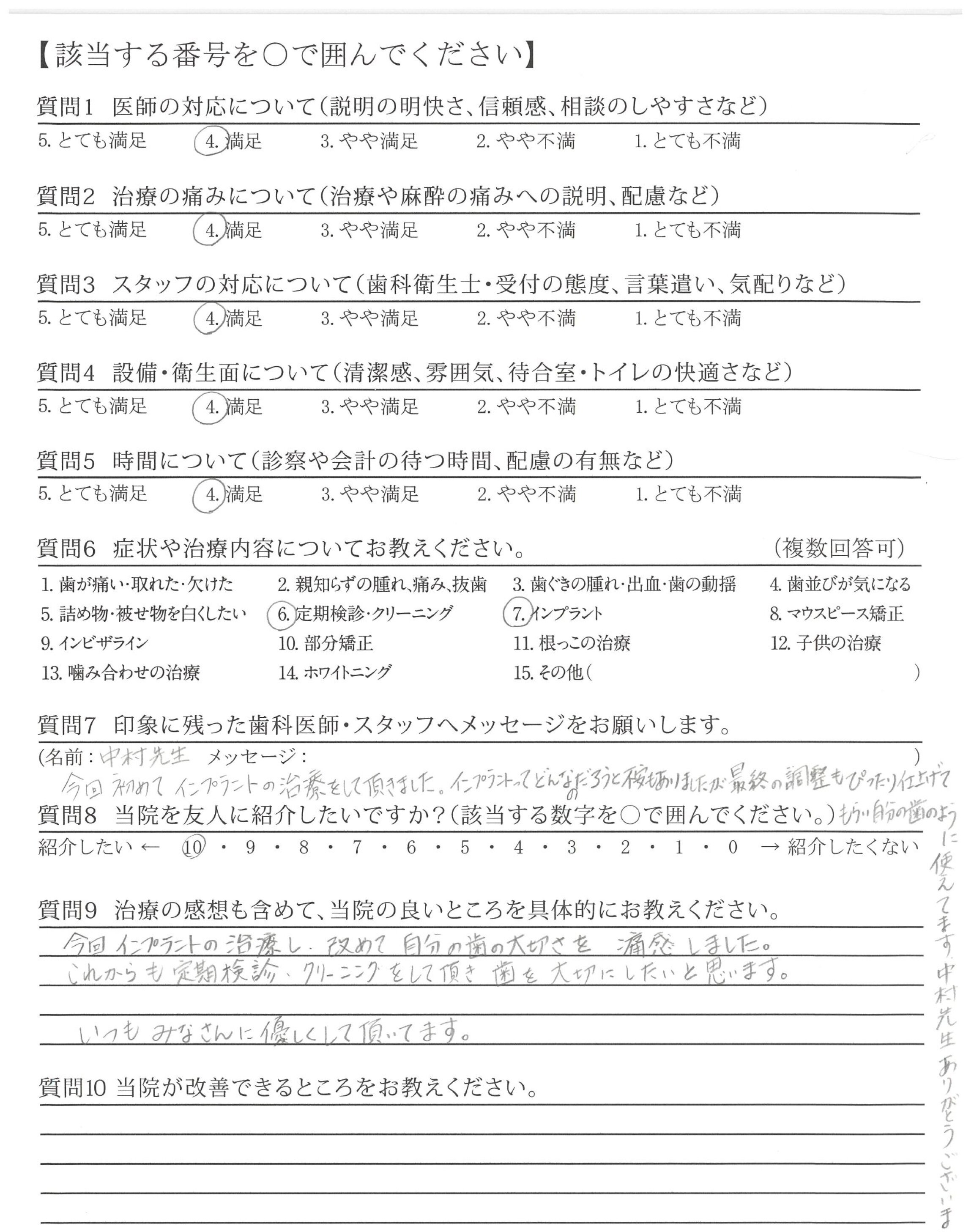 今回初めてインプラントの治療をして頂きました。インプラントってどんなのだろうと不安もありましたが最終の調整もぴったり仕上げてもらい自分の歯のように使えてます。中村先生ありがとうございました。