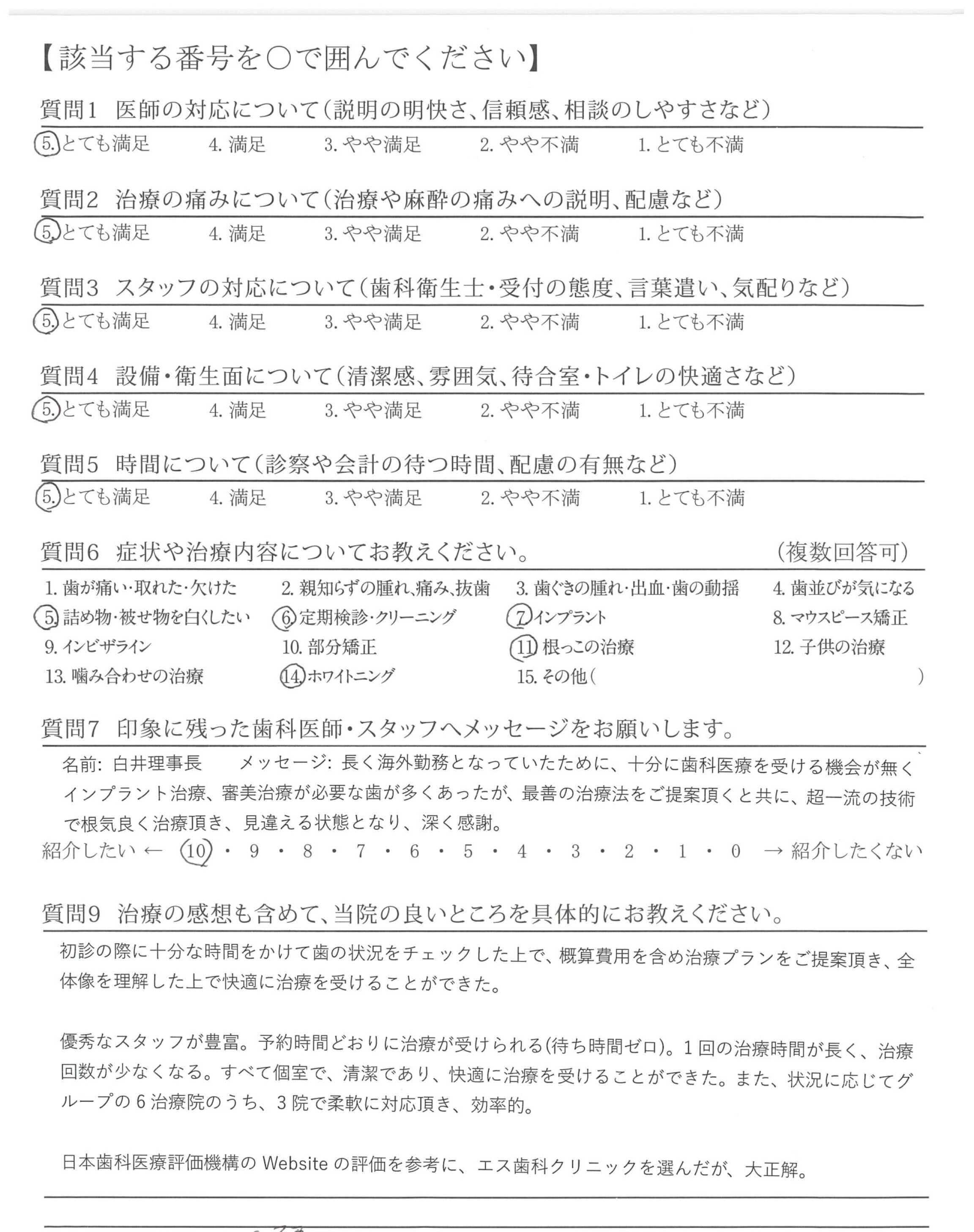 (1)主治医は白井先生、担当歯科衛生士は黒澤さんでしたが、症状や治療内容の説明や相談のしやすさはとても良い。担当者が都度かわらないシステムもとても良い。