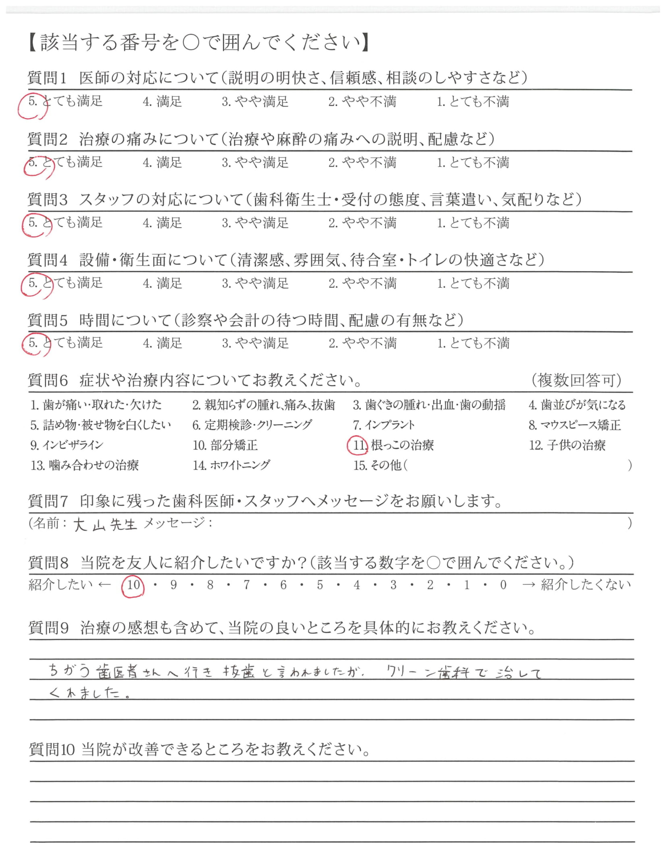 ちがう歯医者さんへ行き抜歯と言われましたが、クリーン歯科で治してくれました。