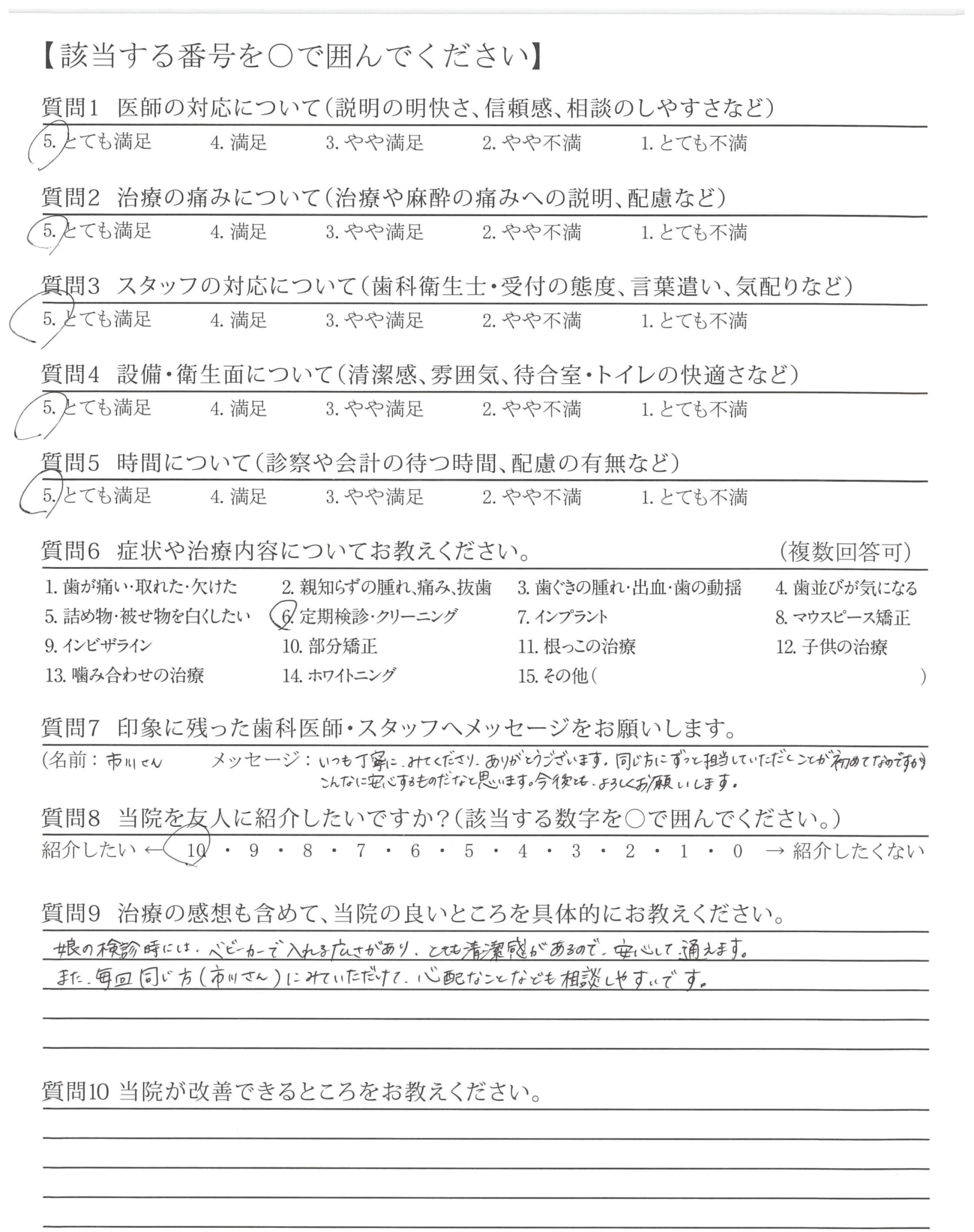 いつも丁寧に、みてくださり、ありがとうございます。同じ方にずっと担当していただくことが初めてなのですがこんなに安心するものだなと思います。今後ともよろしくお願いします。
