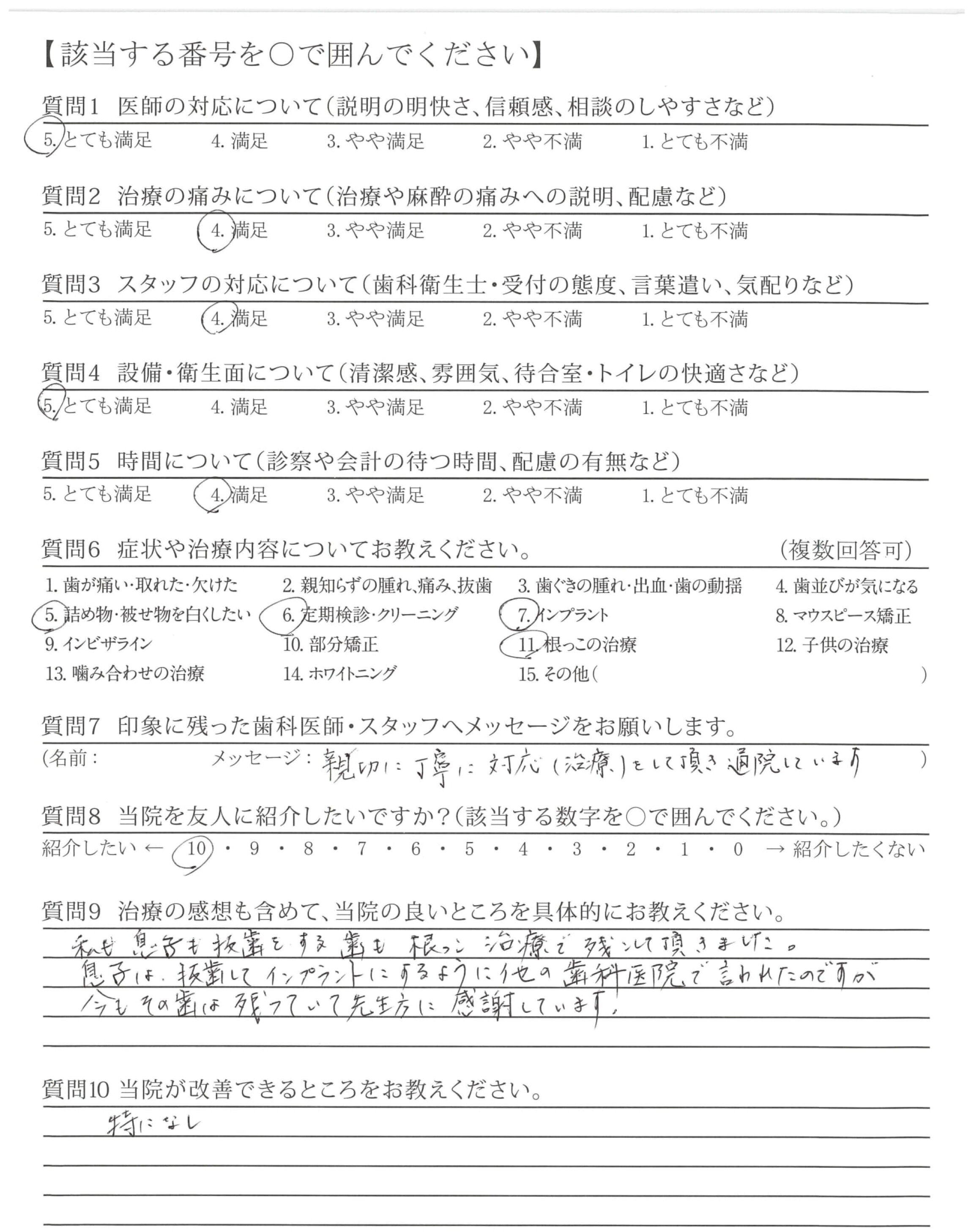 根っこの治療は、時間を掛けて治療して頂き若い頃から口を開けて笑うことができませんでしたが、すっかりとおしゃべりになりました。また、紹介をした息子も根っこの治療で抜歯せずに喜んでいました。