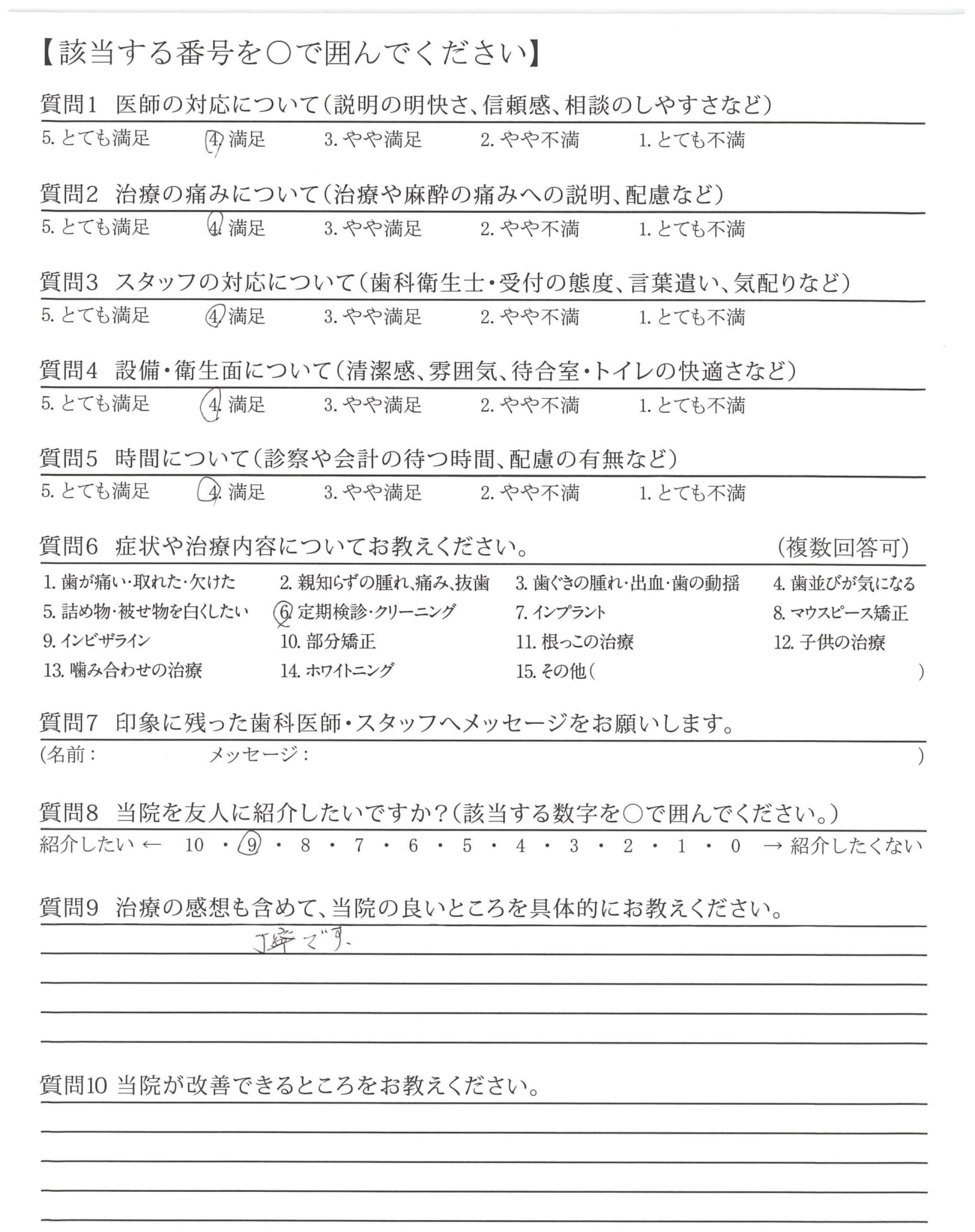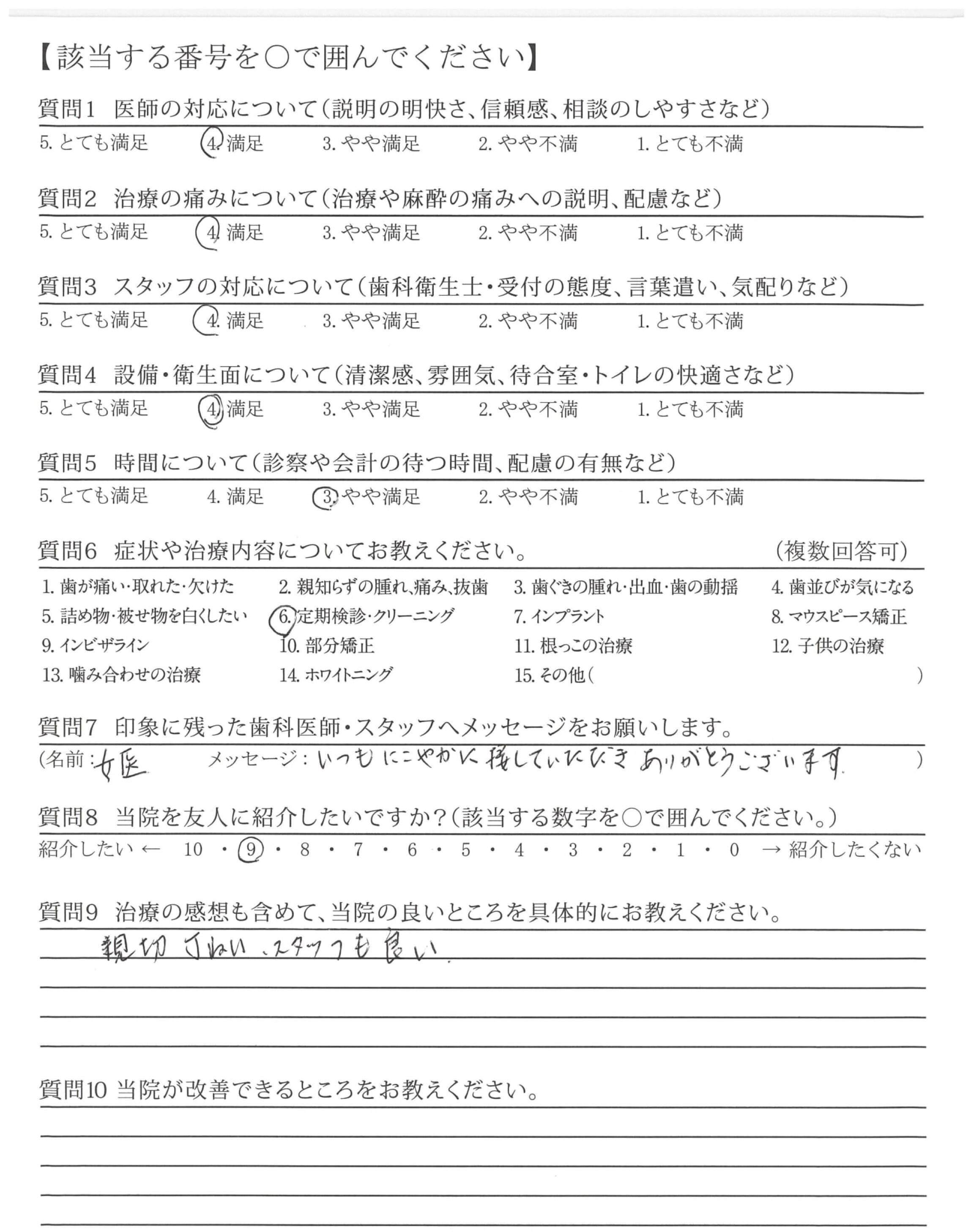いつも丁寧に説明、治療してくださり、感謝しています。