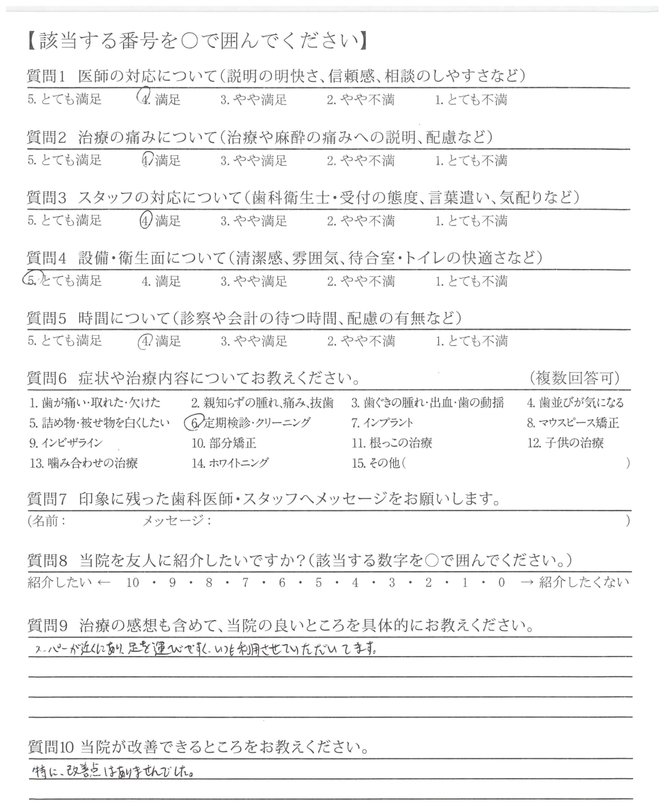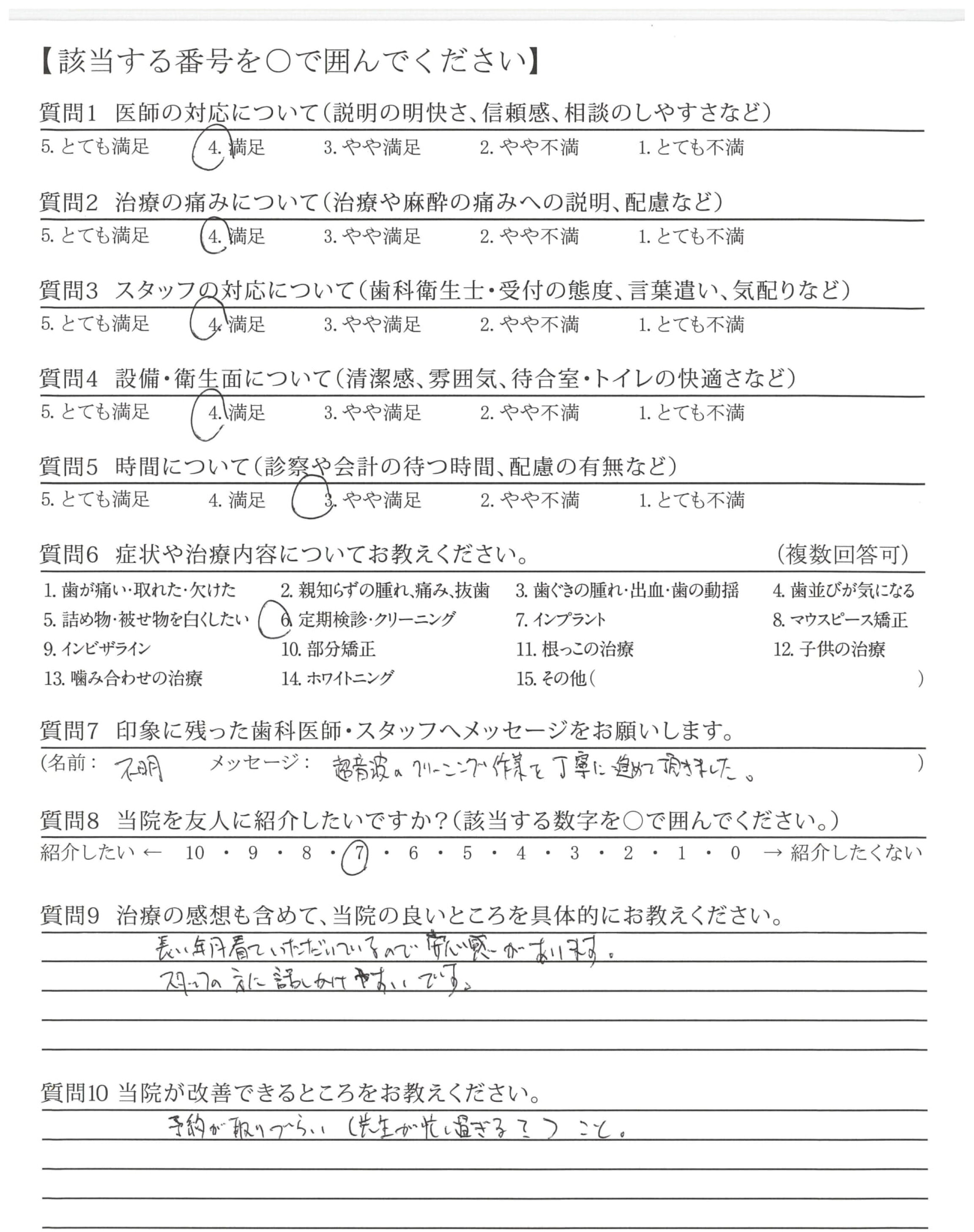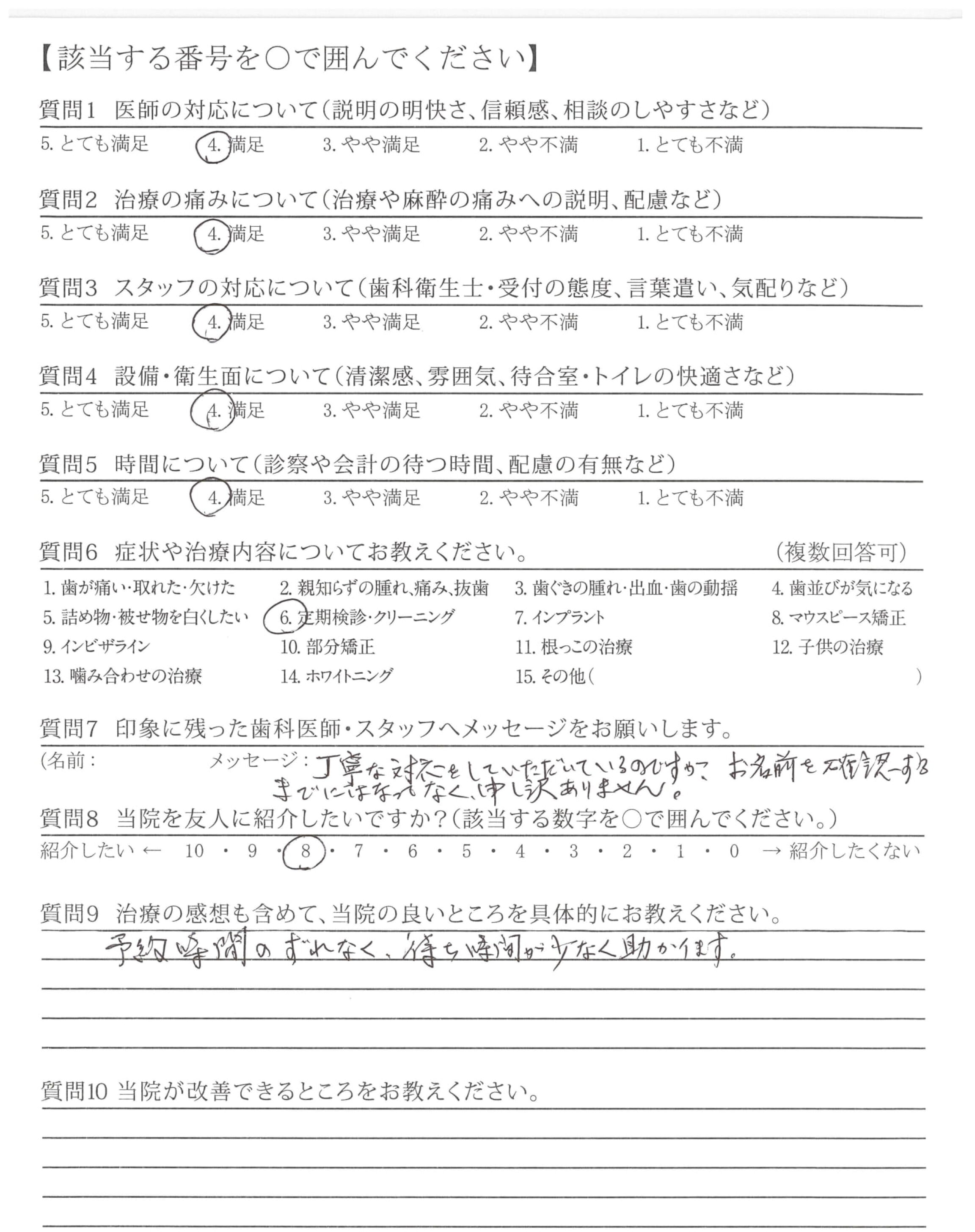 治療が目的で通う時、いつも患者さんが多いので先生を待つ時間が長い時もありますが、担当の先生が来てからは手ぎわ良く診て下さるので待つのは仕方がないかなぁと思ってます。また、定期検診の時のクリーニングをして下さる方は、毎回変わりますが、皆さん丁ねいにやって頂き感謝しております。