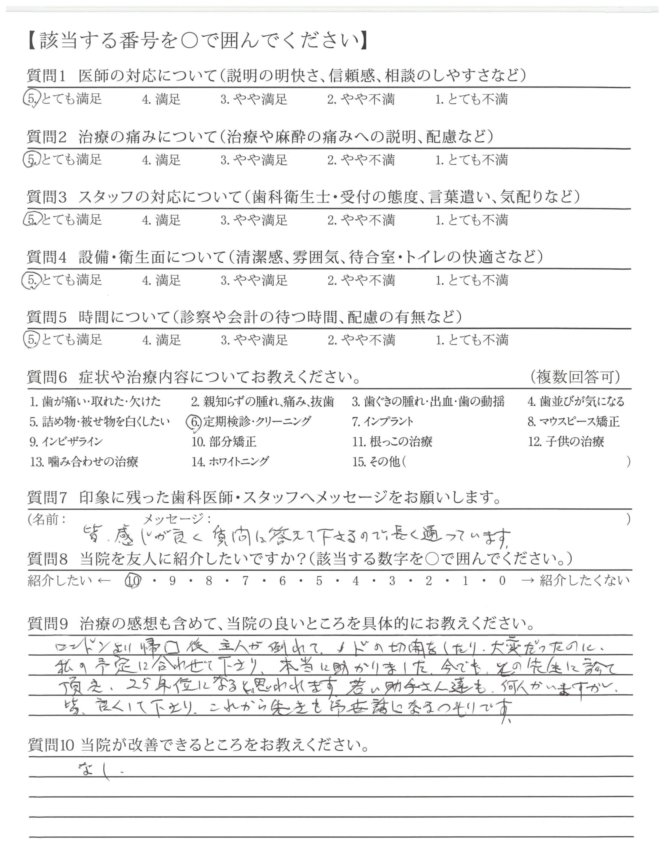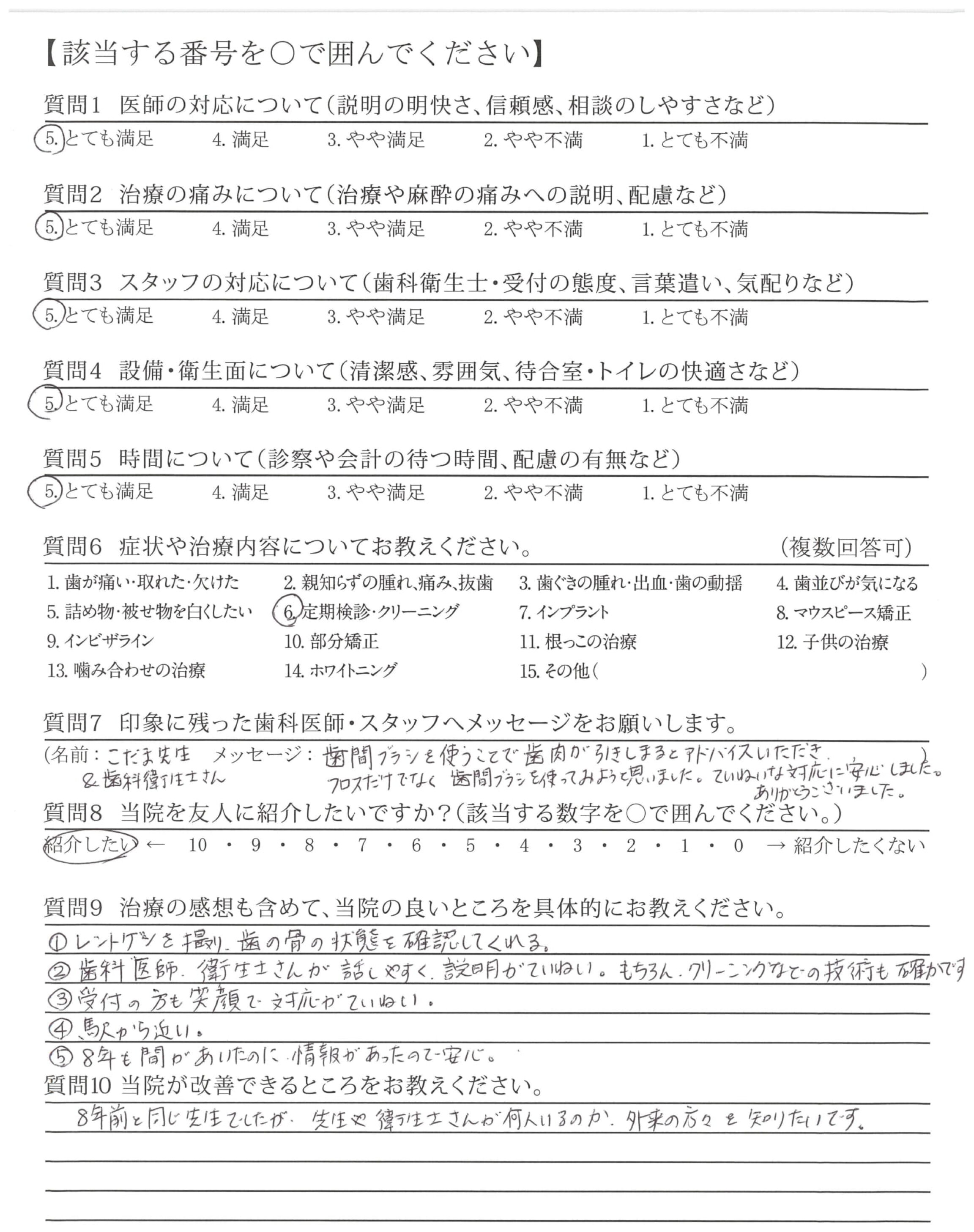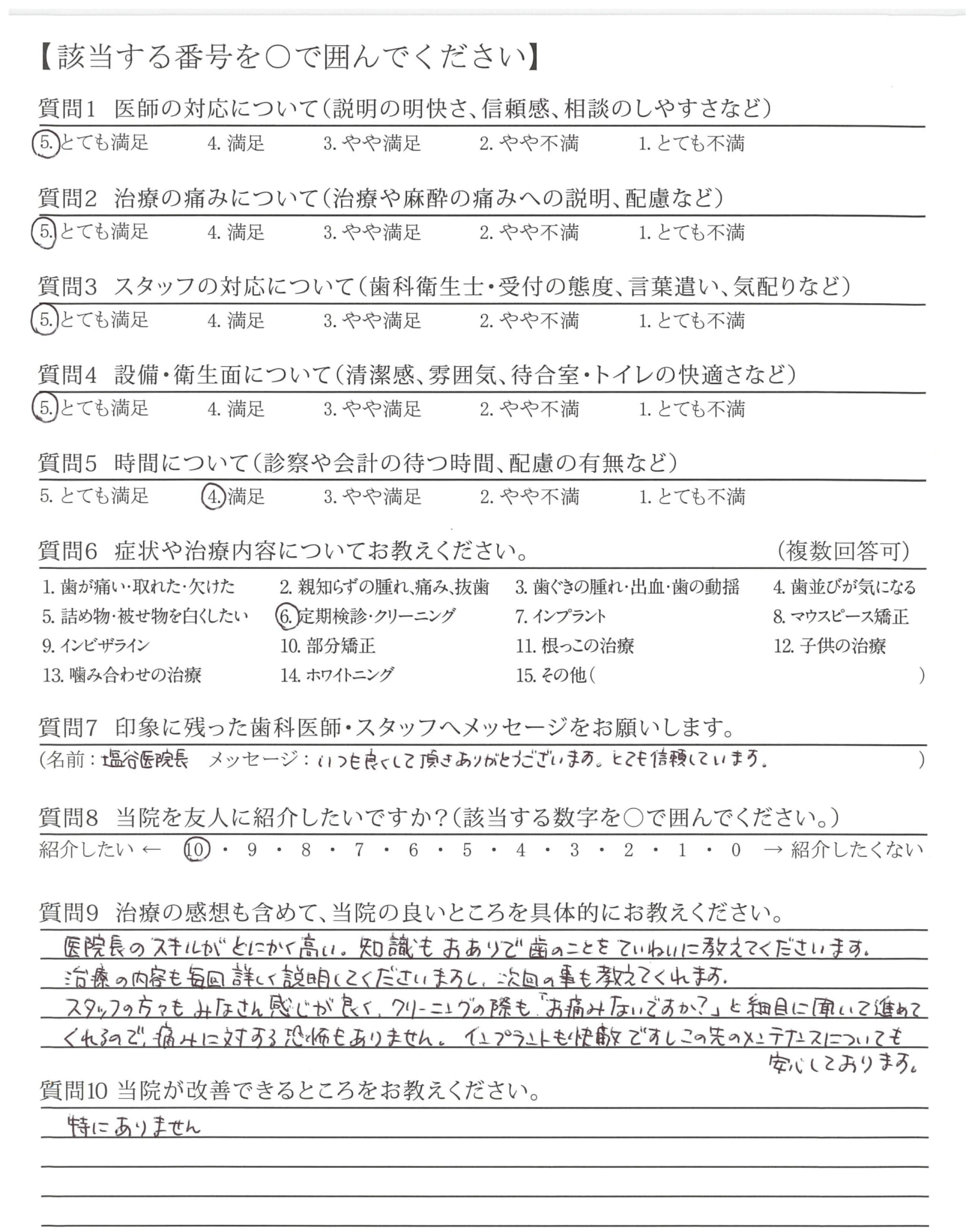 上下全インプラントを親切丁寧な説明と治療頂きありがとうございました。せっかくの大変な治療だったので長生きな人生永く楽しみたいと思います。