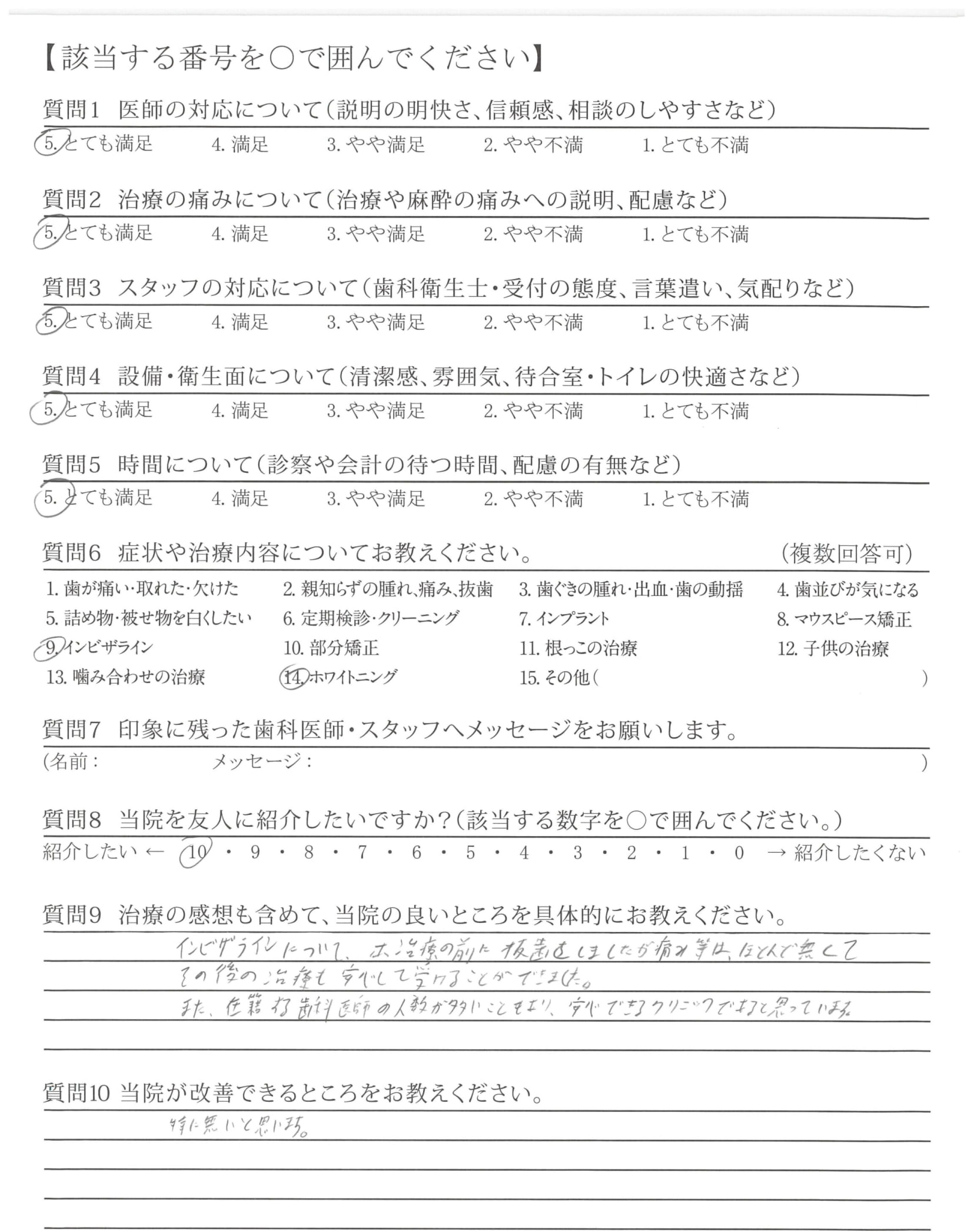 インビザラインについて、本治療の前に抜歯をしましたが痛み等は、ほとんど無くてその後の治療も安心して受けることができました。また、在籍する歯科医師の人数が多いこともあり、安心できるクリニックであると思っています。