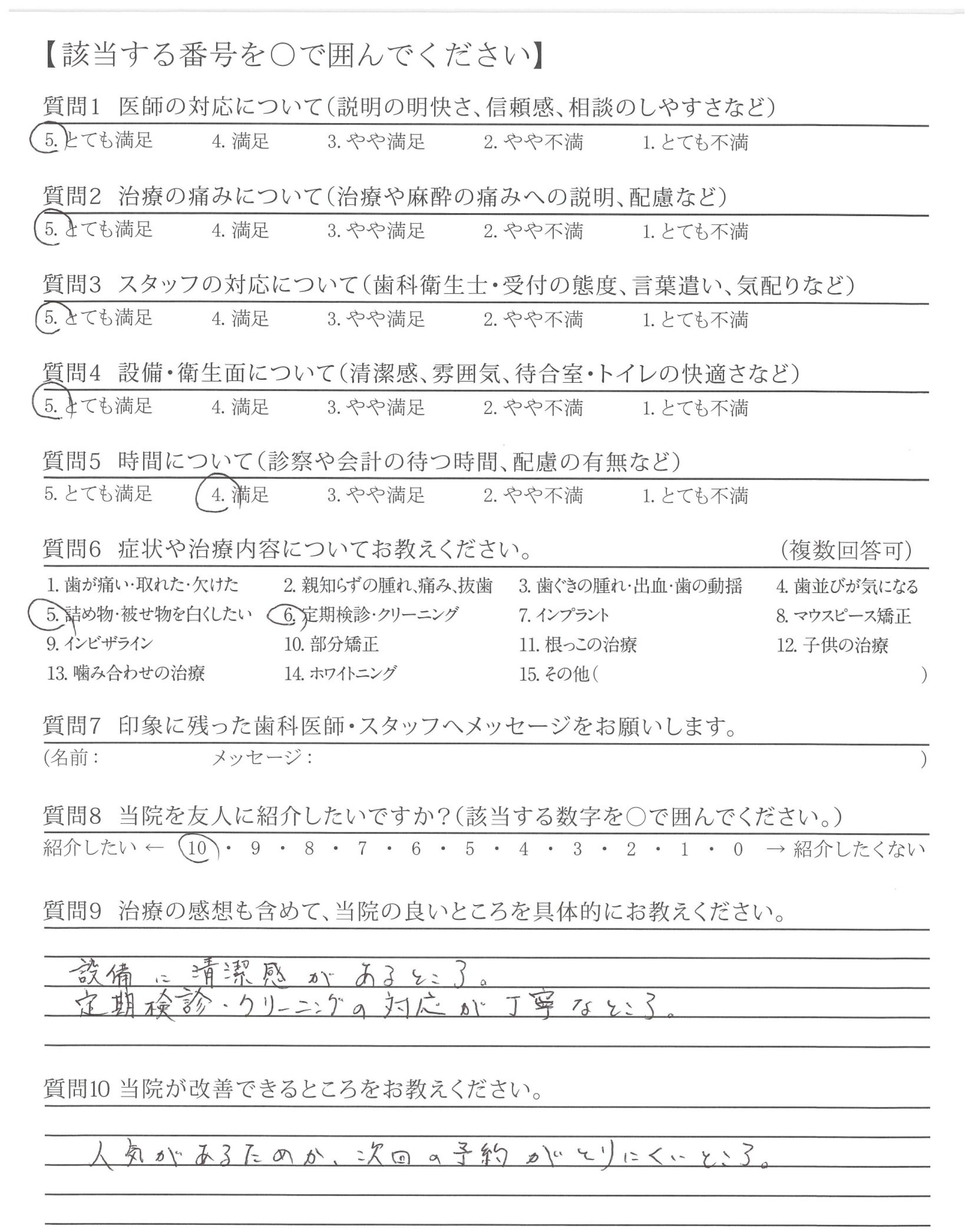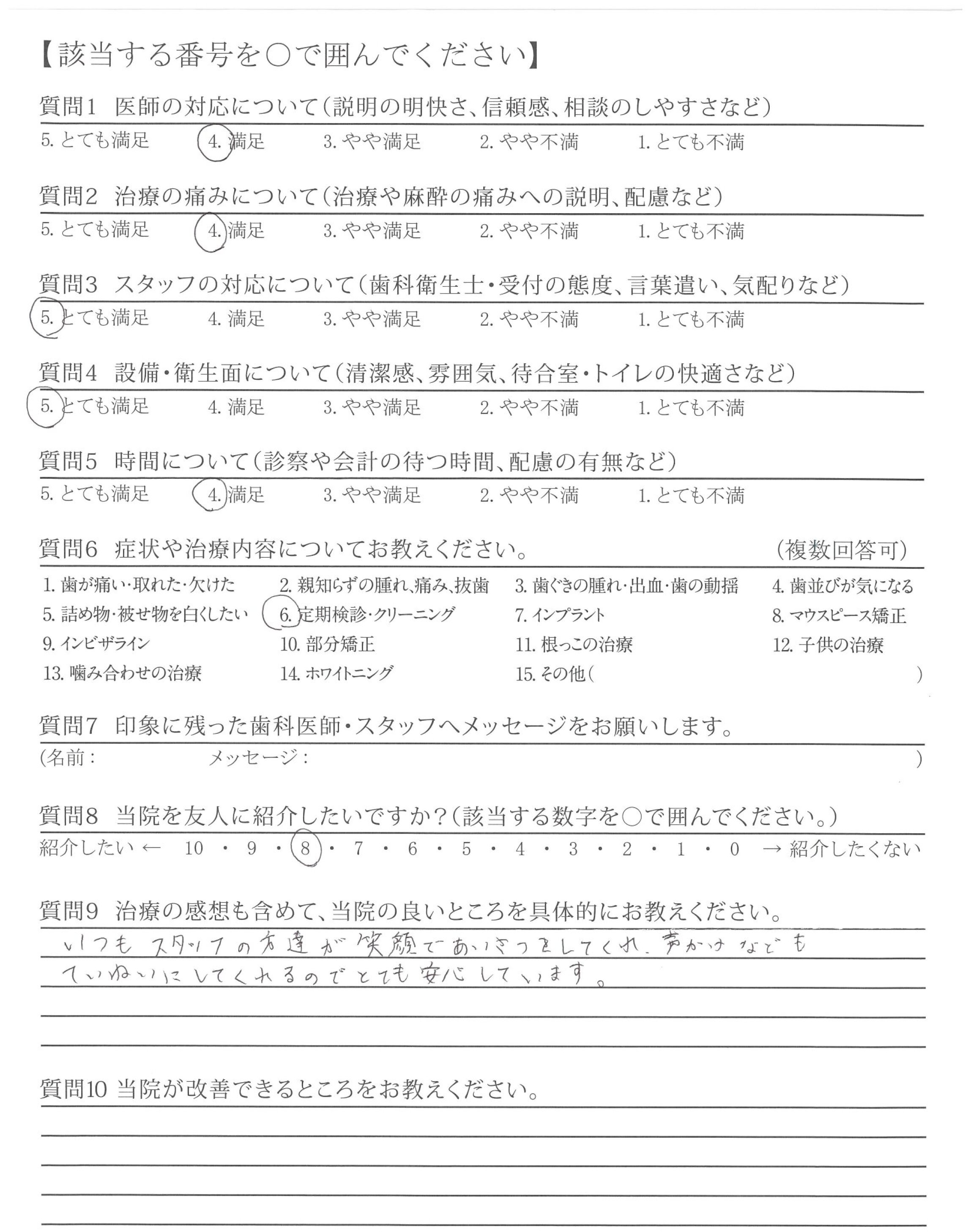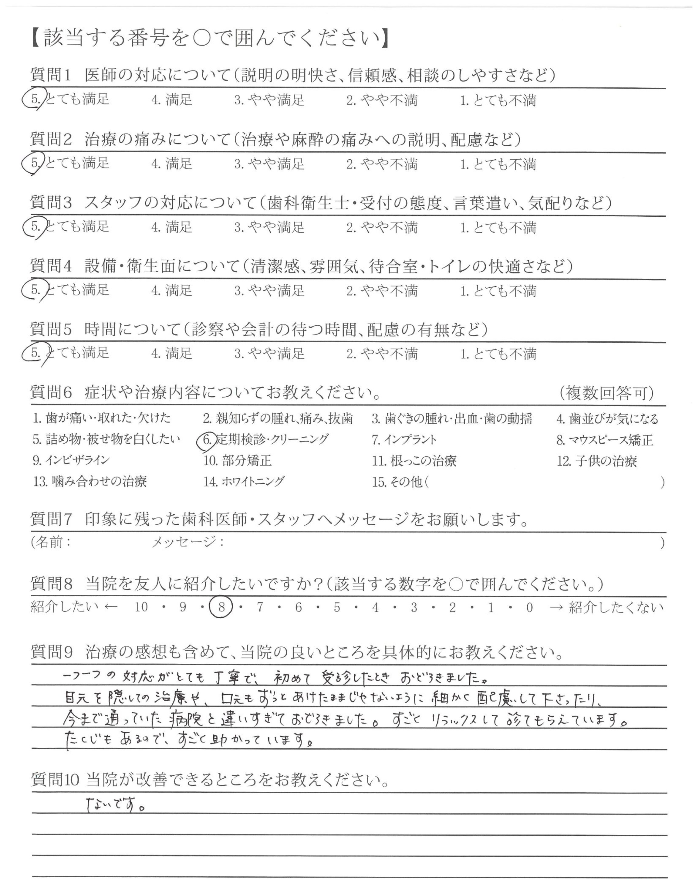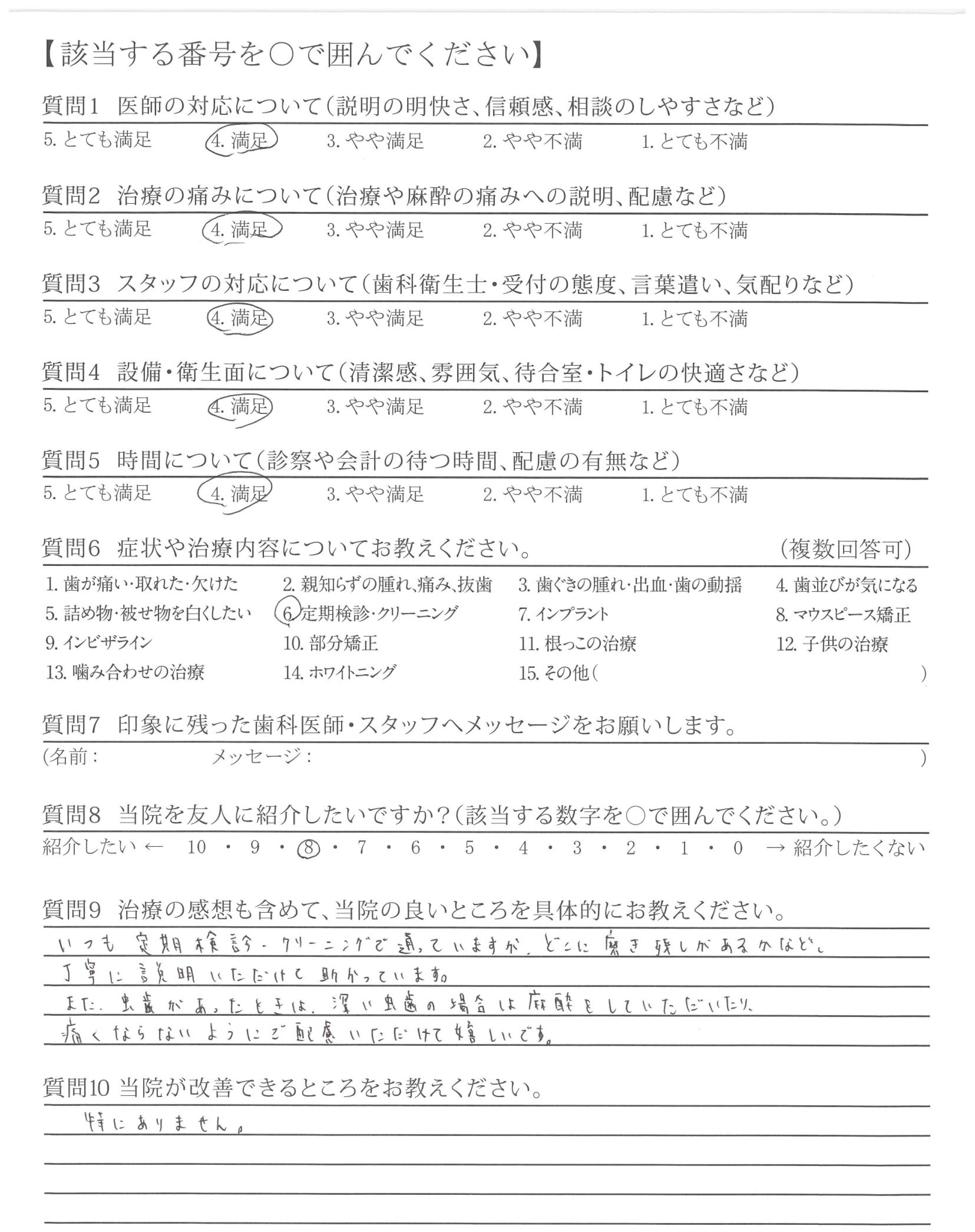 いつも定期検診・クリーニングで通っていますが、どこに磨き残しがあるかなど、丁寧に説明いただけて助かっています。また、虫歯があったときは、深い虫歯の場合は麻酔をしていただいたり、痛くならないようにご配慮いただけて嬉しいです。
