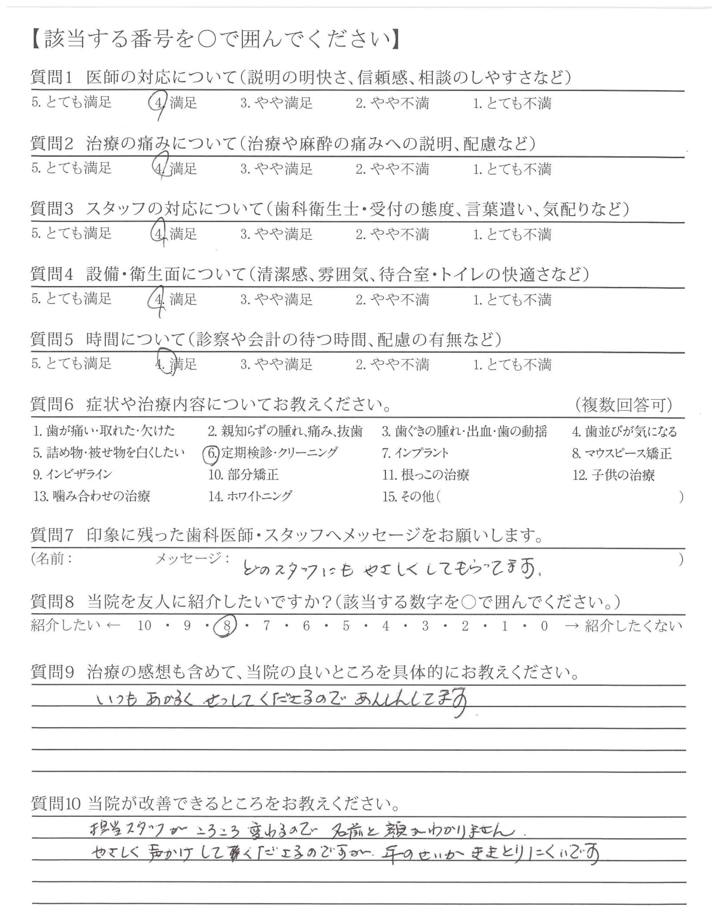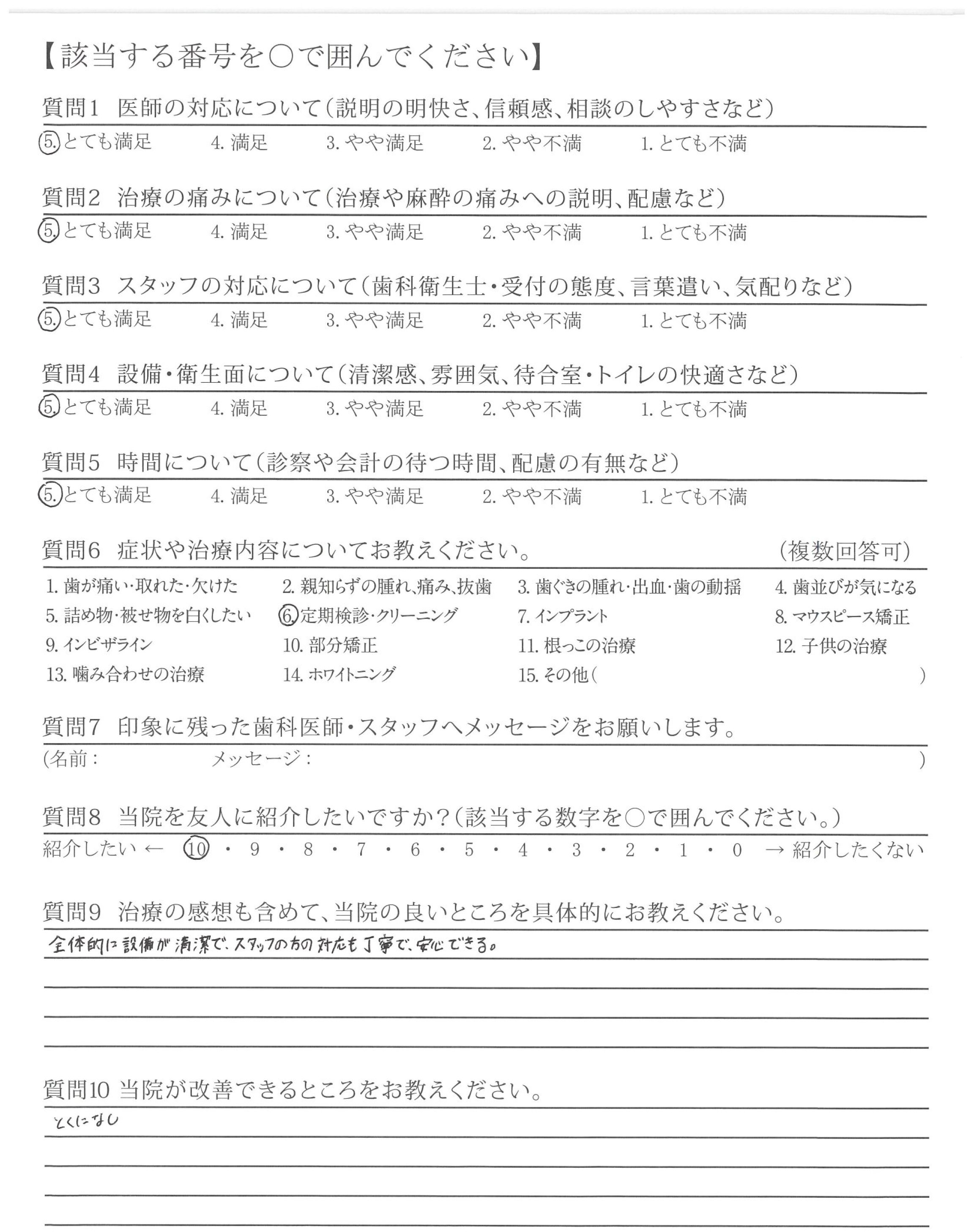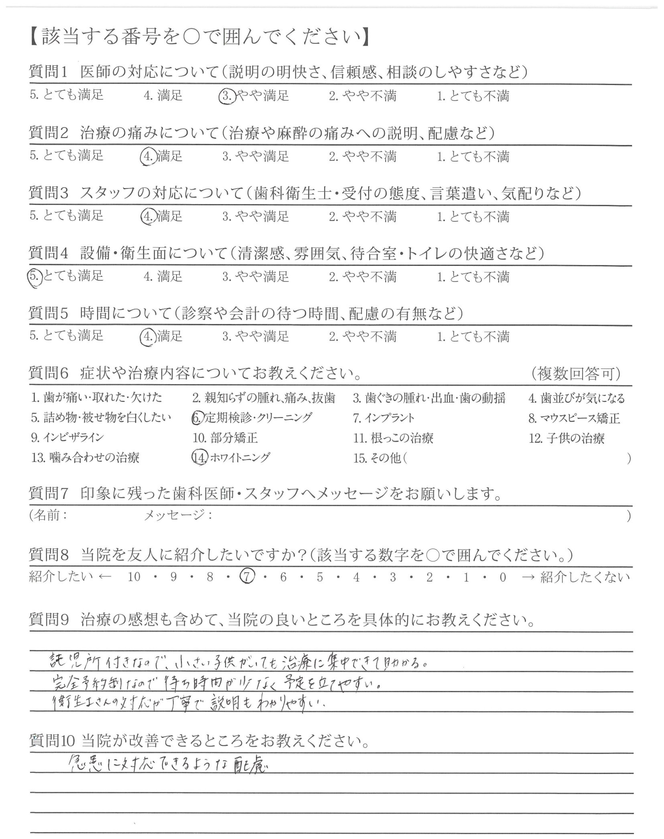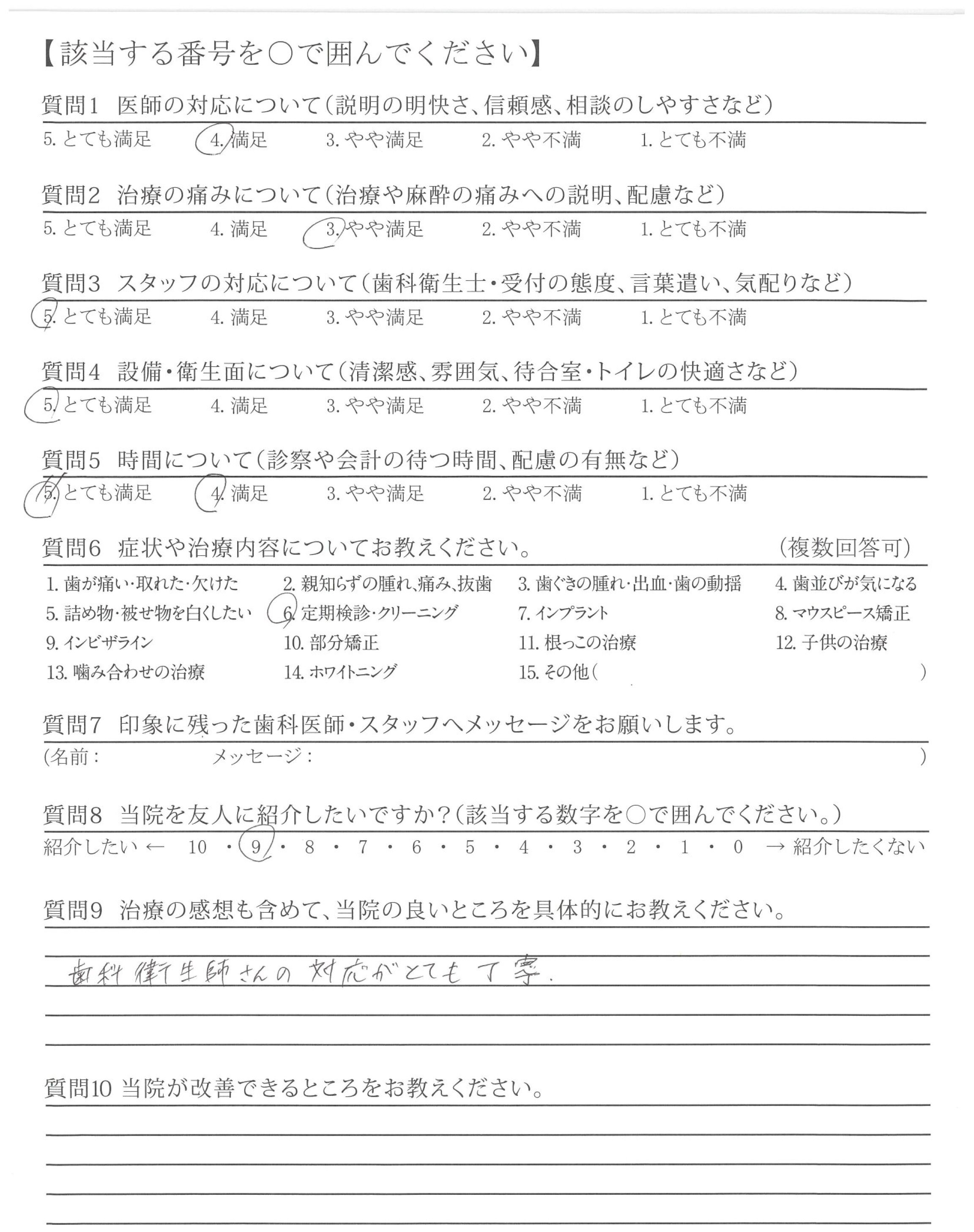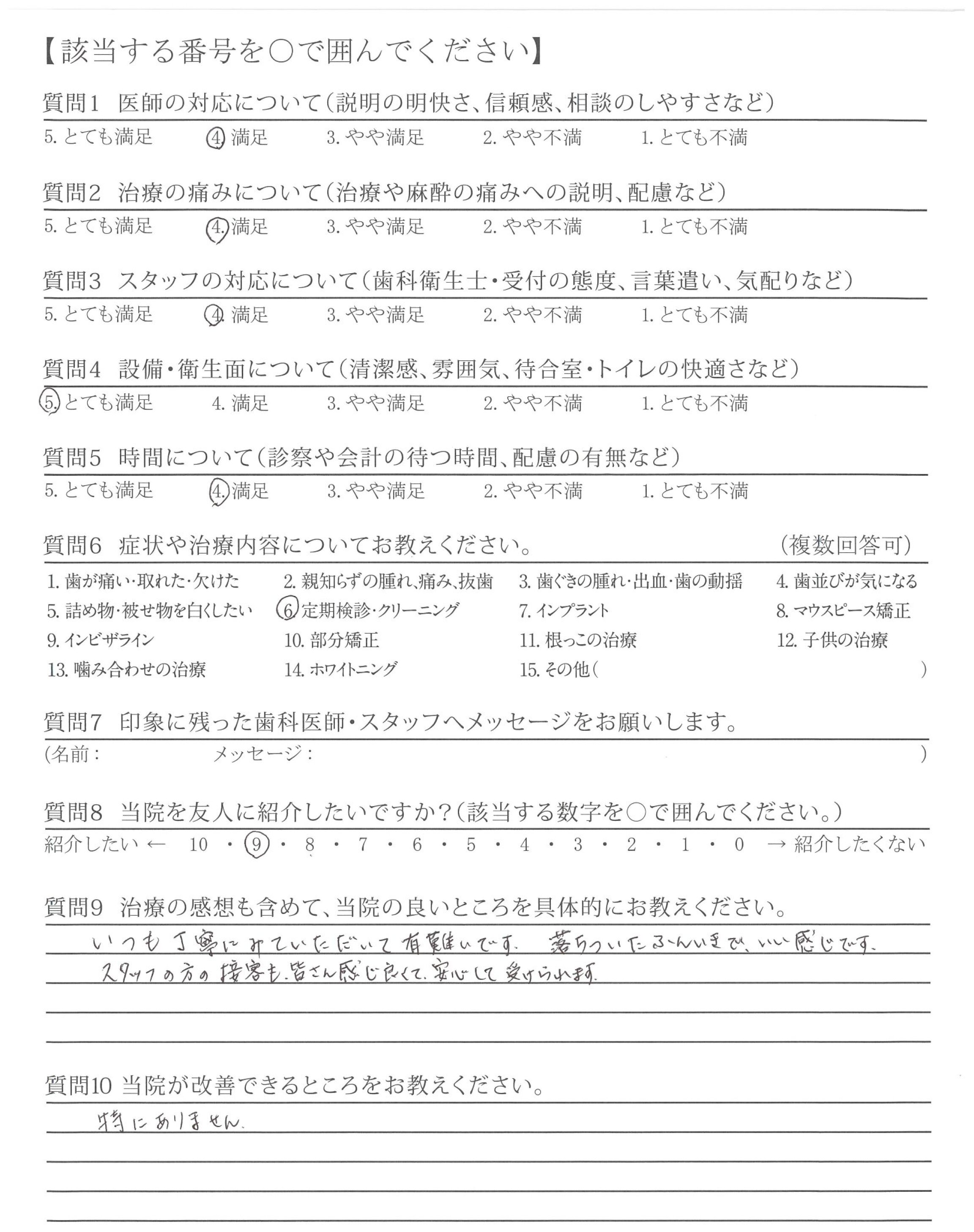 いつも定期検診・クリーニングで通っていますが、どこに磨き残しがあるかなど、丁寧に説明いただけて助かっています。また、虫歯があったときは、深い虫歯の場合は麻酔をしていただいたり、痛くならないようにご配慮いただけて嬉しいです。