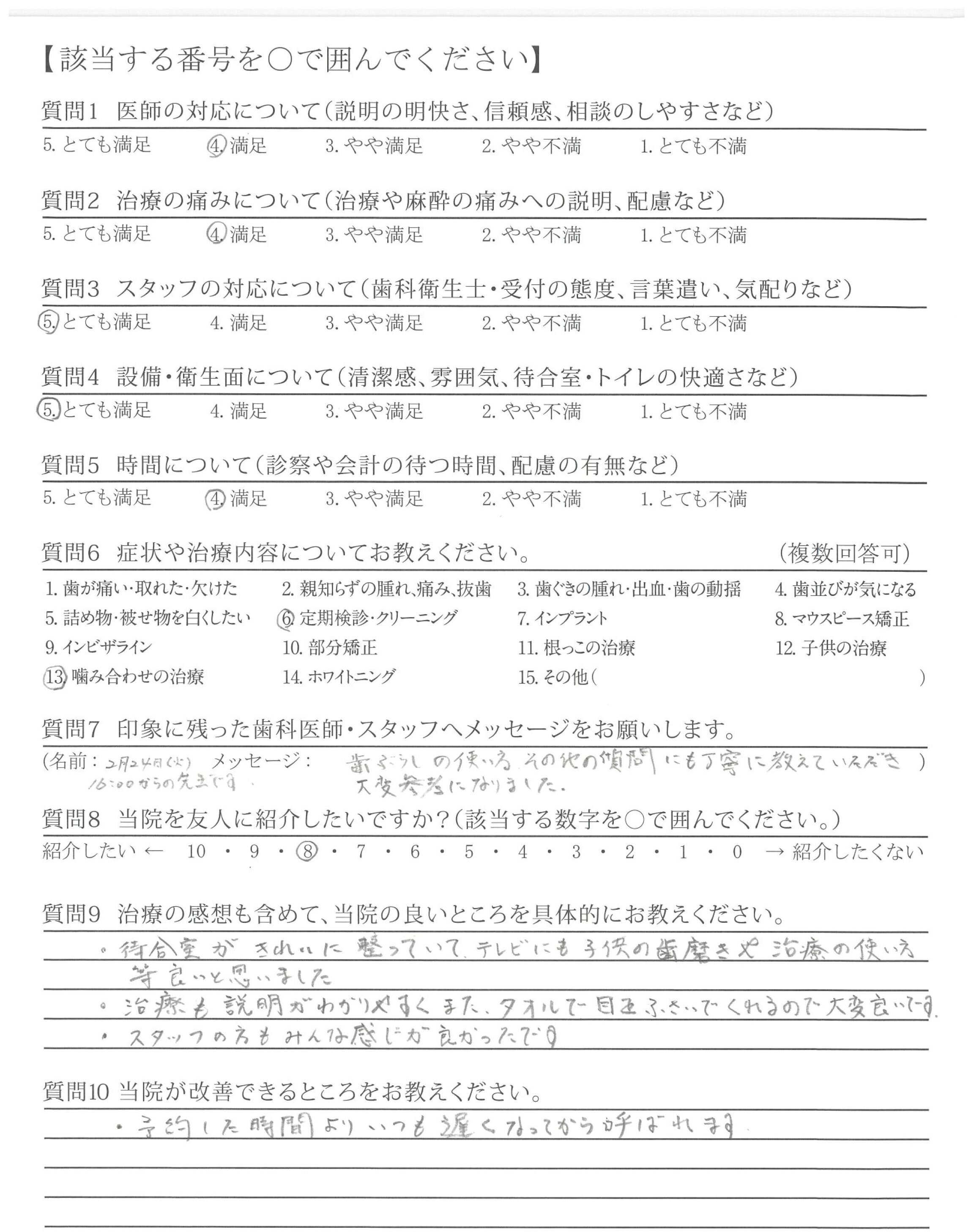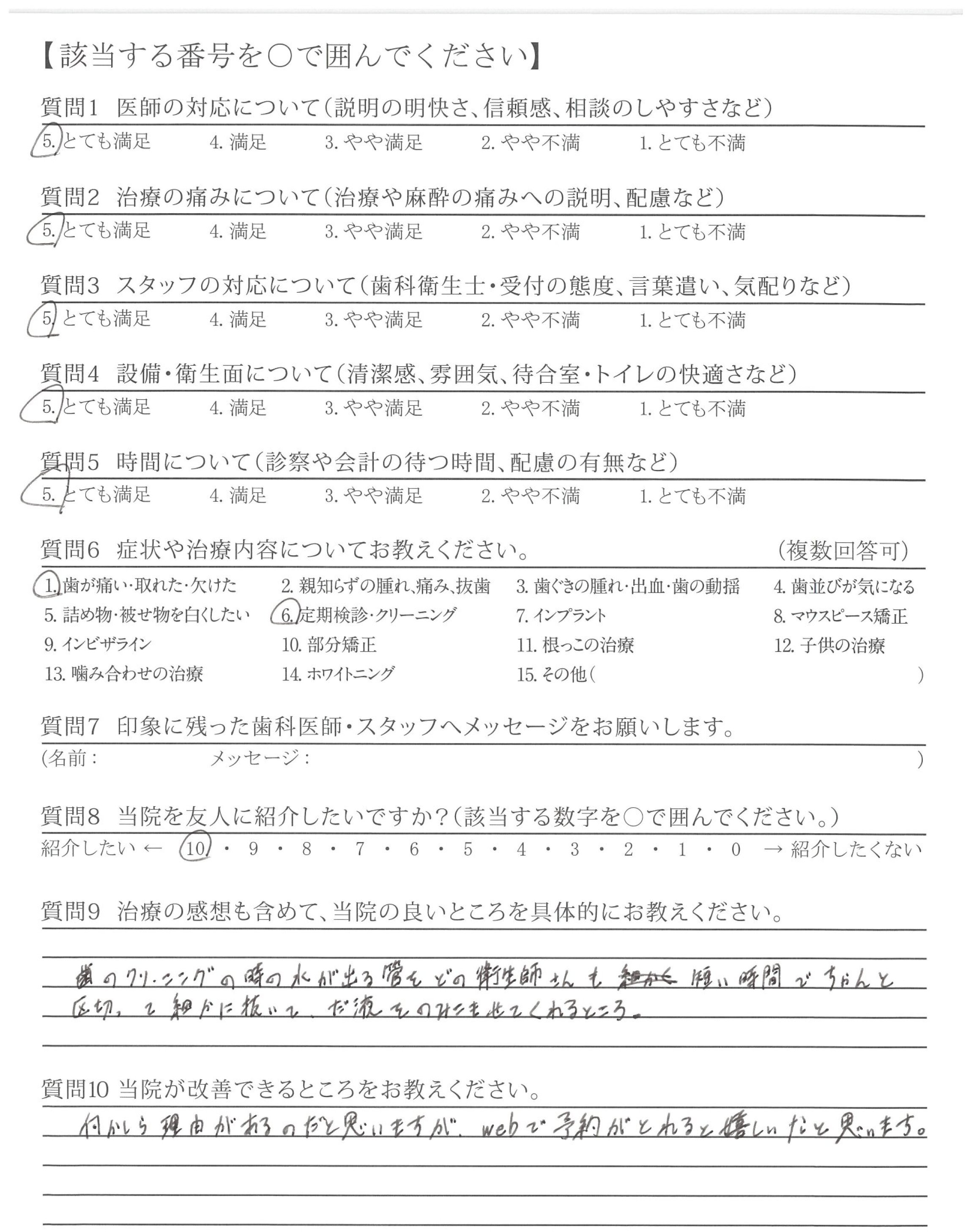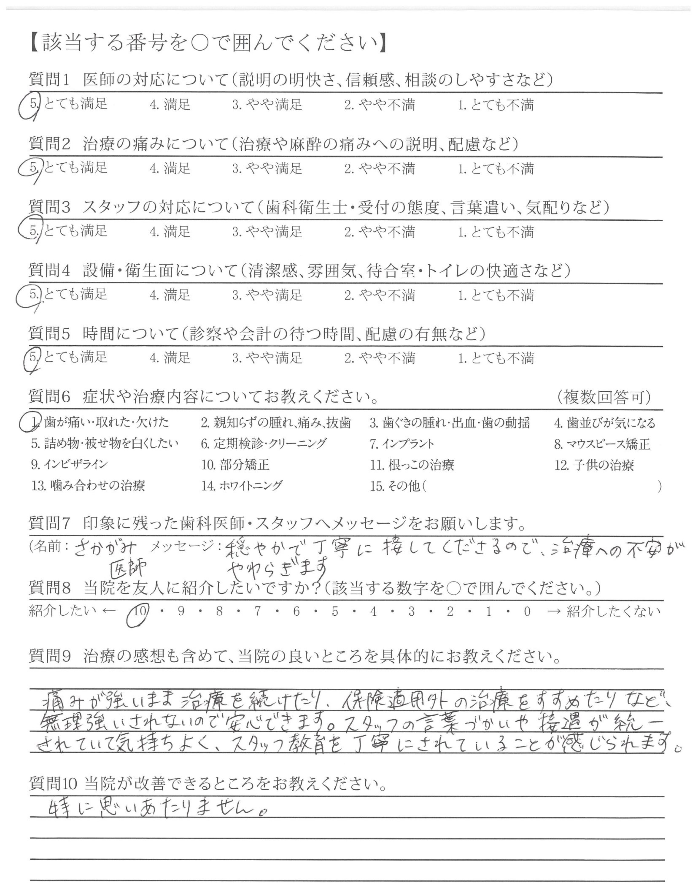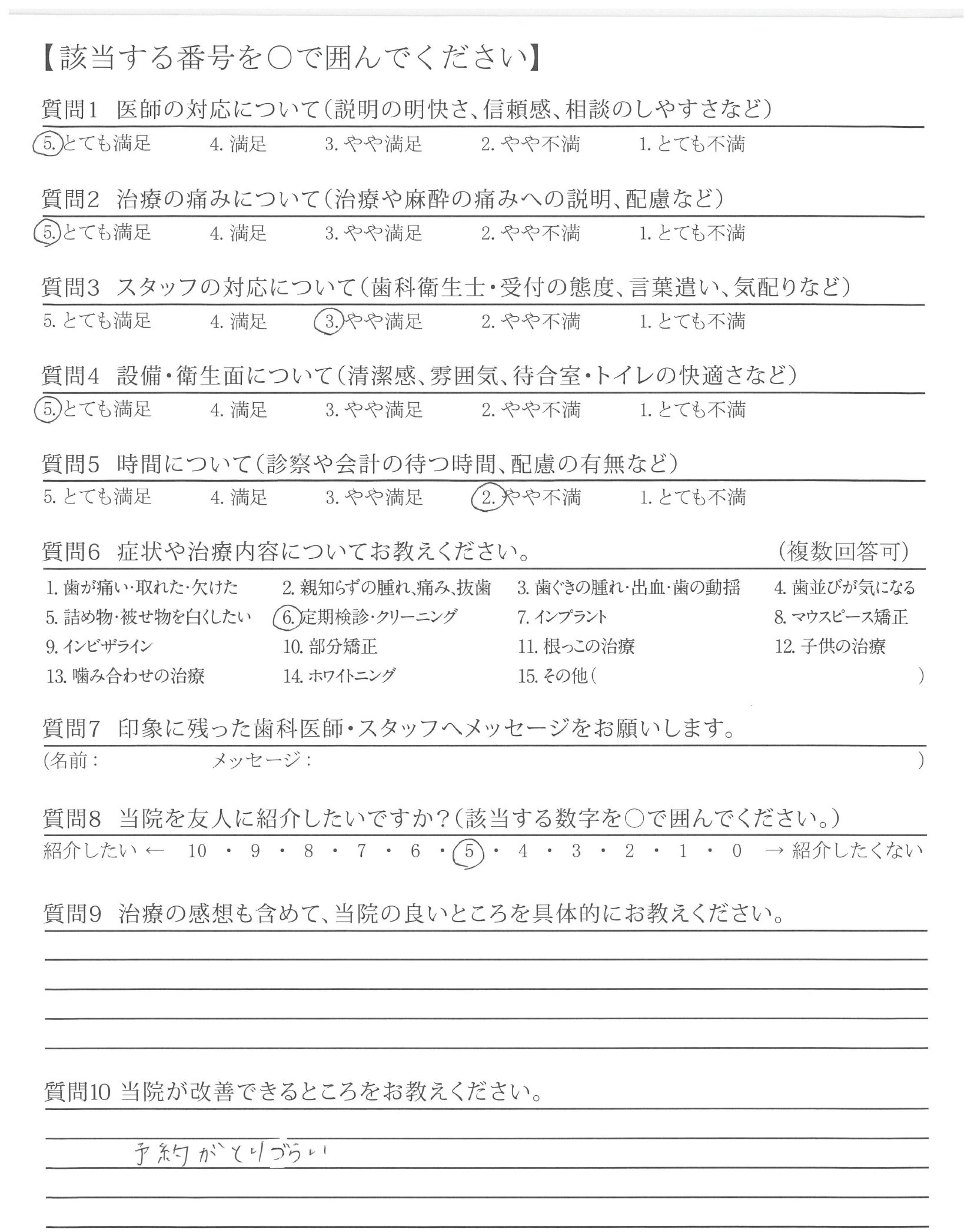 いつも定期検診・クリーニングで通っていますが、どこに磨き残しがあるかなど、丁寧に説明いただけて助かっています。また、虫歯があったときは、深い虫歯の場合は麻酔をしていただいたり、痛くならないようにご配慮いただけて嬉しいです。