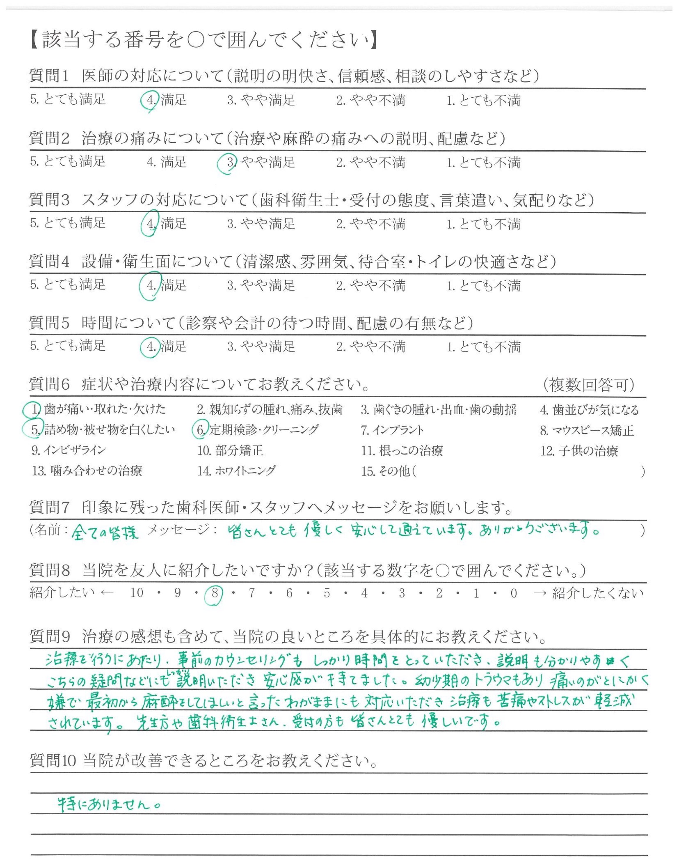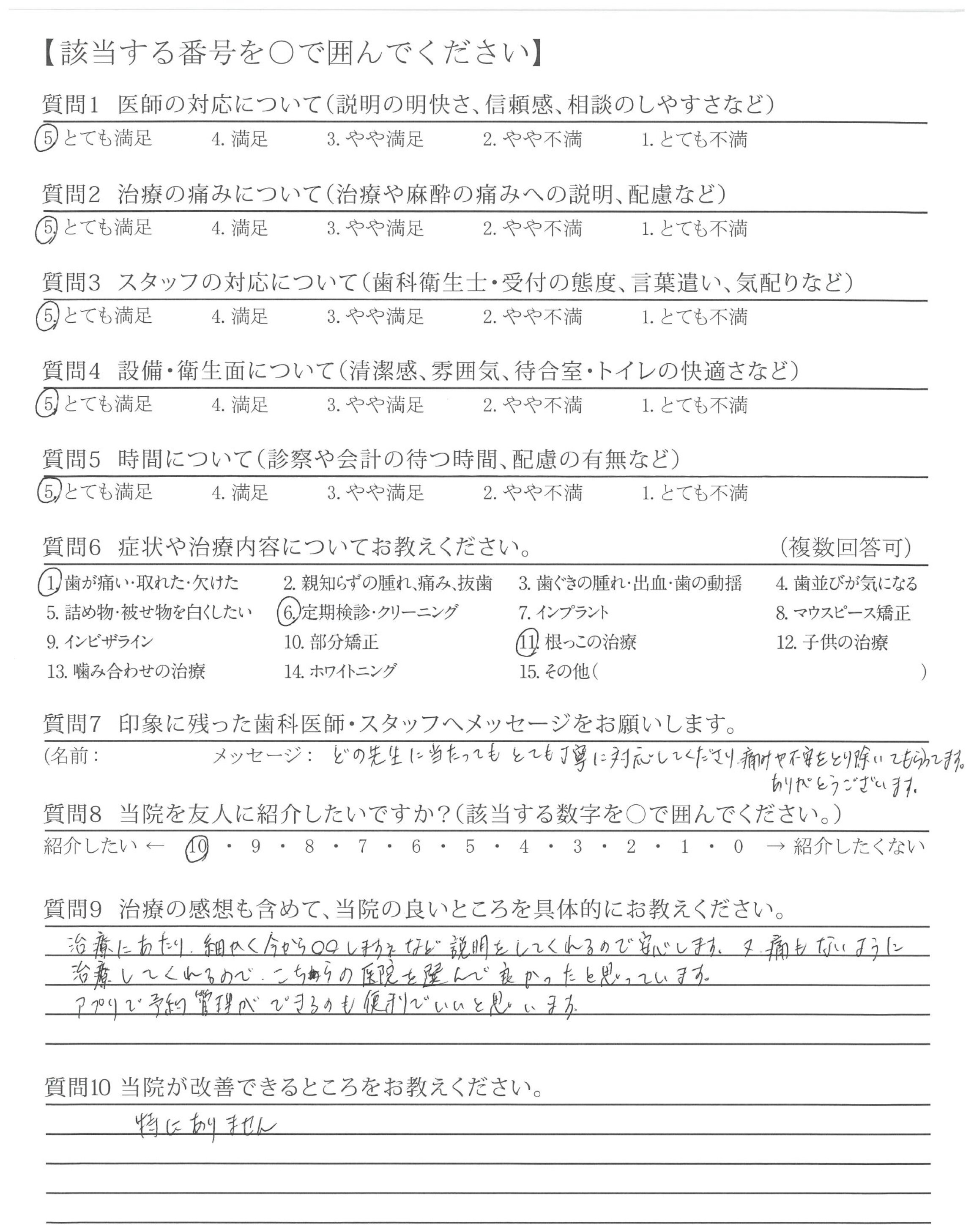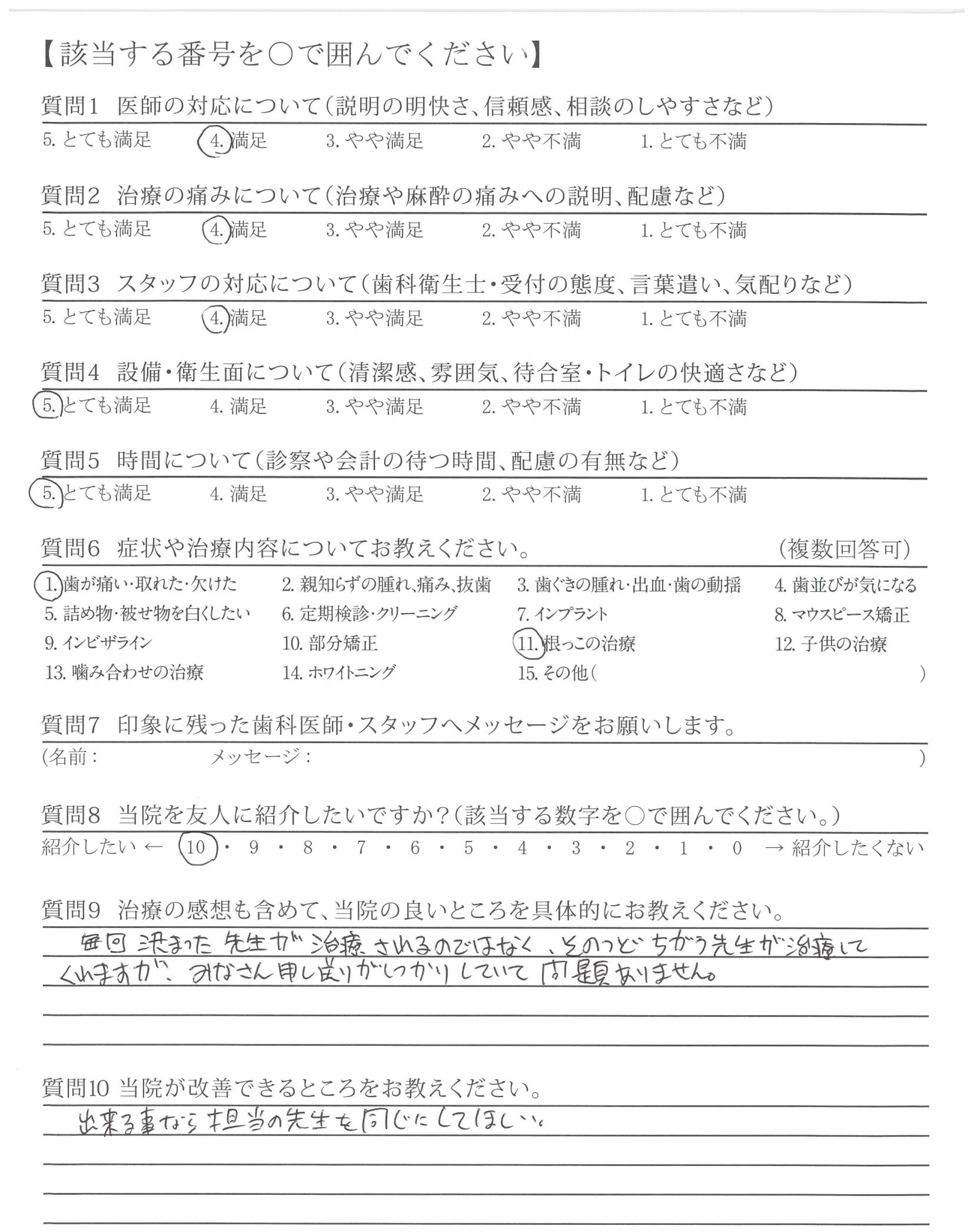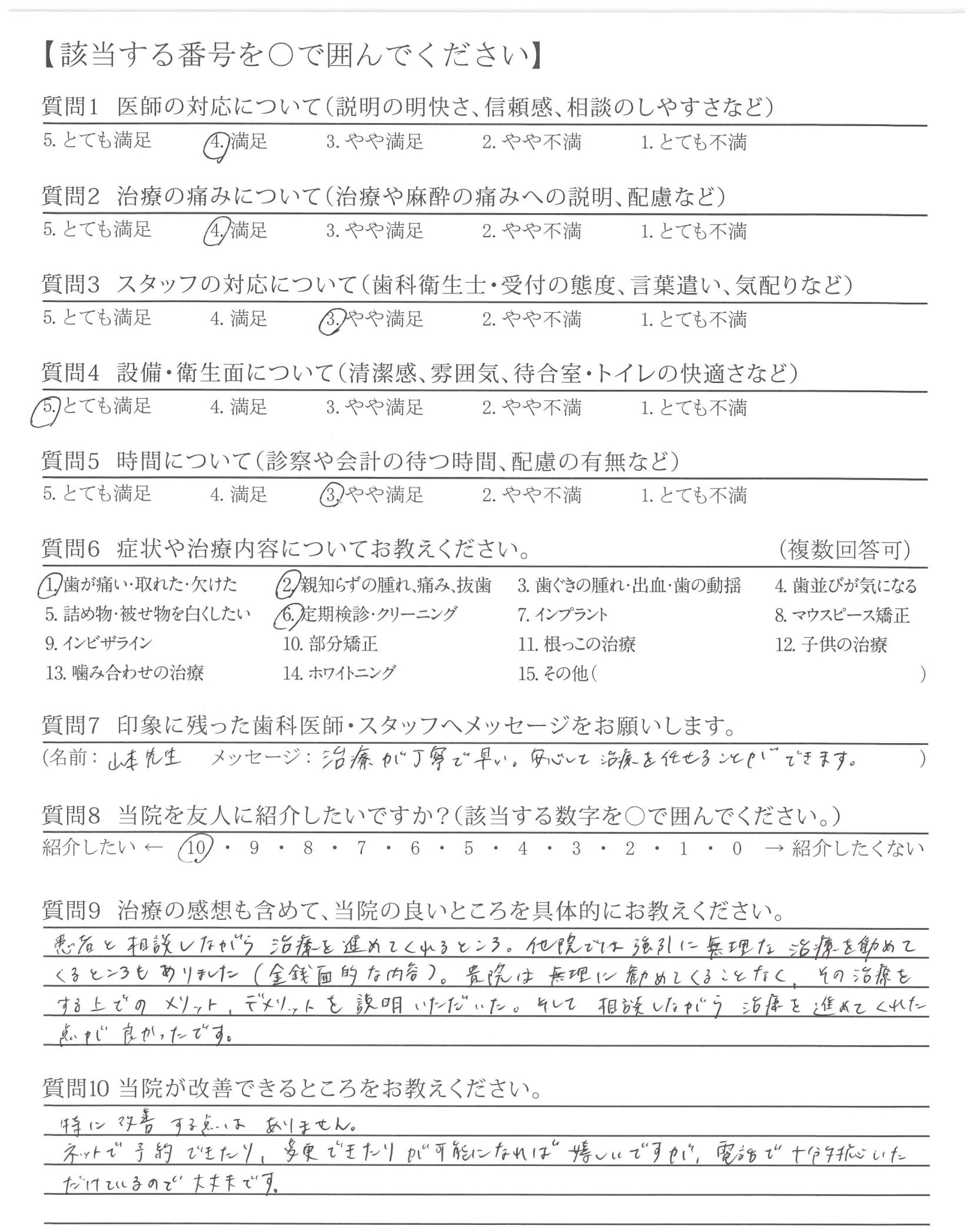 他院では強引に無理な治療を勧めてくるところもありました(金銭面的な内容)。貴院は無理に勧めてくることなく、その治療をする上でのメリット、デメリットを説明いただいた。そして相談しながら治療を進めてくれた点が良かったです。