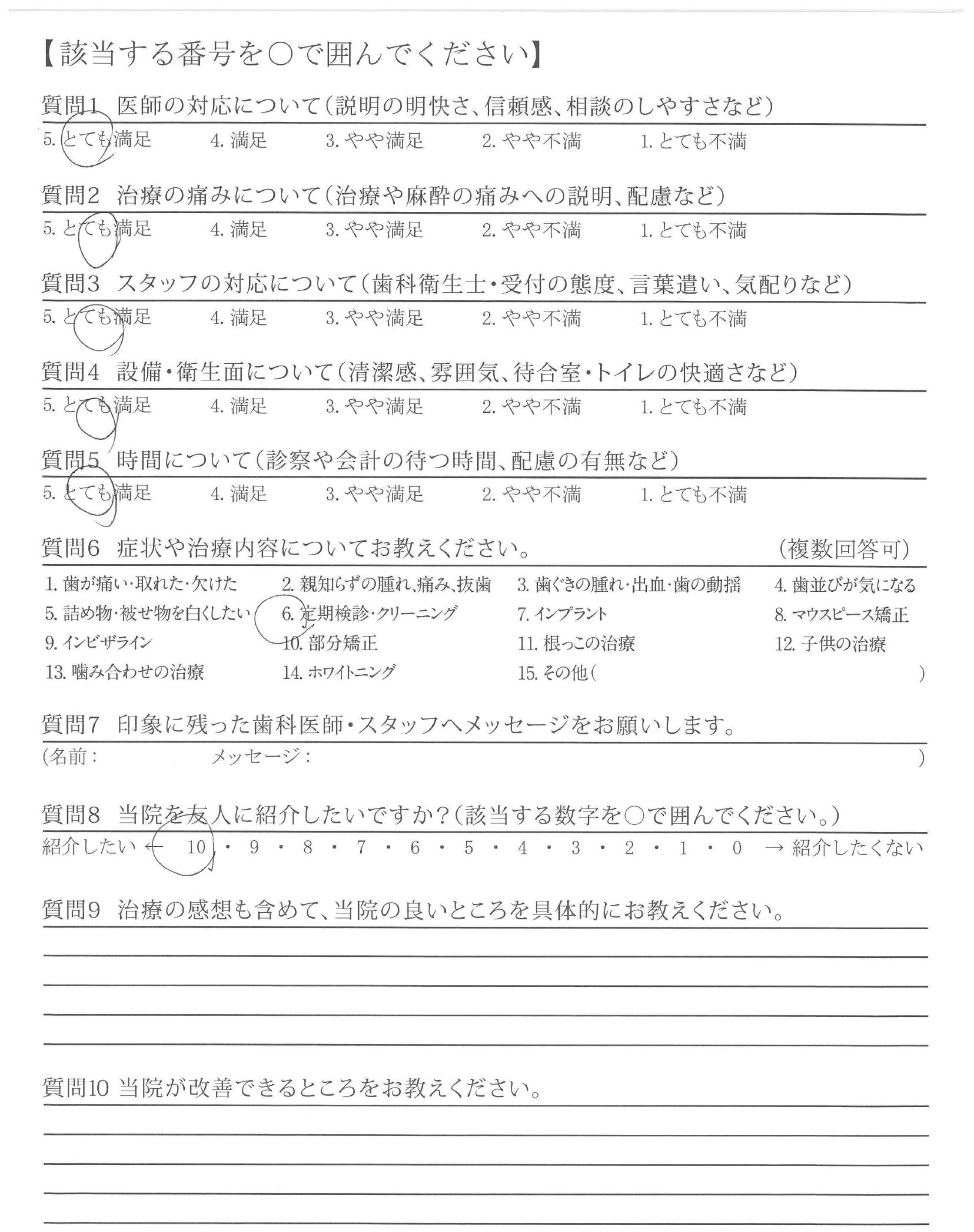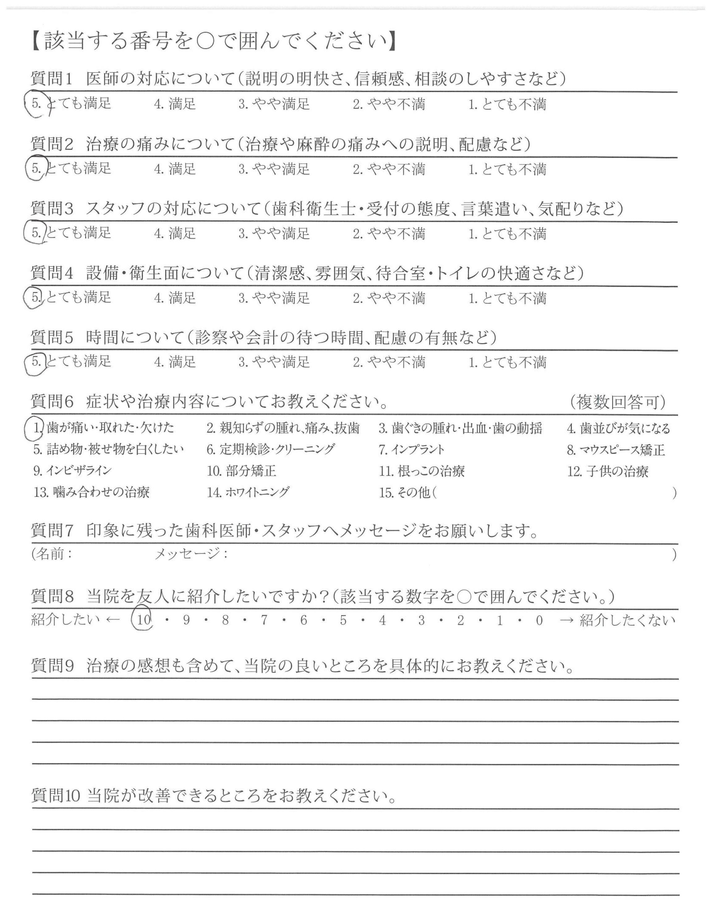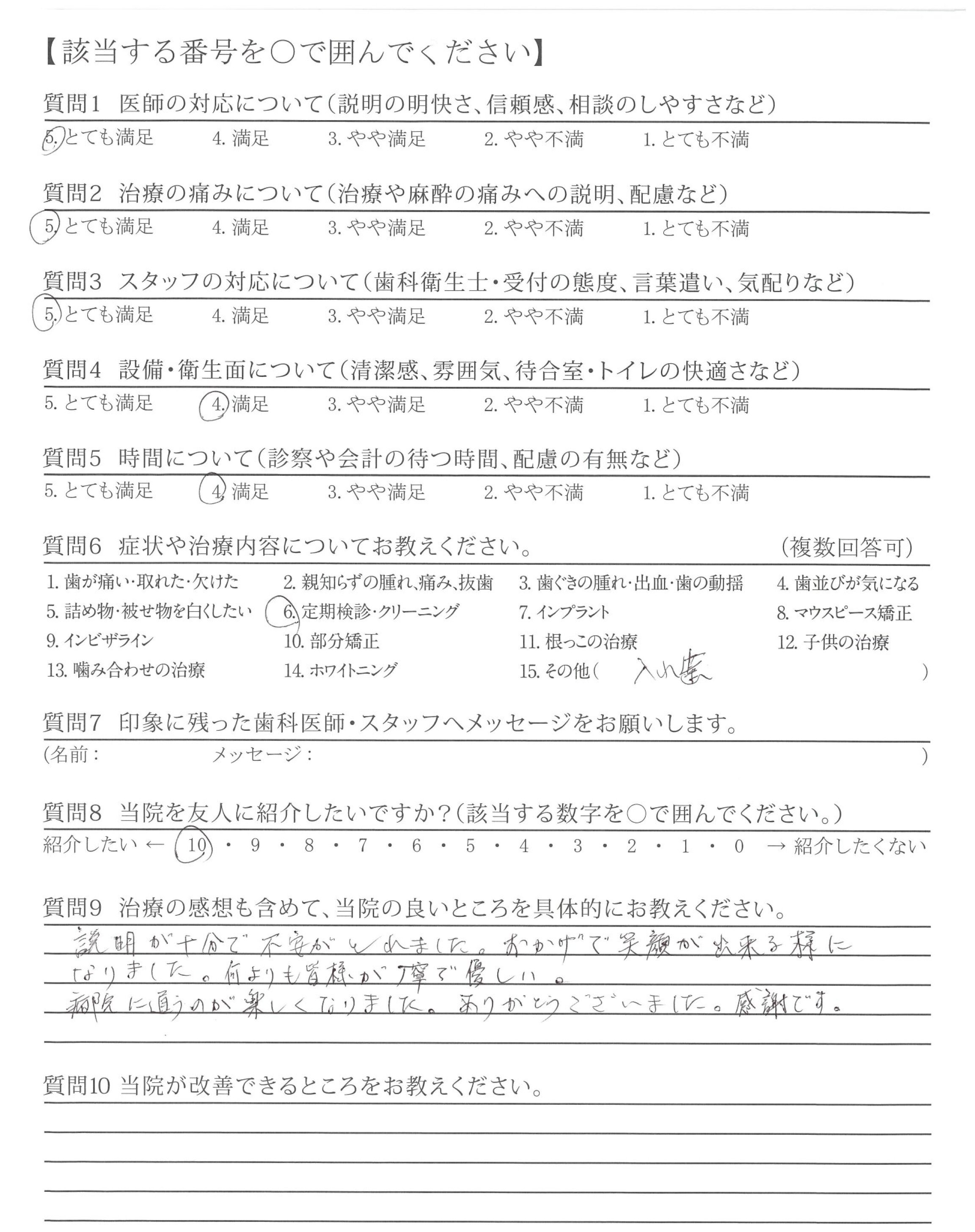他院では強引に無理な治療を勧めてくるところもありました(金銭面的な内容)。貴院は無理に勧めてくることなく、その治療をする上でのメリット、デメリットを説明いただいた。そして相談しながら治療を進めてくれた点が良かったです。