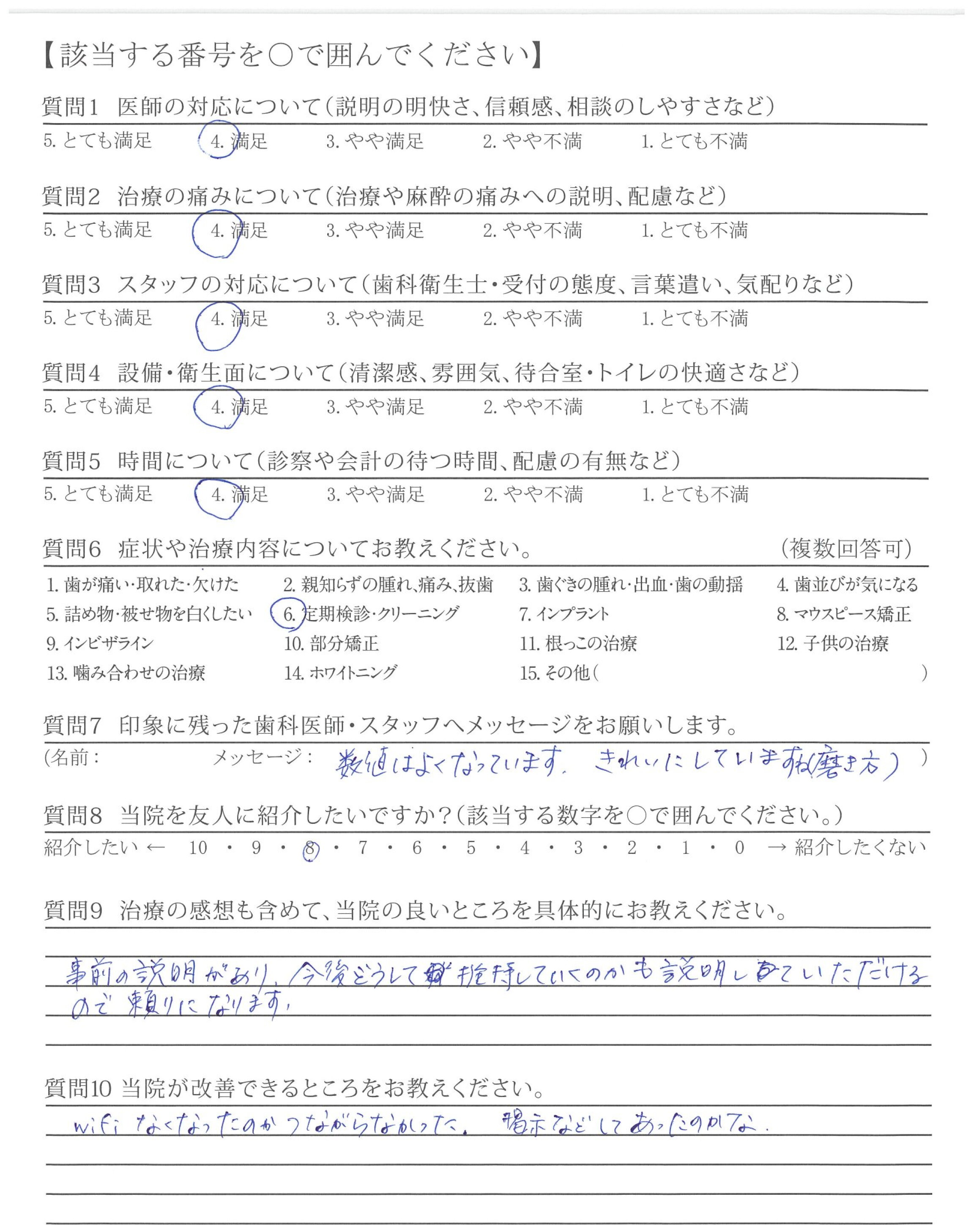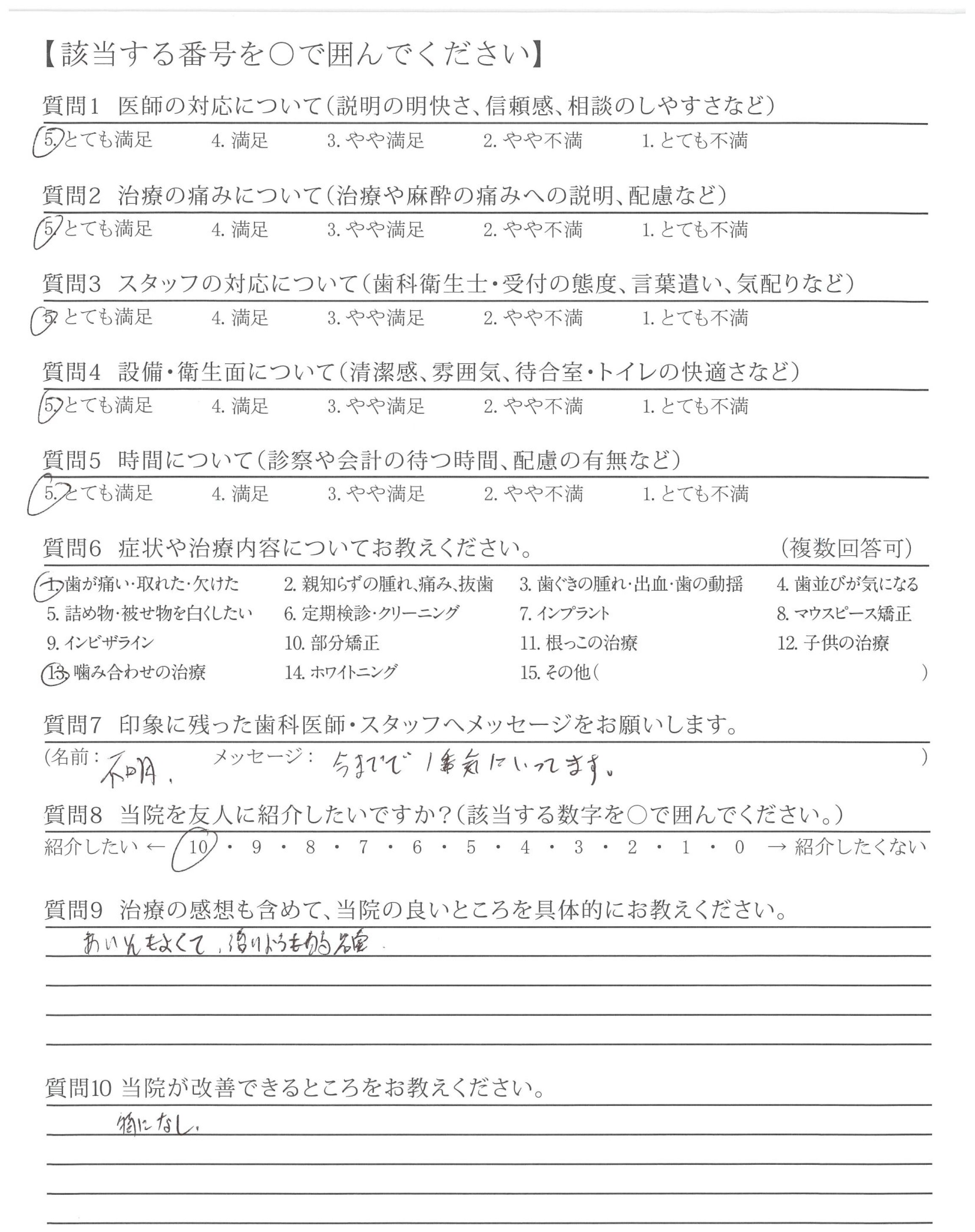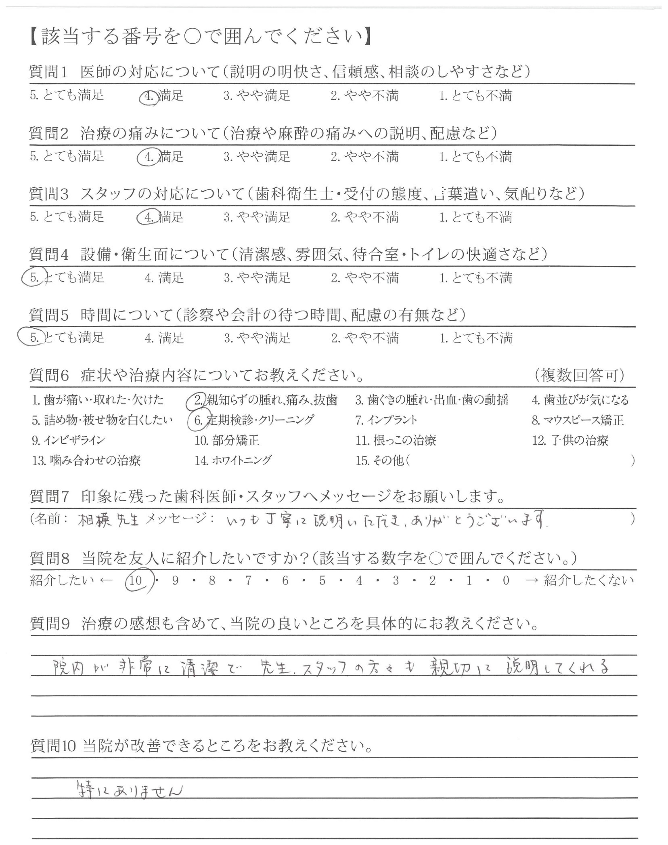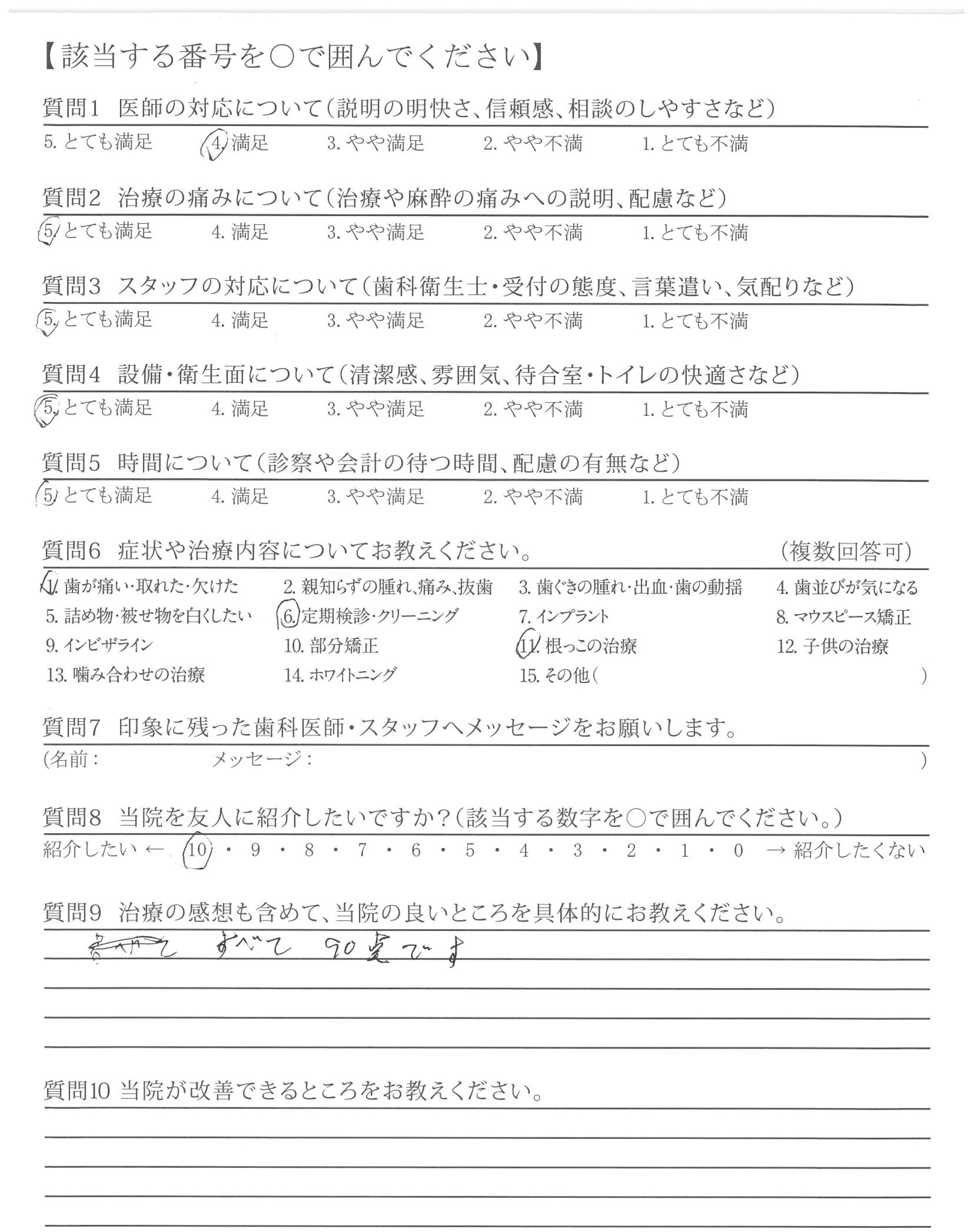 他院では強引に無理な治療を勧めてくるところもありました(金銭面的な内容)。貴院は無理に勧めてくることなく、その治療をする上でのメリット、デメリットを説明いただいた。そして相談しながら治療を進めてくれた点が良かったです。