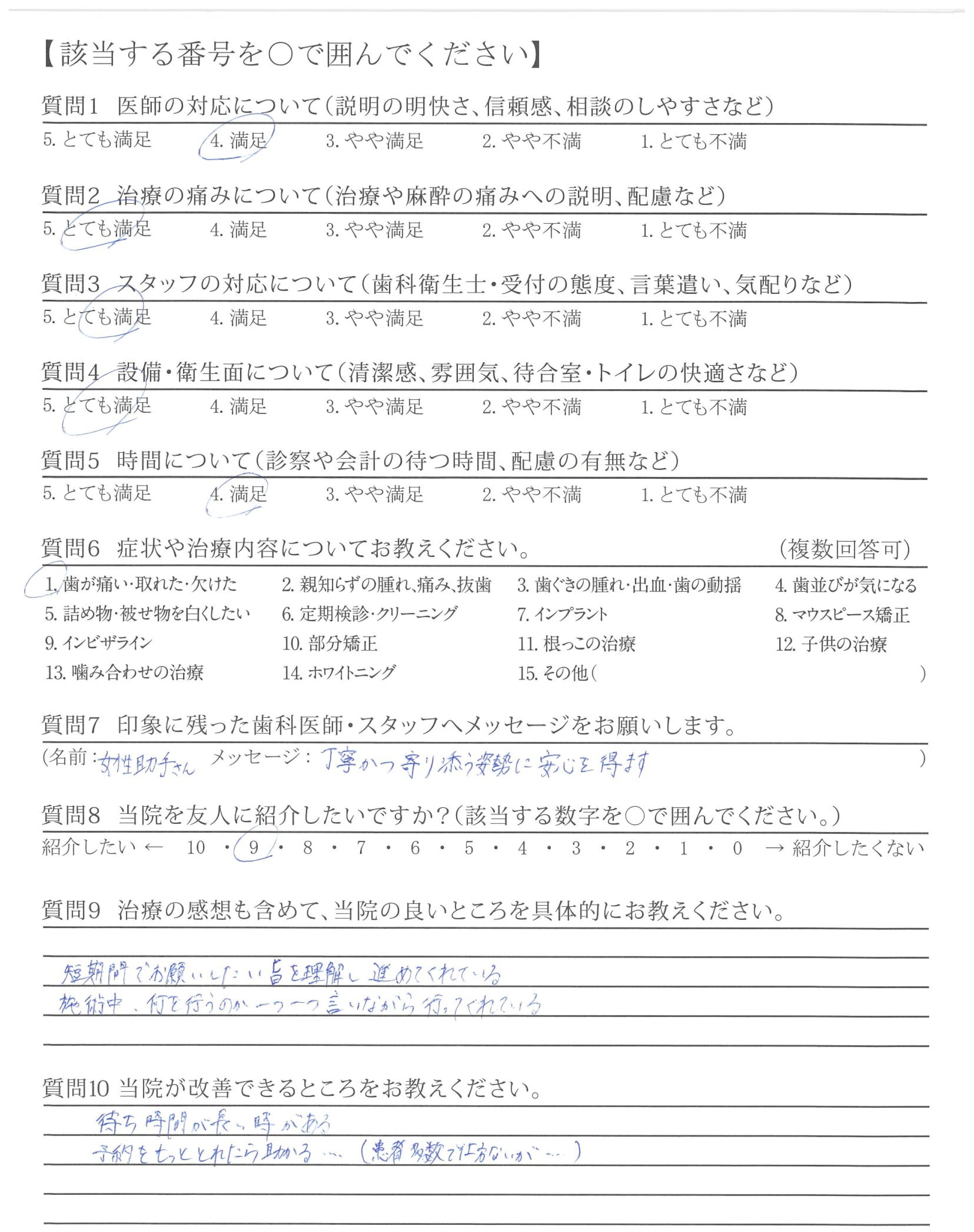 治療にあたり、細かく今から○○しますネなど説明をしてくれるので安心します。又、痛もないように治療してくれるので、こちらの医院を選んで良かったと思っています。