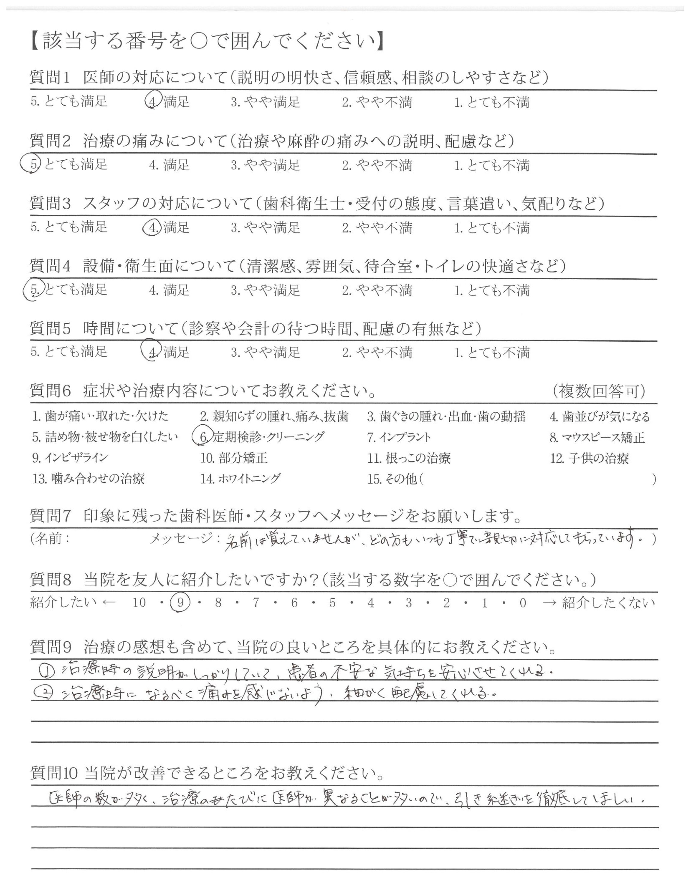 医師の数が多く、治療のたびに医師が異なることが多いので、引き継ぎを徹底してほしい。