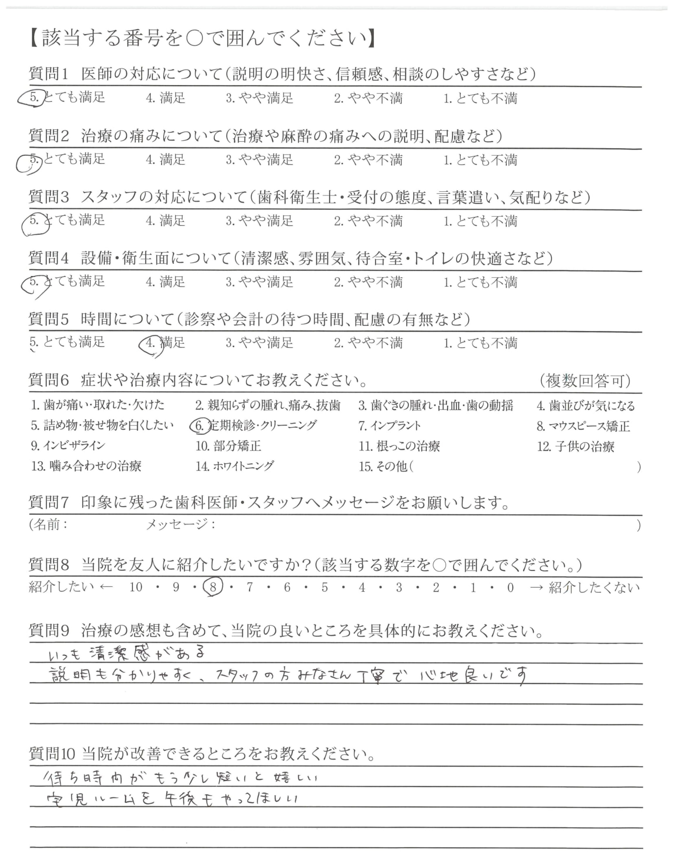 いつも笑顔で、親切、丁寧な対応ありがとうございます。安心して治療に励む事が出来ています。
